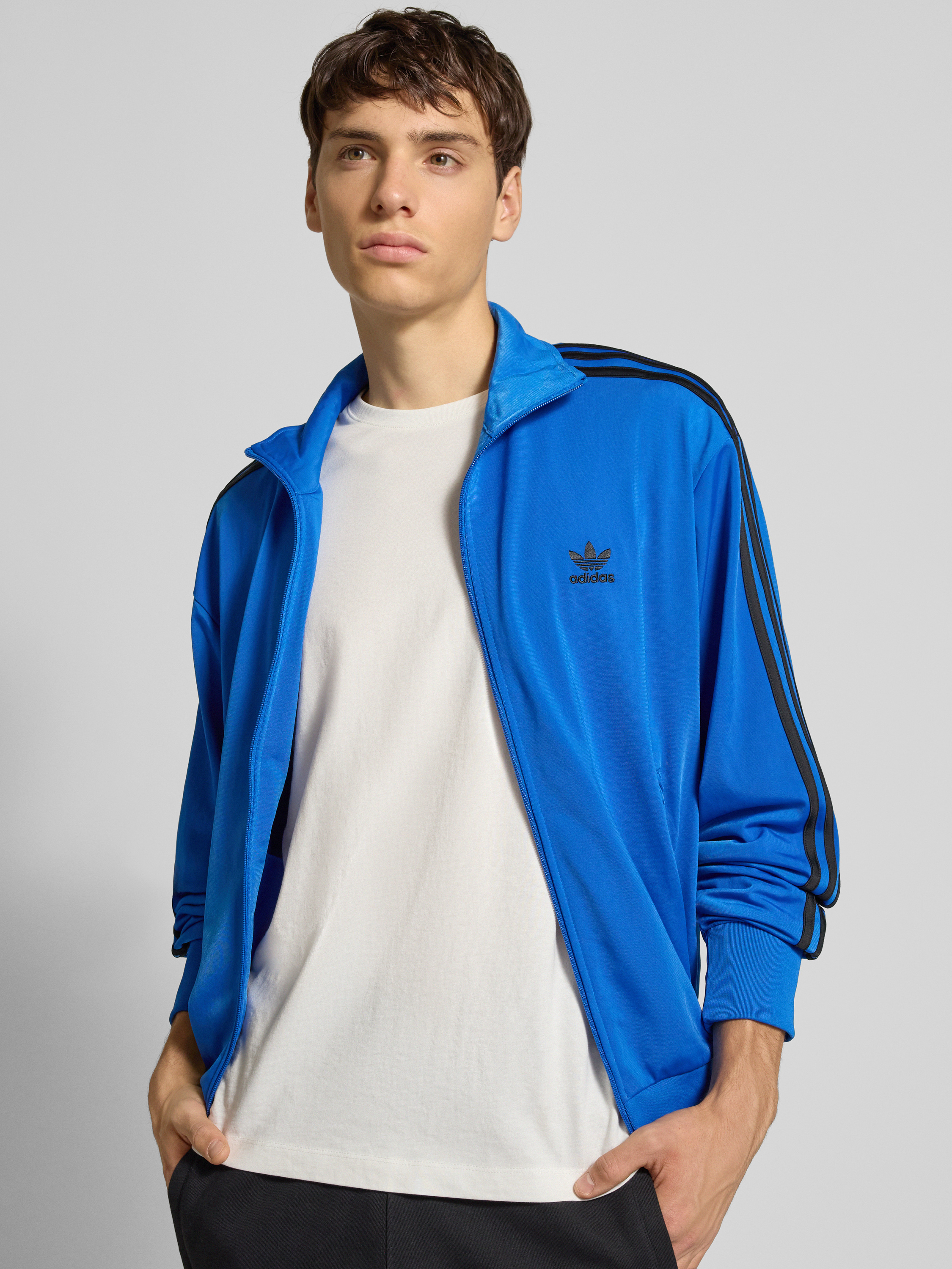 Die Herren Sweatjacke von adidas Originals fällt durch ihren Regular Fit angenehm locker und gerade aus, sodass Bewegungsfreiheit erhalten bleibt. Ein Stehkragen sorgt für eine sportliche Note und schützt an kühleren Tagen den Halsbereich. Dezentes Label-Stitching unterstreicht den lässigen Stil, während praktische Reißverschlusstaschen Platz für Kleinigkeiten schaffen.