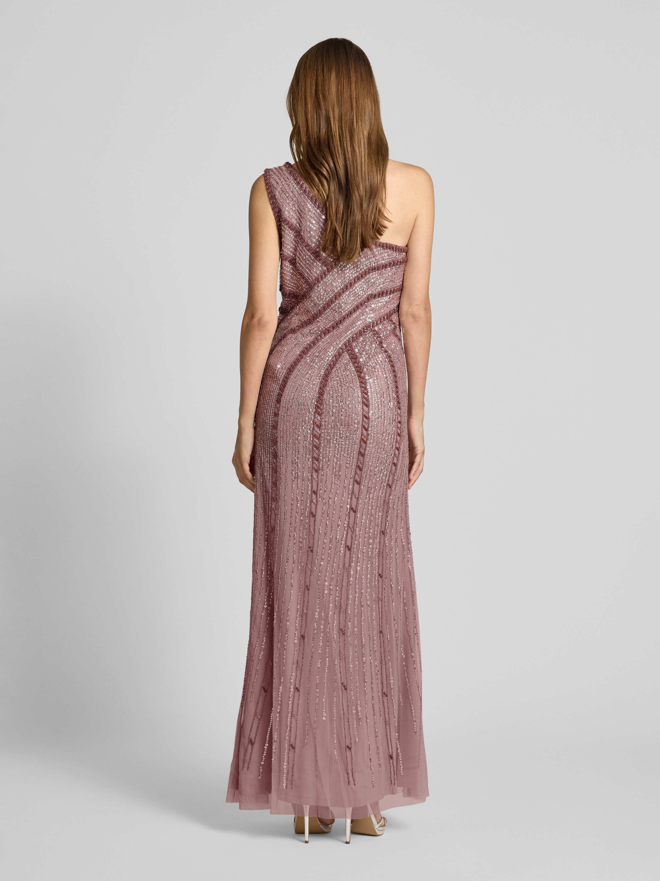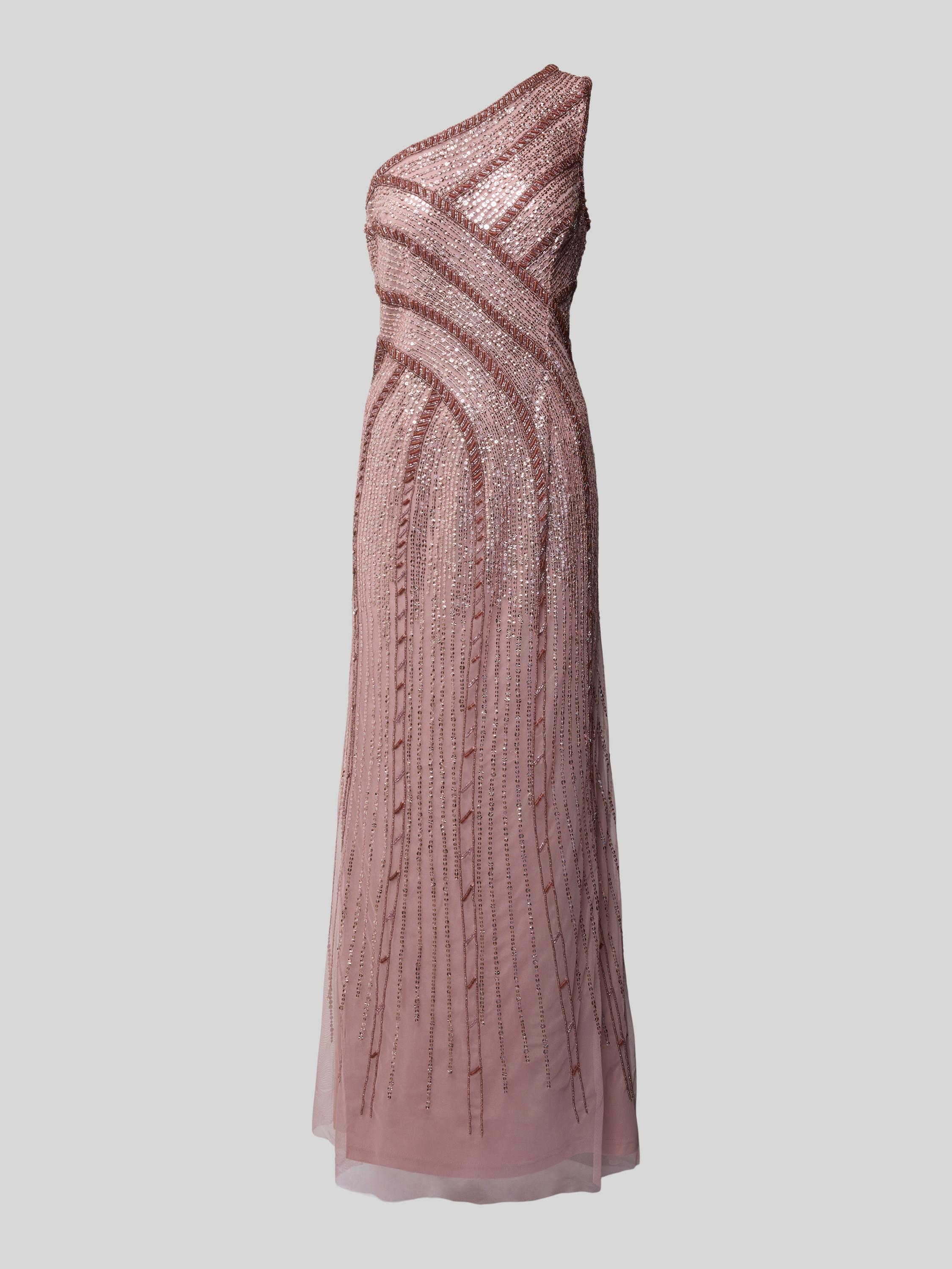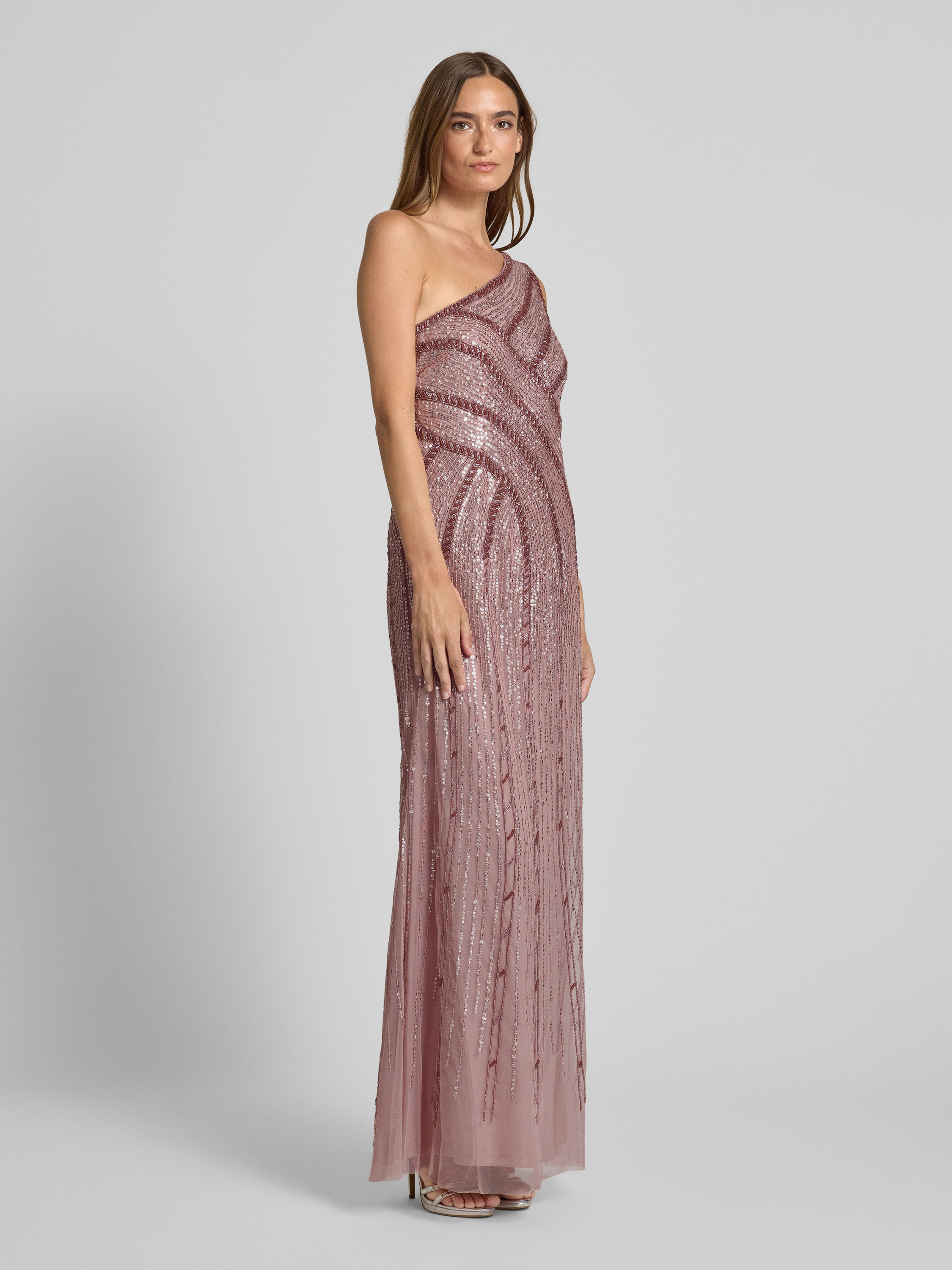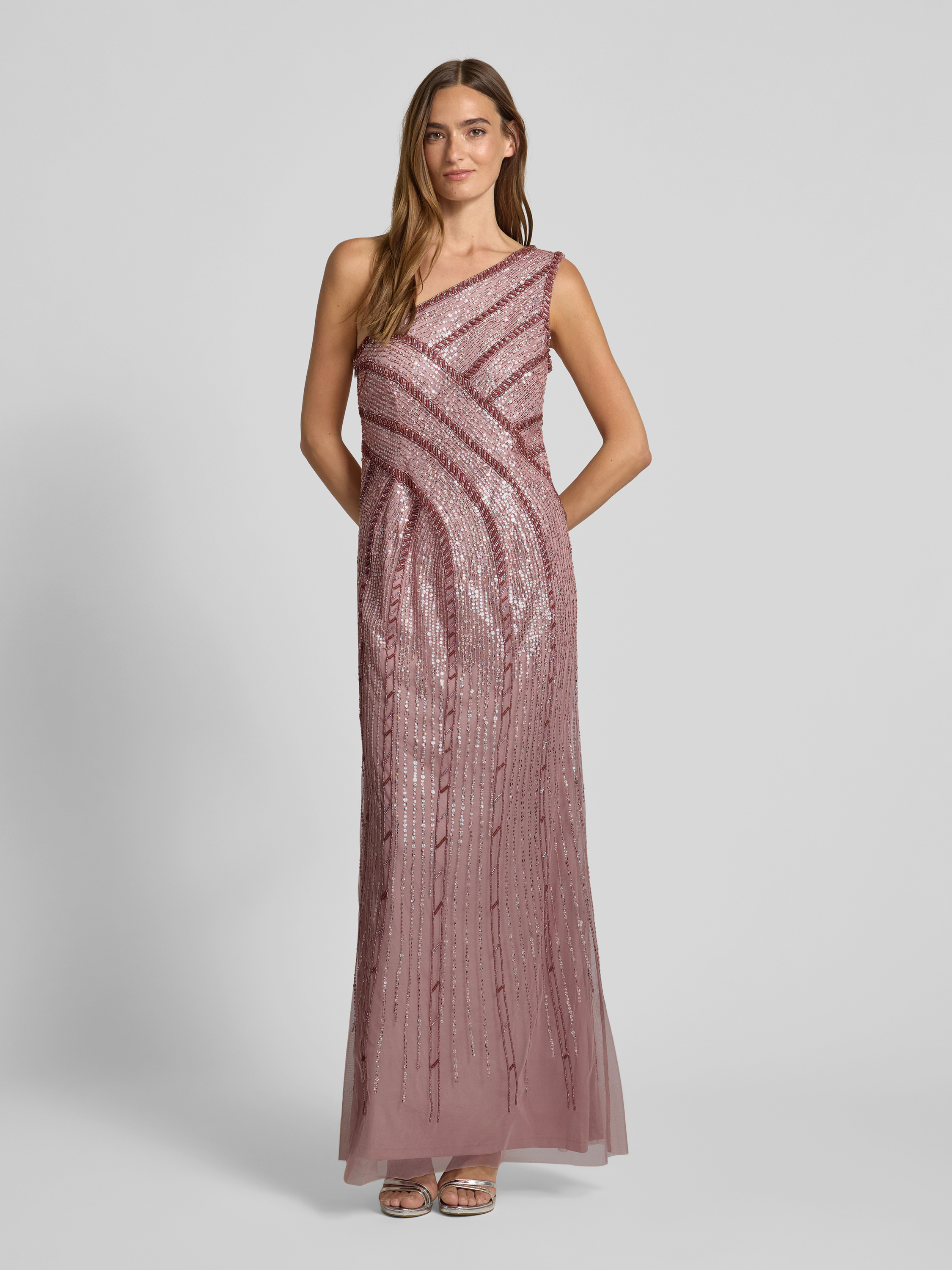 Das Abendkleid von Adrianna Papell zeichnet sich durch eine elegant taillierte Passform aus, die eine leichte A-Linie betont. Mit seinem funkelnden Glitzer-Mesh und dem raffinierten One-Shoulder-Design zieht es Blicke auf sich. Pailletten setzen glanzvolle Akzente für besondere Anlässe.
