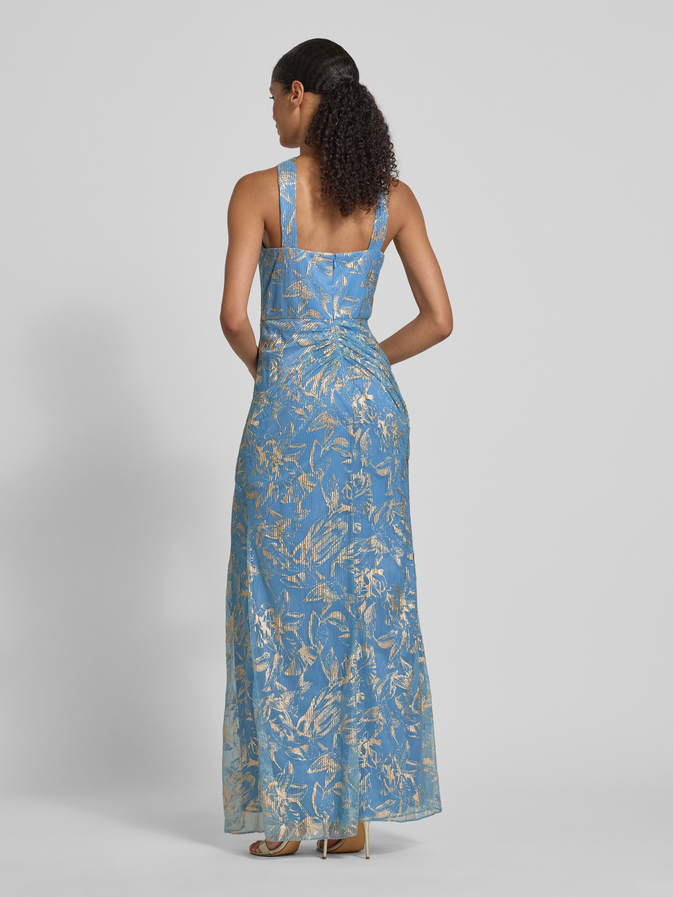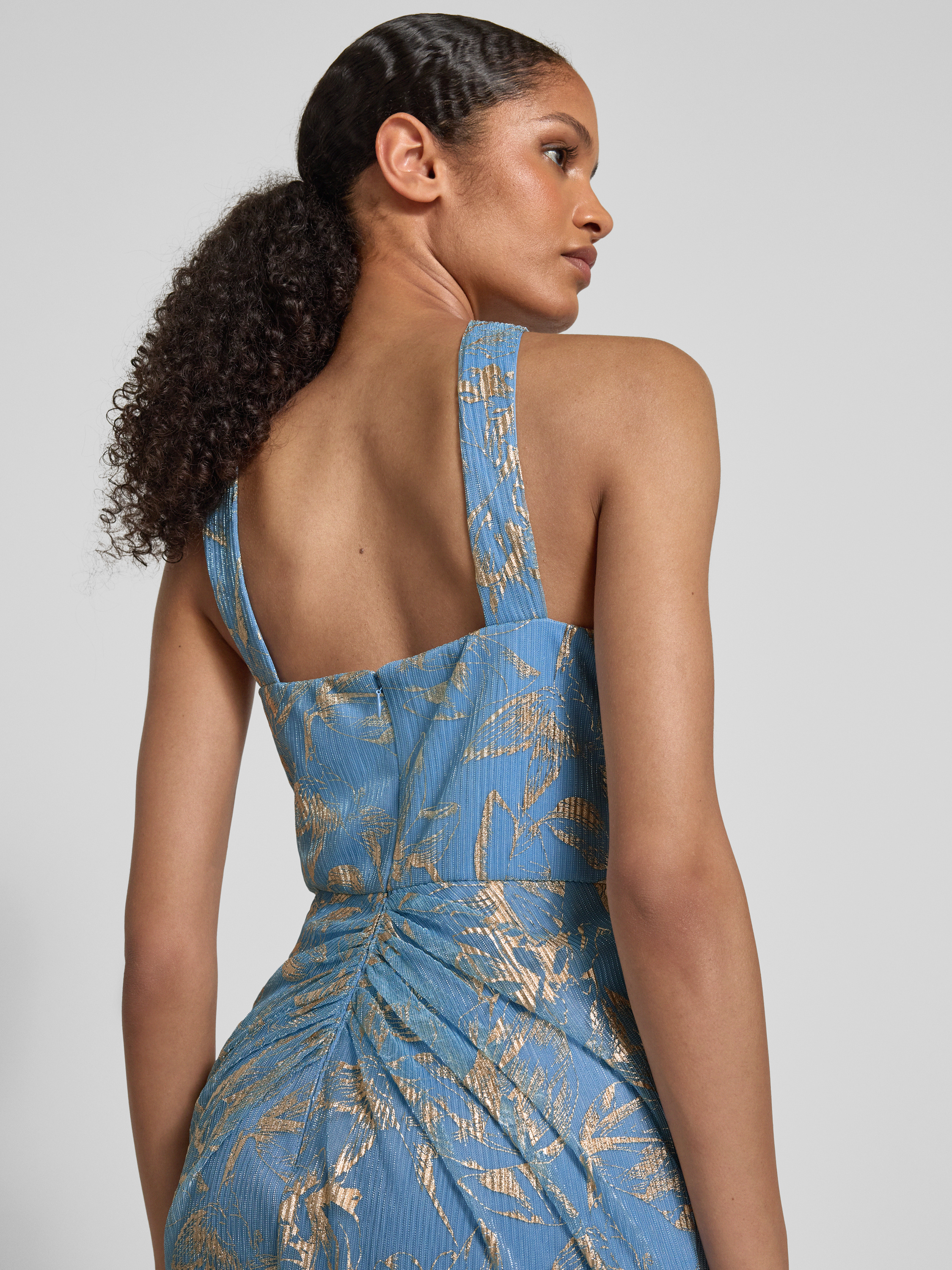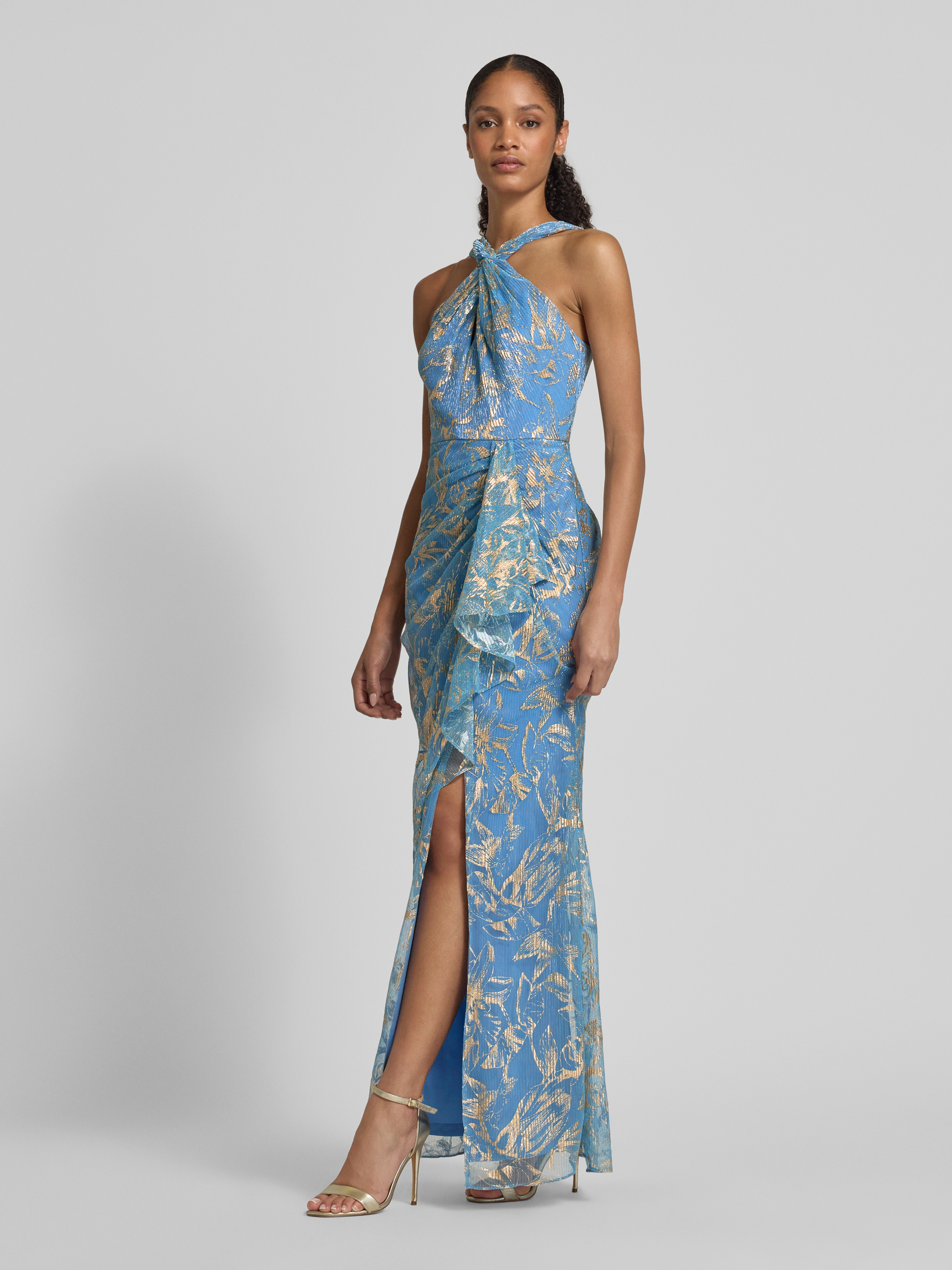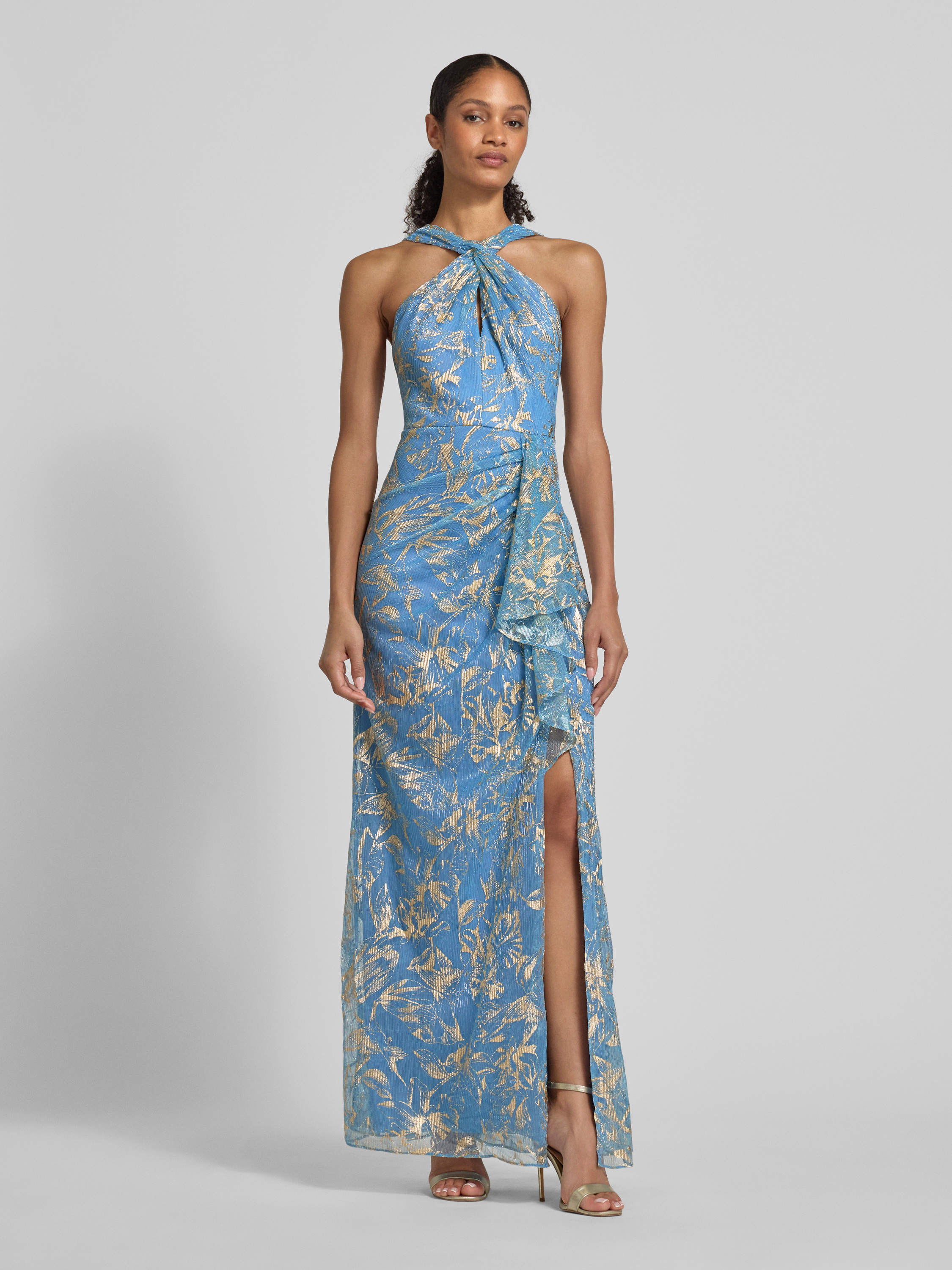Das Maxikleid von Adrianna Papell vereint Eleganz mit einem geraden Schnitt, der fließend die Figur umschmeichelt. Das subtile Knotendetail im Vorderteil setzt einen stilvollen Akzent, während die Volants sanft schwingen und Bewegung verleihen. Ideal für besondere Anlässe, bei denen Komfort und Stil harmonieren.