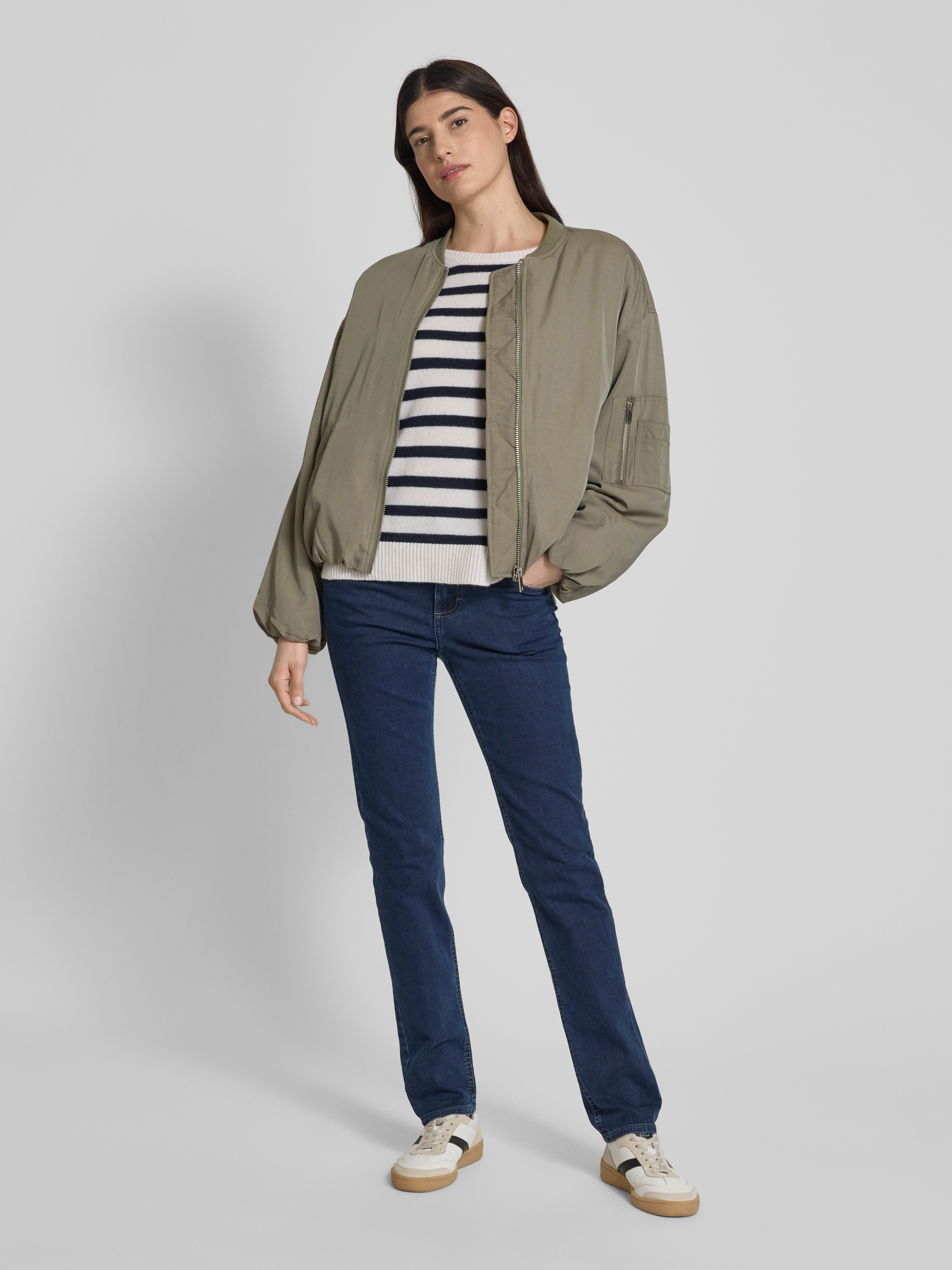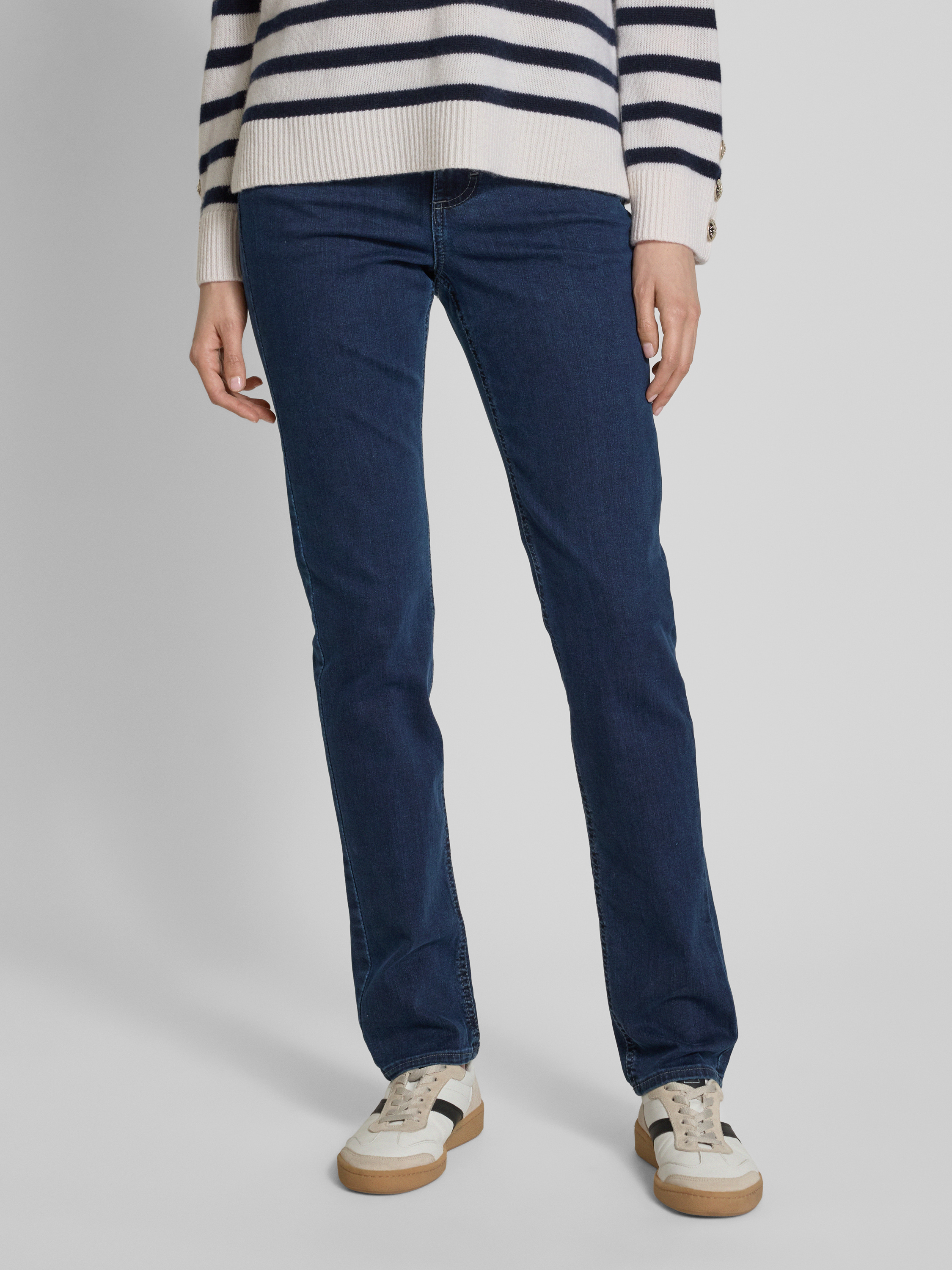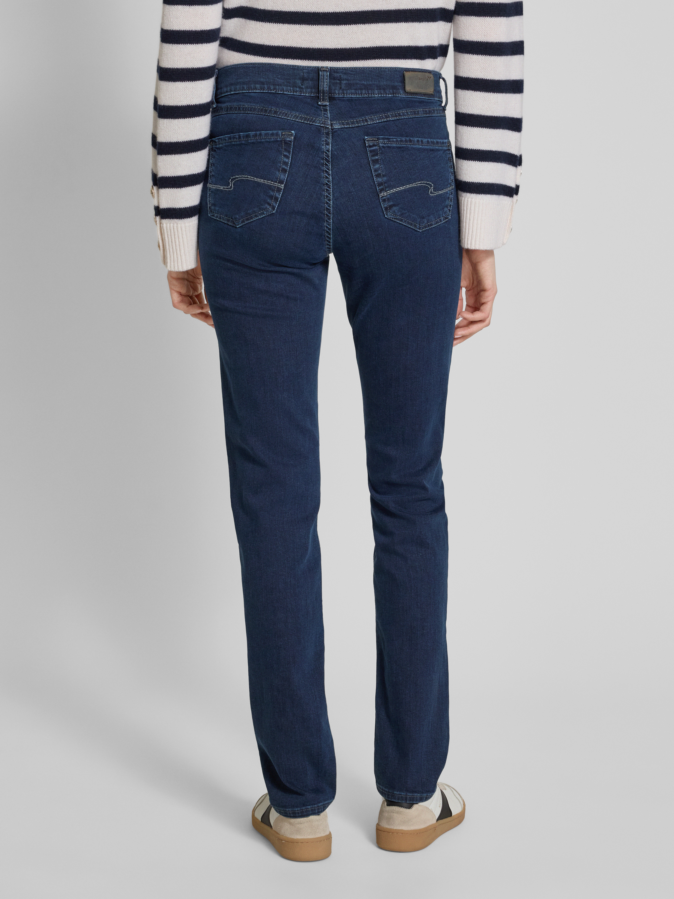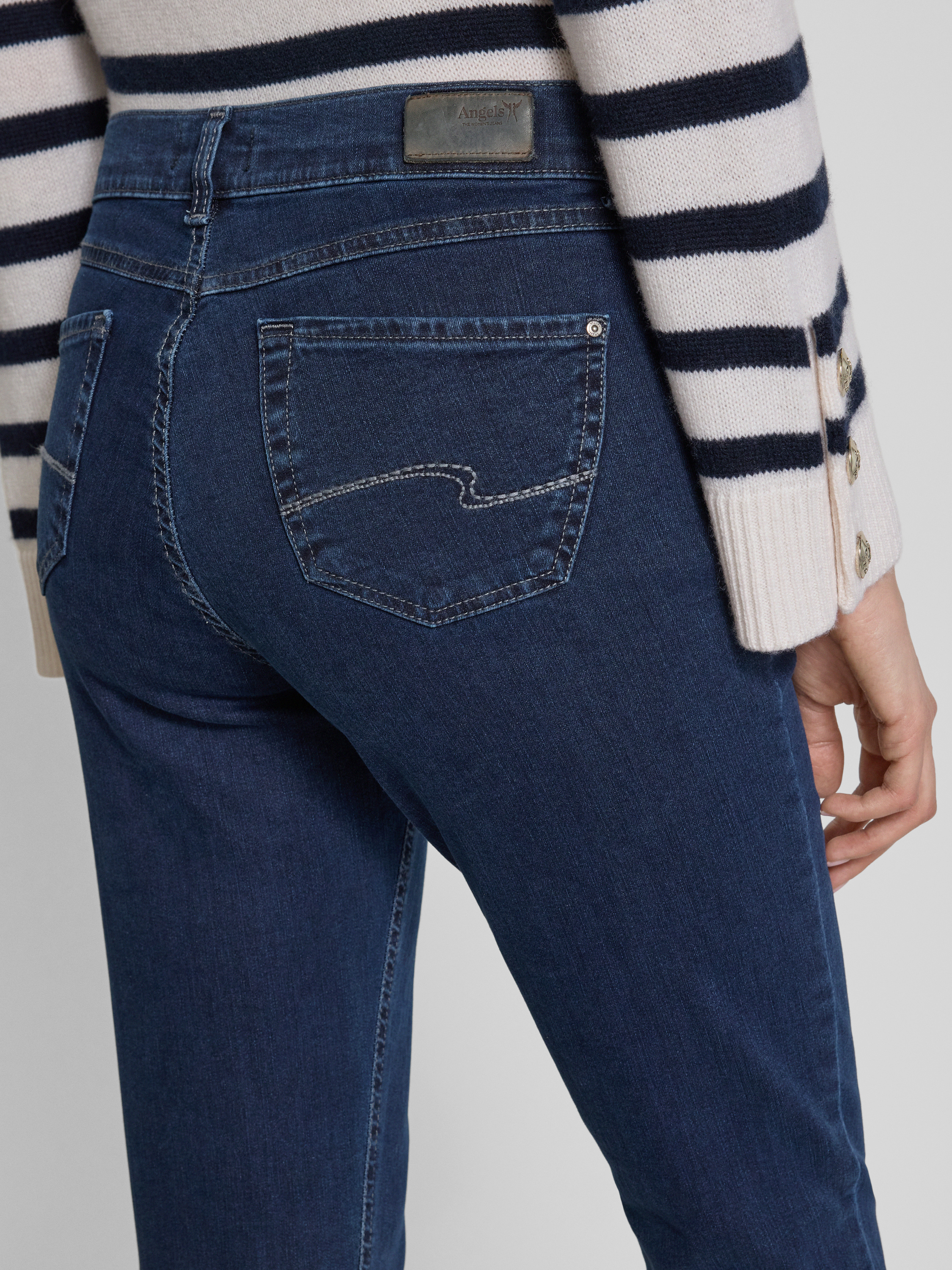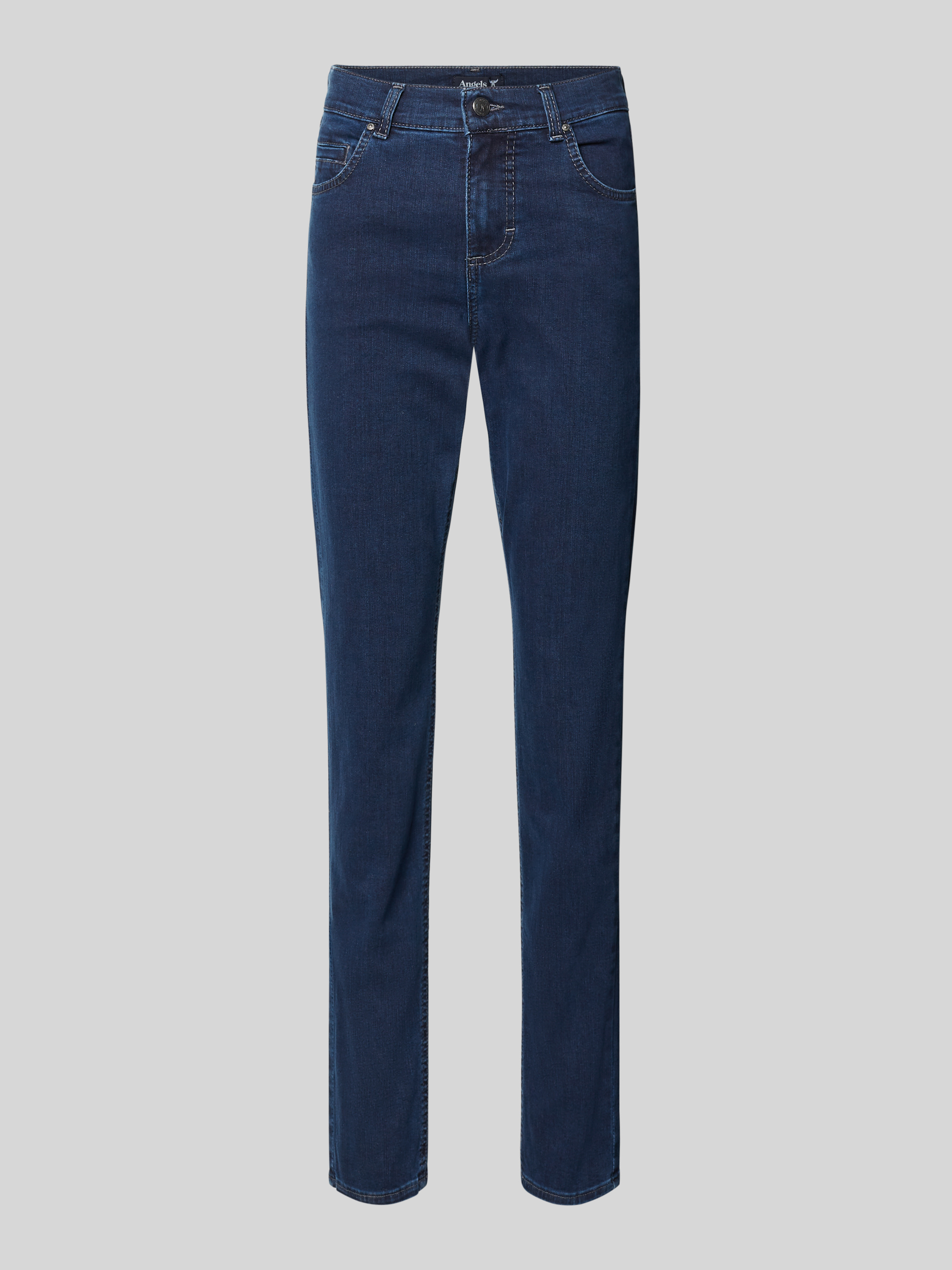 Die Angels Straight Fit Jeans Modell 'CICI' sitzt durch ihren geraden Schnitt angenehm und sorgt für eine entspannte Silhouette im Alltag. Dank des Baumwoll-Mix mit Stretch-Anteil passt sich das Material flexibel an verschiedene Bewegungen an. Das klassische 5-Pocket-Design unterstreicht die vielseitige Tragbarkeit.