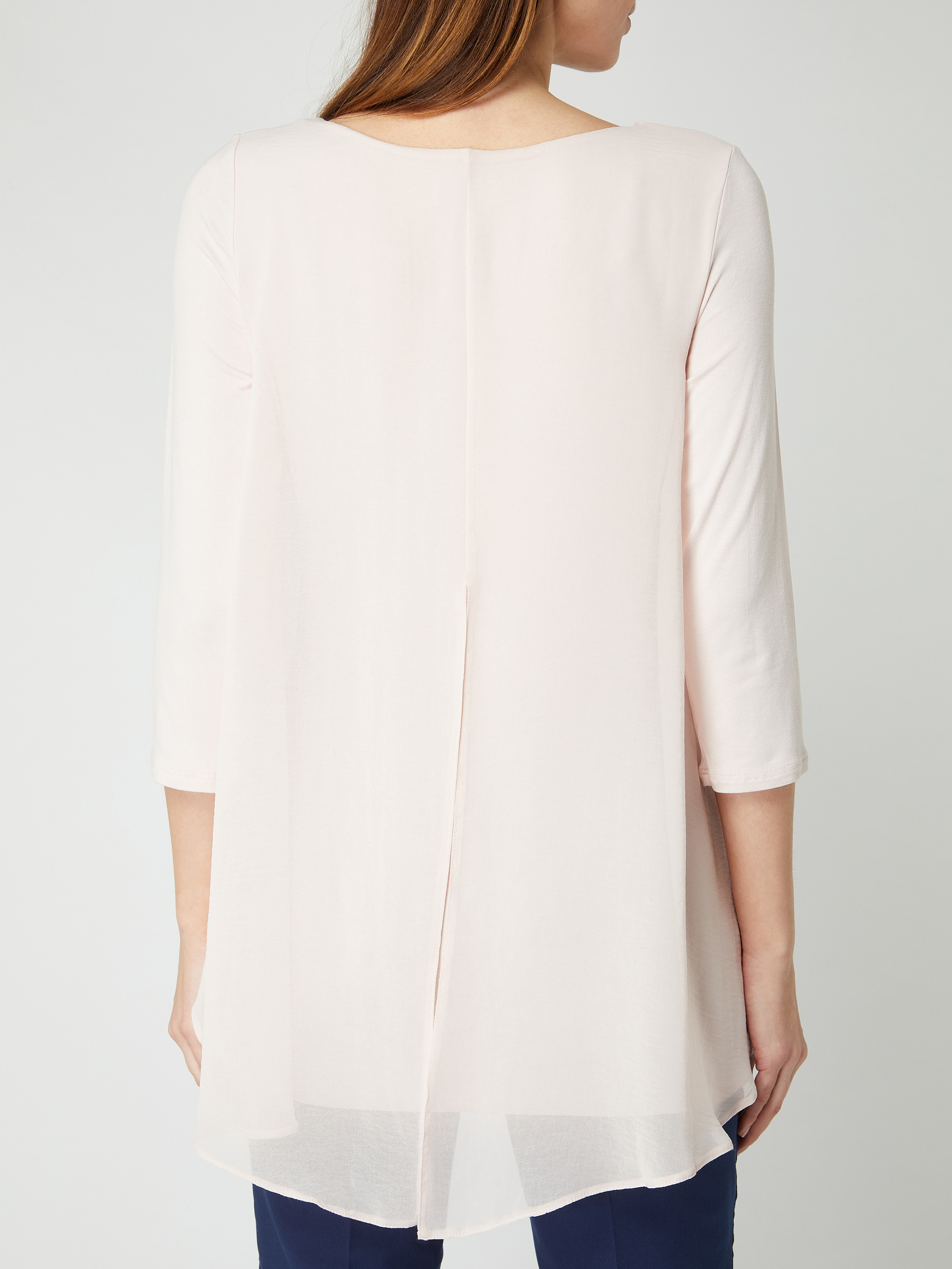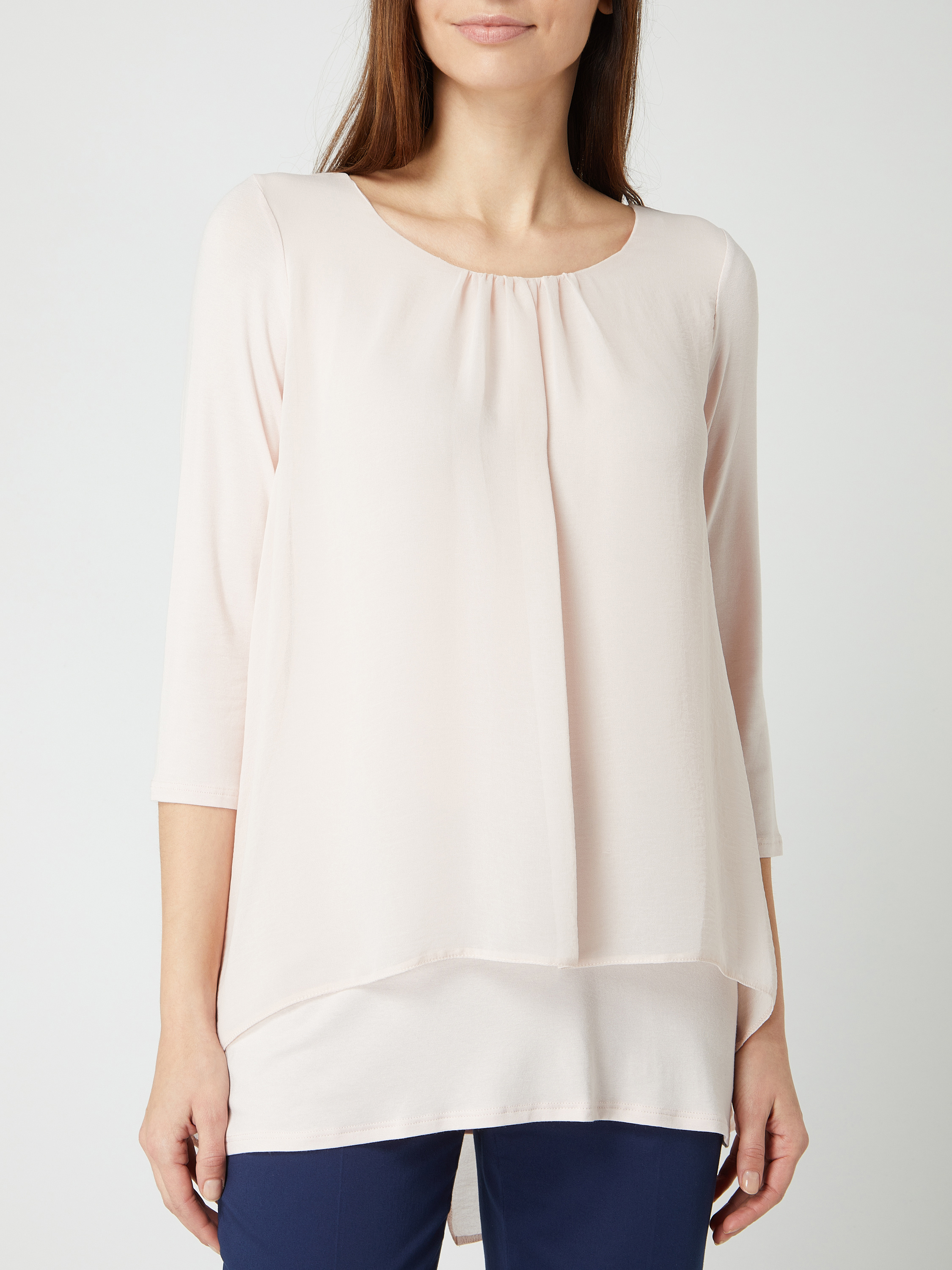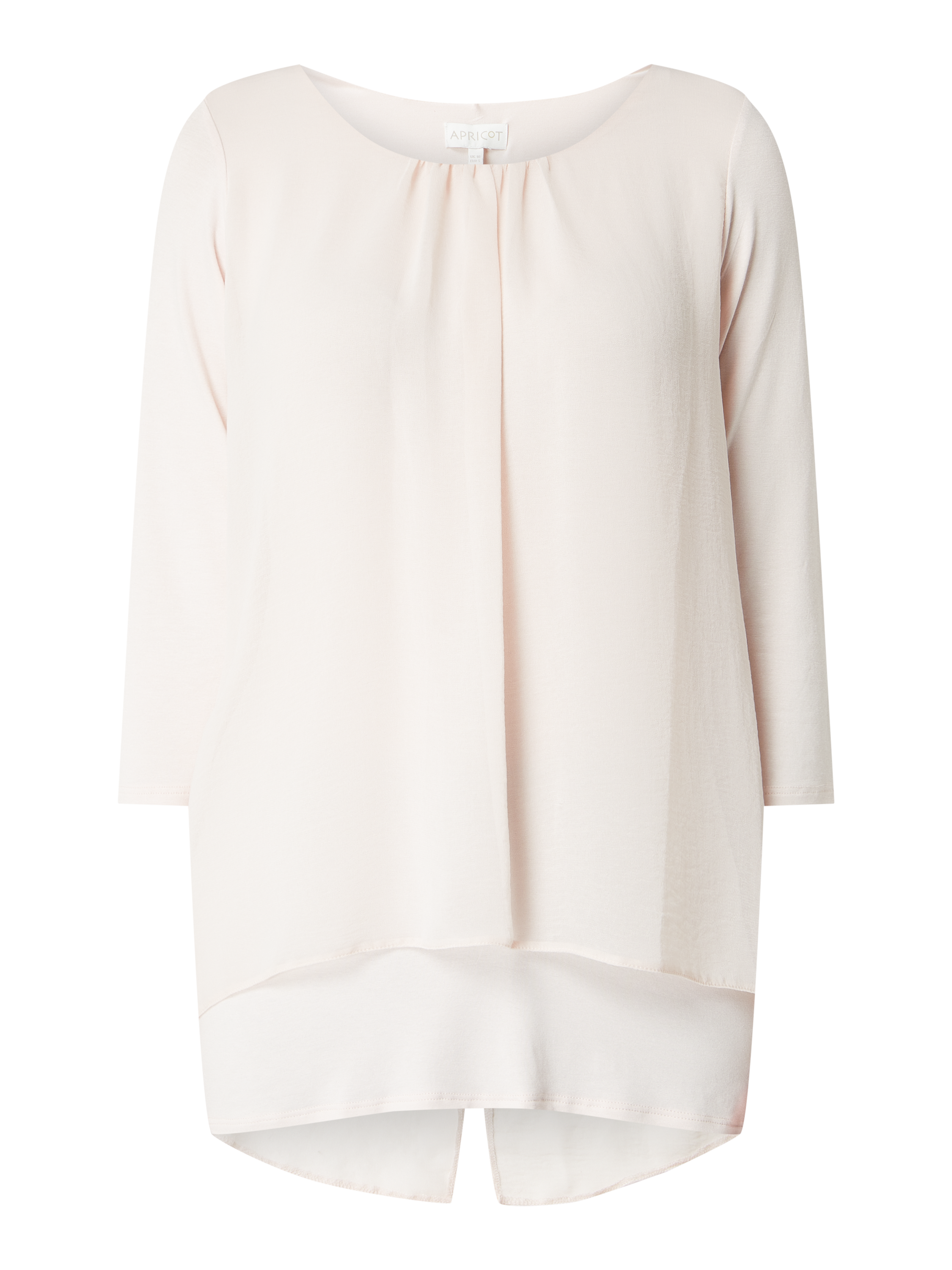 Das Damen Shirt von Apricot im Double Layer Look kombiniert einen weich fließenden Viskose-Elasthan-Mix mit einer kontrastierenden Kreppvorderseite. Der leicht ausgestellte Schnitt und der Rundhalsausschnitt schaffen eine lockere Silhouette, die durch Dreiviertelärmel ergänzt wird. Eine Kette in Gold-Optik rundet das Design stilvoll ab.