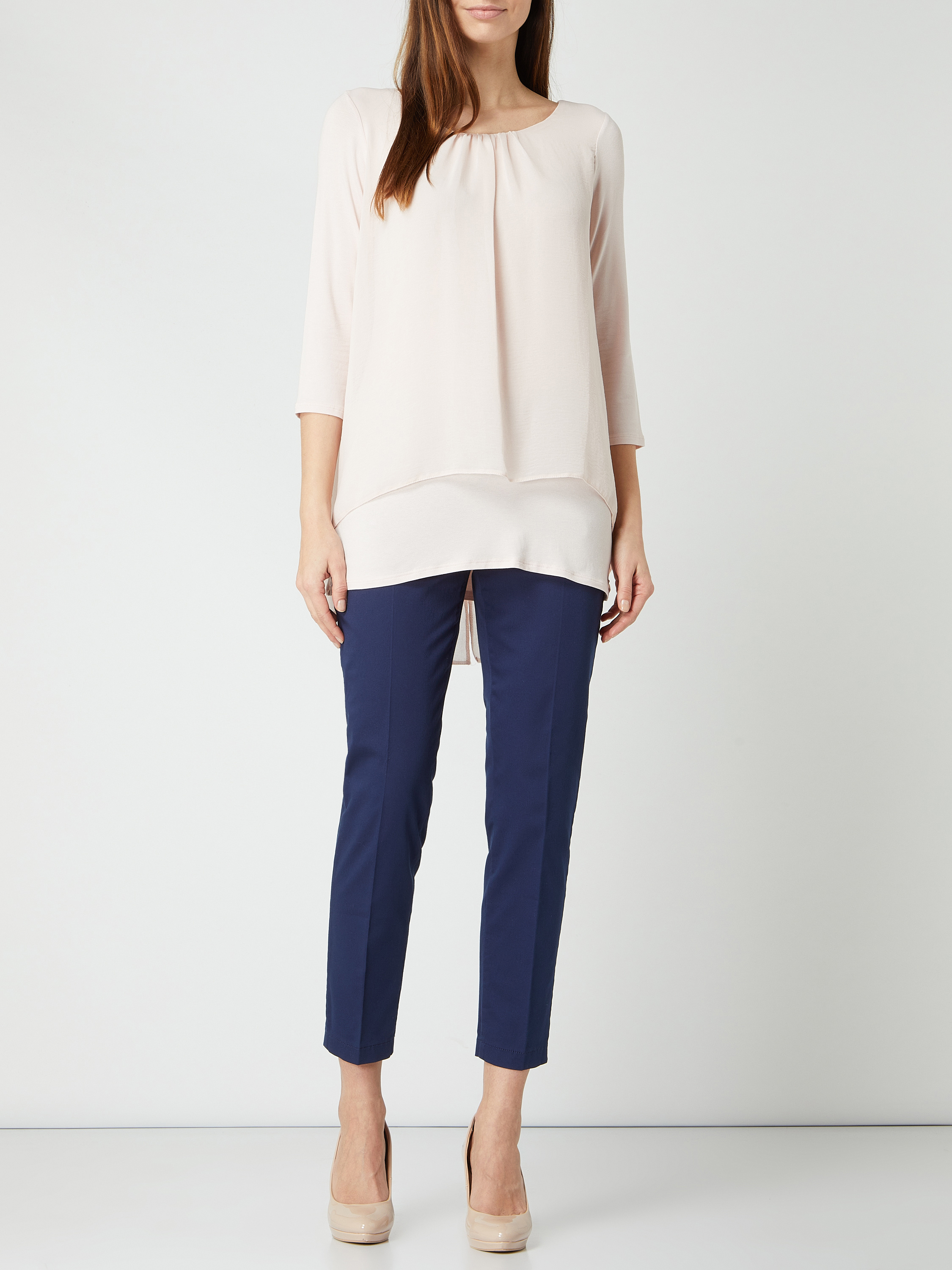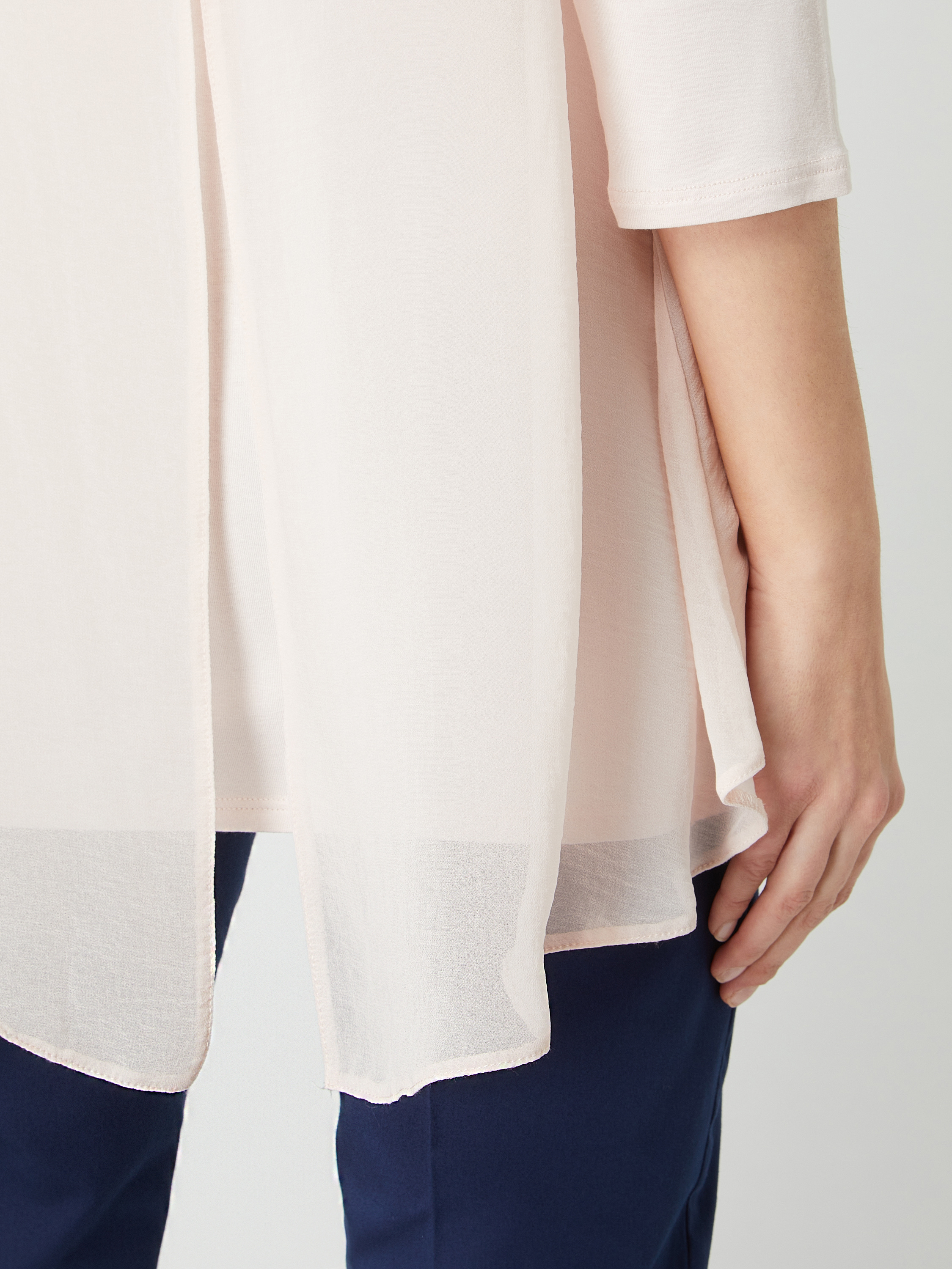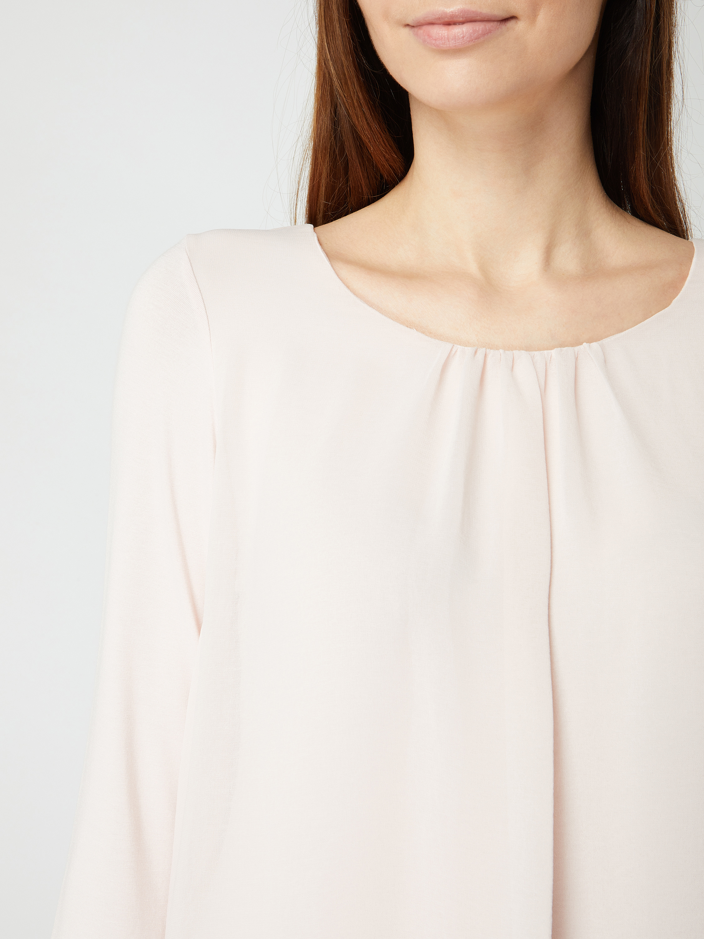 Das Damen Shirt von Apricot im Double Layer Look kombiniert einen weich fließenden Viskose-Elasthan-Mix mit einer kontrastierenden Kreppvorderseite. Der leicht ausgestellte Schnitt und der Rundhalsausschnitt schaffen eine lockere Silhouette, die durch Dreiviertelärmel ergänzt wird. Eine Kette in Gold-Optik rundet das Design stilvoll ab.