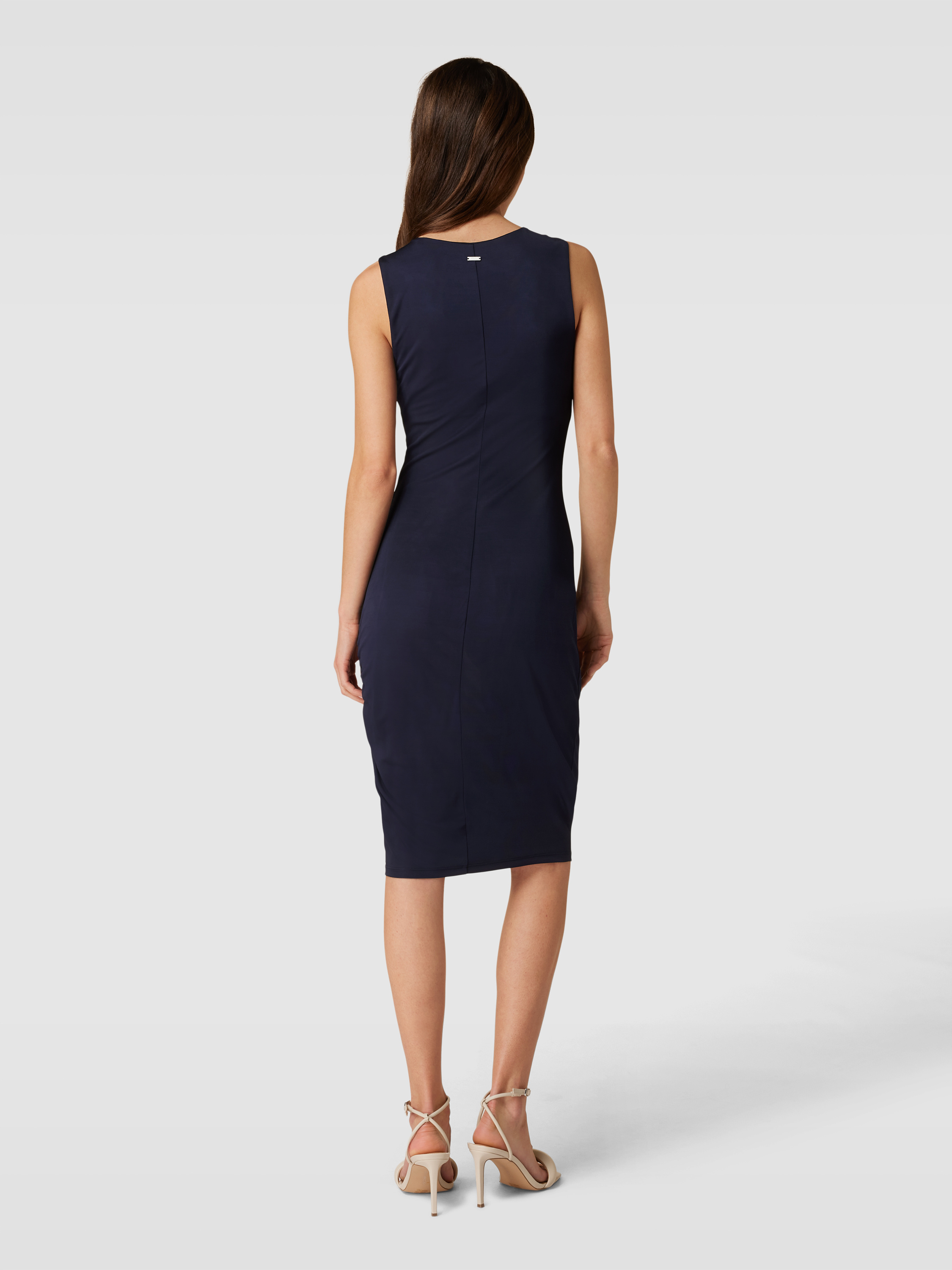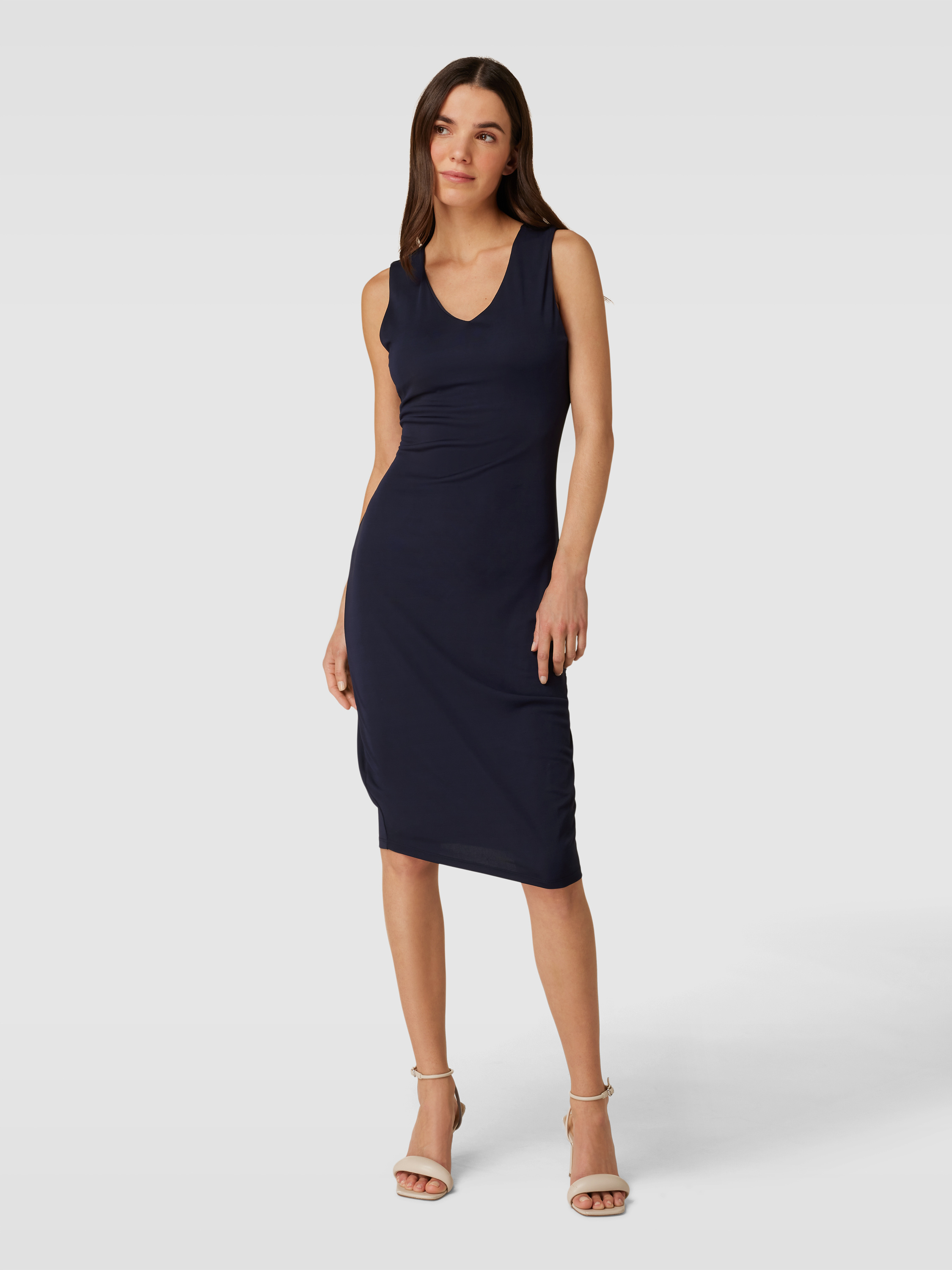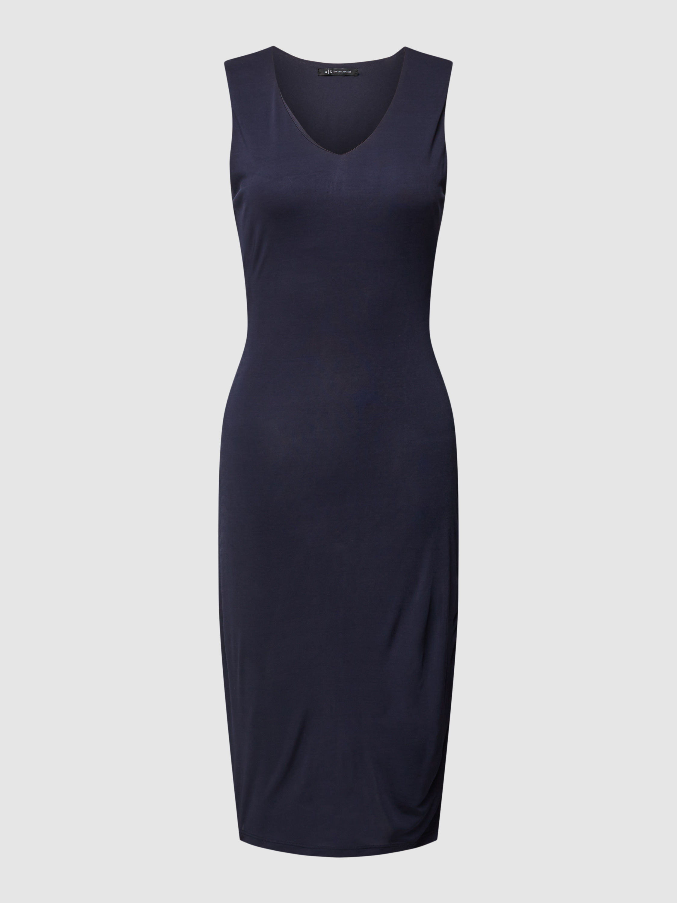 Das knielange Kleid von Armani Exchange besteht aus reiner Viskose und zeichnet sich durch seinen figurbetonten Schnitt aus. Mit seinem unifarbenen Design und einem V-Ausschnitt eignet es sich ideal für unterschiedliche Anlässe. Die seitliche Raffung verleiht dem ärmellosen Modell eine interessante Dynamik.