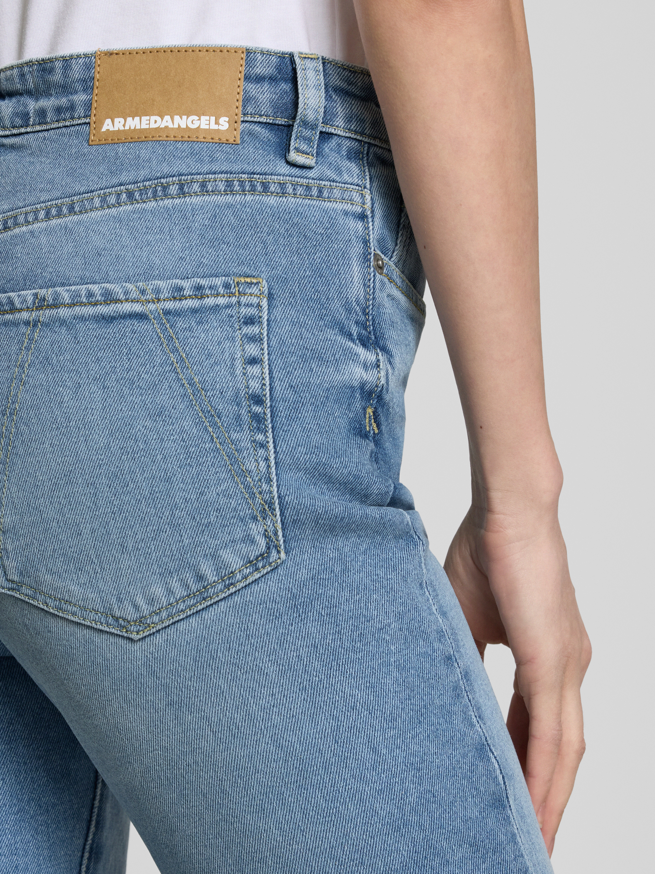 Die ARMEDANGELS 'LEJAANI' Damenjeans kombiniert einen Bio-Baumwoll-Elasthan-Mix mit einem schlanken Slim Fit, der sich angenehm anschmiegt und Bewegungsfreiheit bietet. Das unifarbene Design und das 5-Pocket-Layout machen sie vielseitig einsetzbar, während der Label-Patch einen dezenten Akzent setzt.