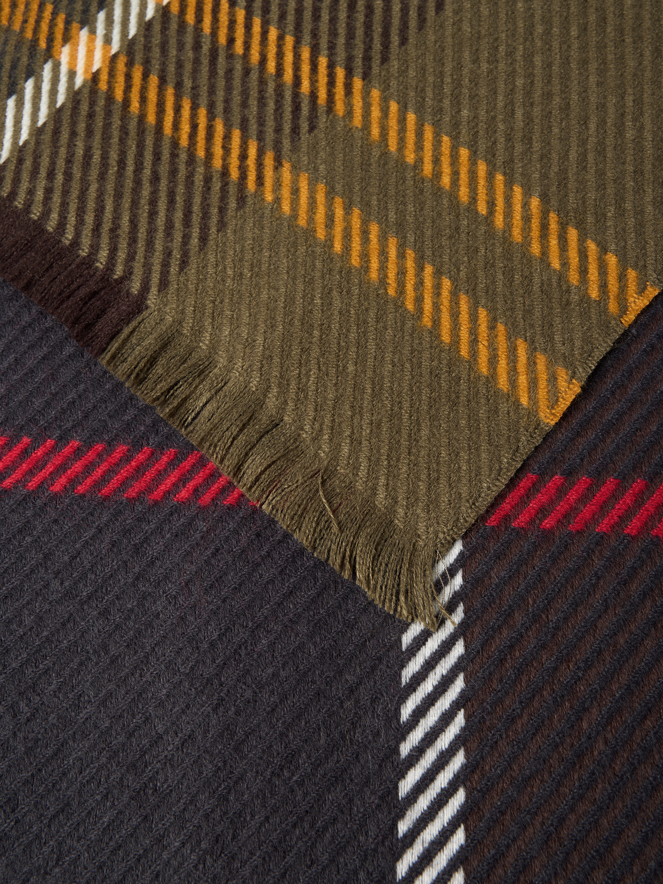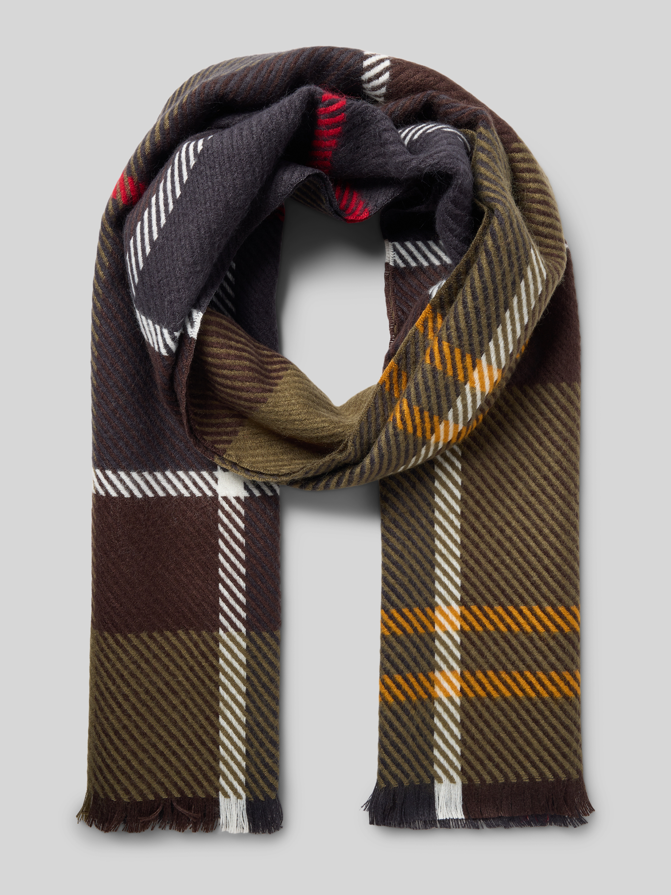 Der Schal von Barbour, Modell TARTAN, punktet durch ein abwechslungsreiches Allover-Muster mit klassischen Streifen und Karos. Weiche Wolle sorgt für ein angenehmes Gefühl auf der Haut, während feine Fransen dem Look eine dezente Dynamik verleihen. So eignet sich das Accessoire sowohl für entspannte als auch für elegante Outfits.