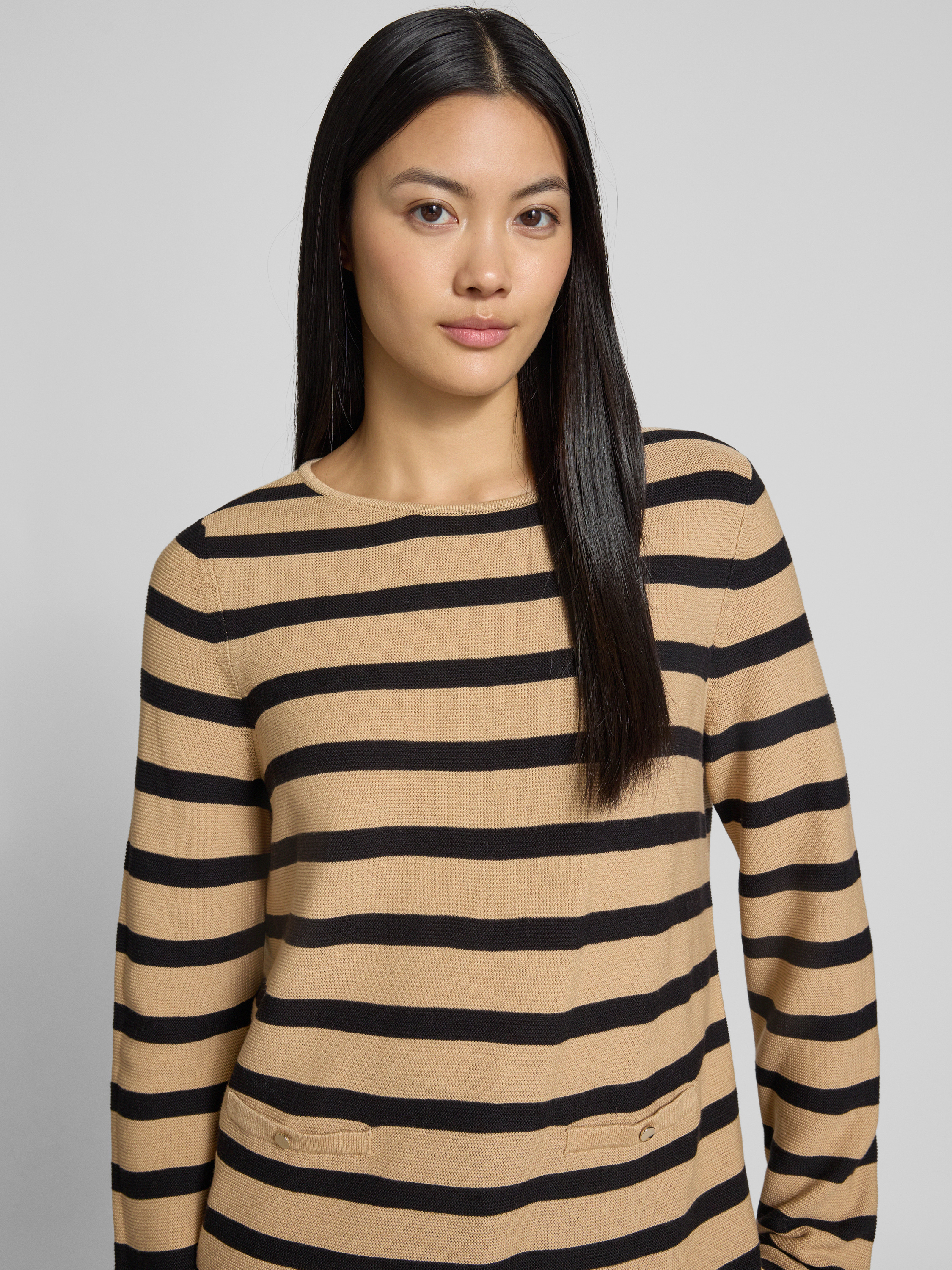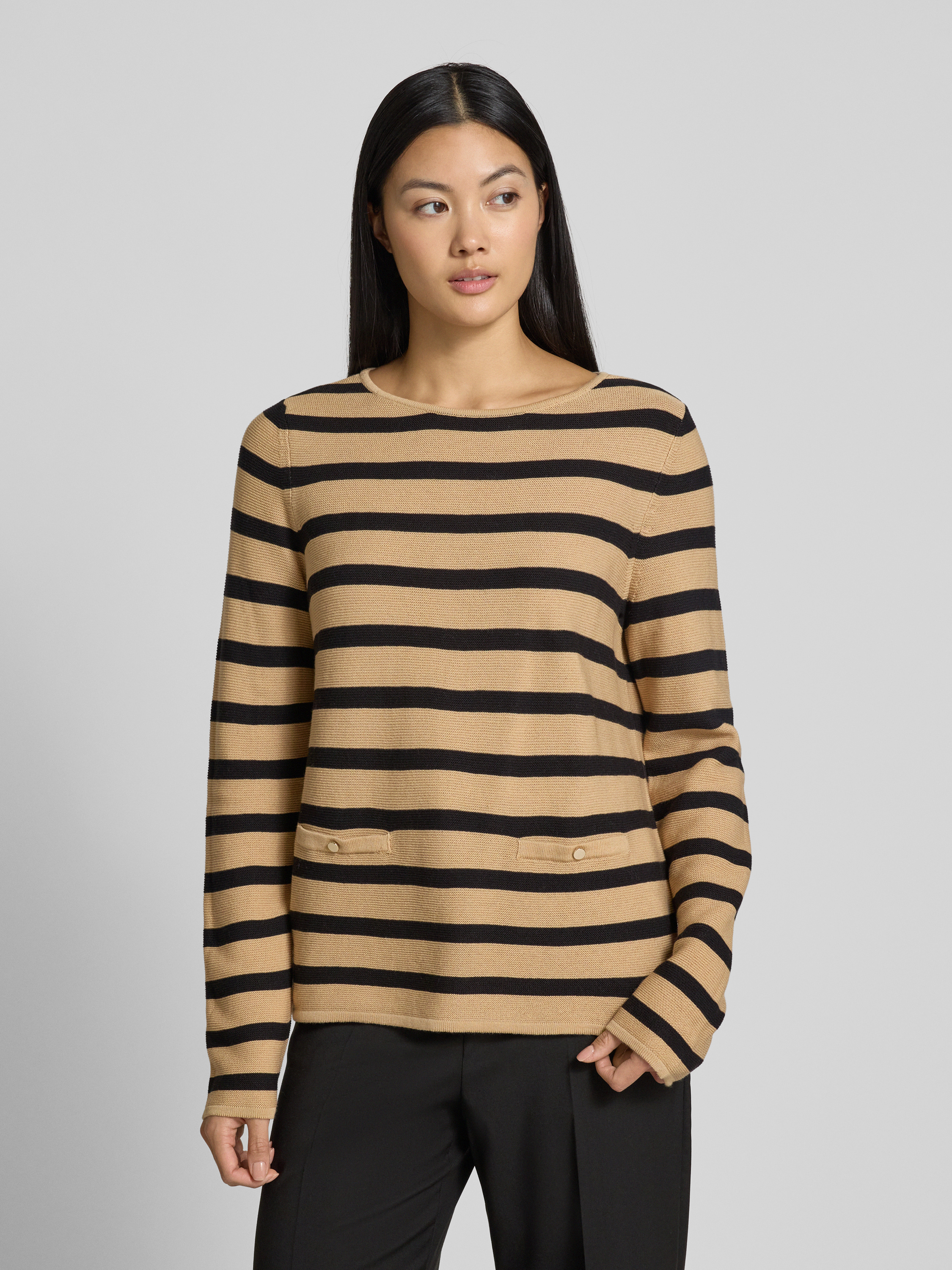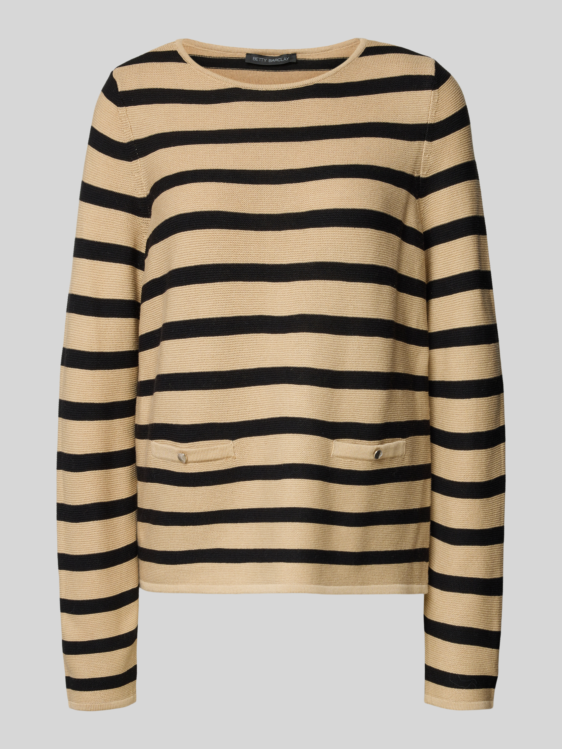 Der Damen Strickpullover von Betty Barclay zeigt sich in Regular Fit und sorgt mit seinem Baumwoll-Mix für ein angenehmes Tragegefühl im Alltag. Ein Rundhalsausschnitt und dezente Ziertaschen runden das Erscheinungsbild ab. So lässt sich das Modell vielseitig kombinieren und schafft Bewegungsfreiheit.
