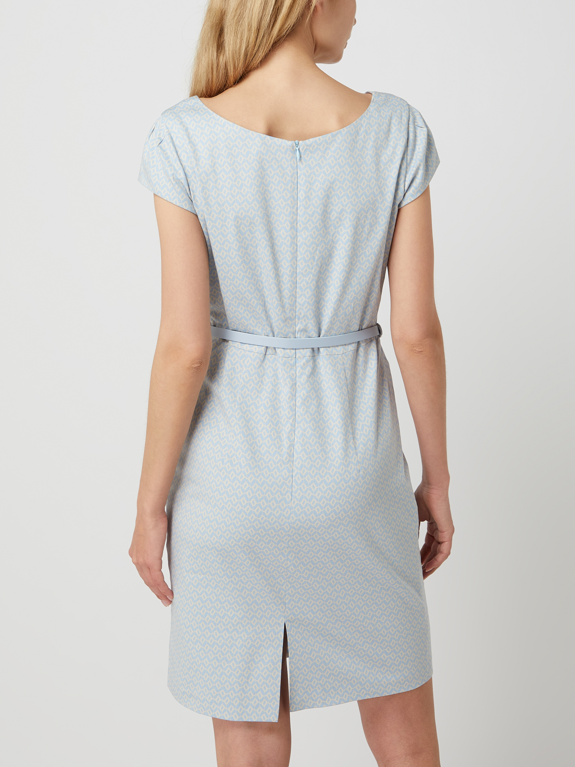Das Etuikleid von BETTY & CO. ist aus einem Baumwoll-Elasthan-Mix gefertigt. Es zeigt sich in taillierter Passform mit Rundhalsausschnitt, Kappärmeln und schmalem Gürtel.