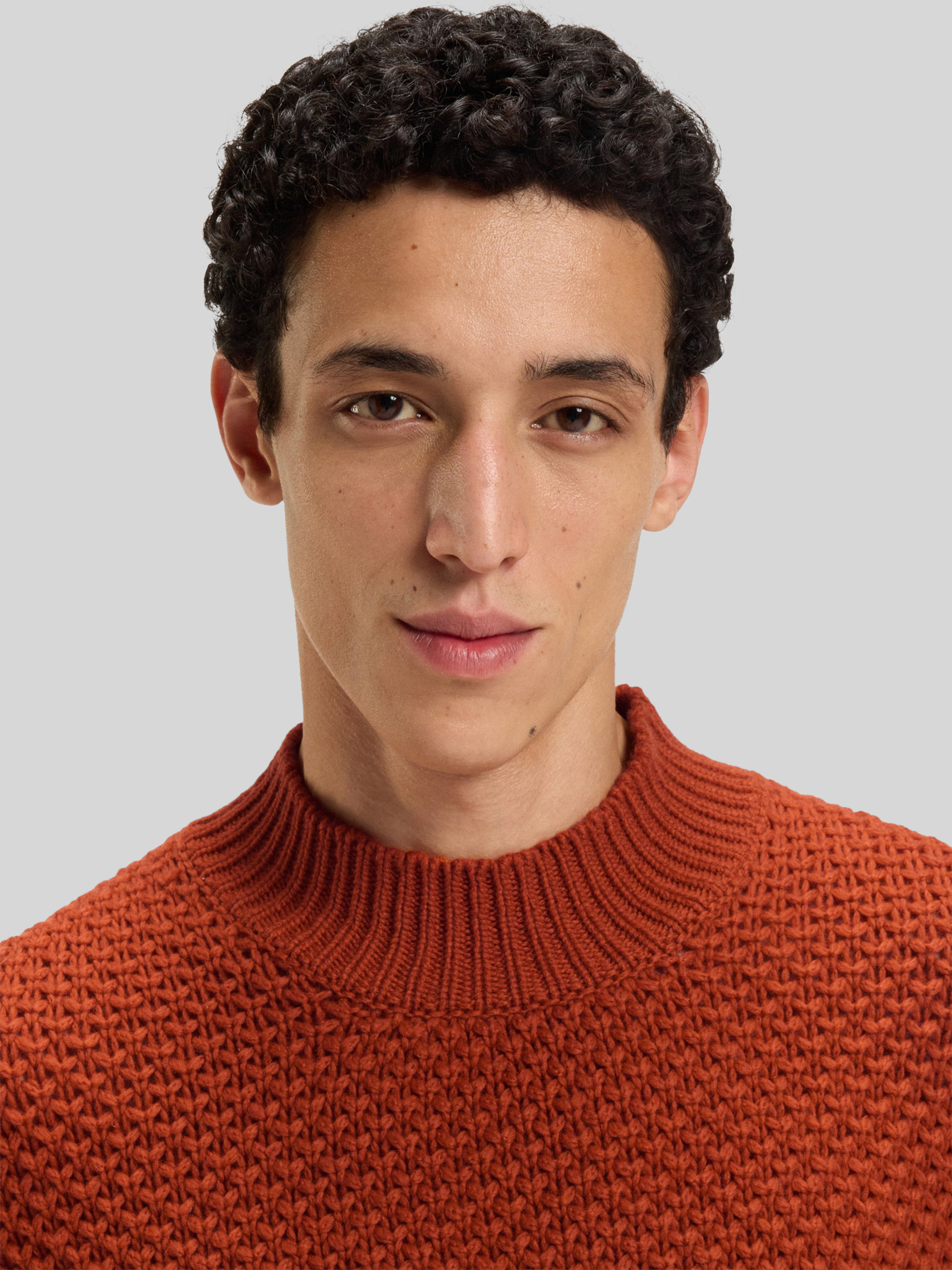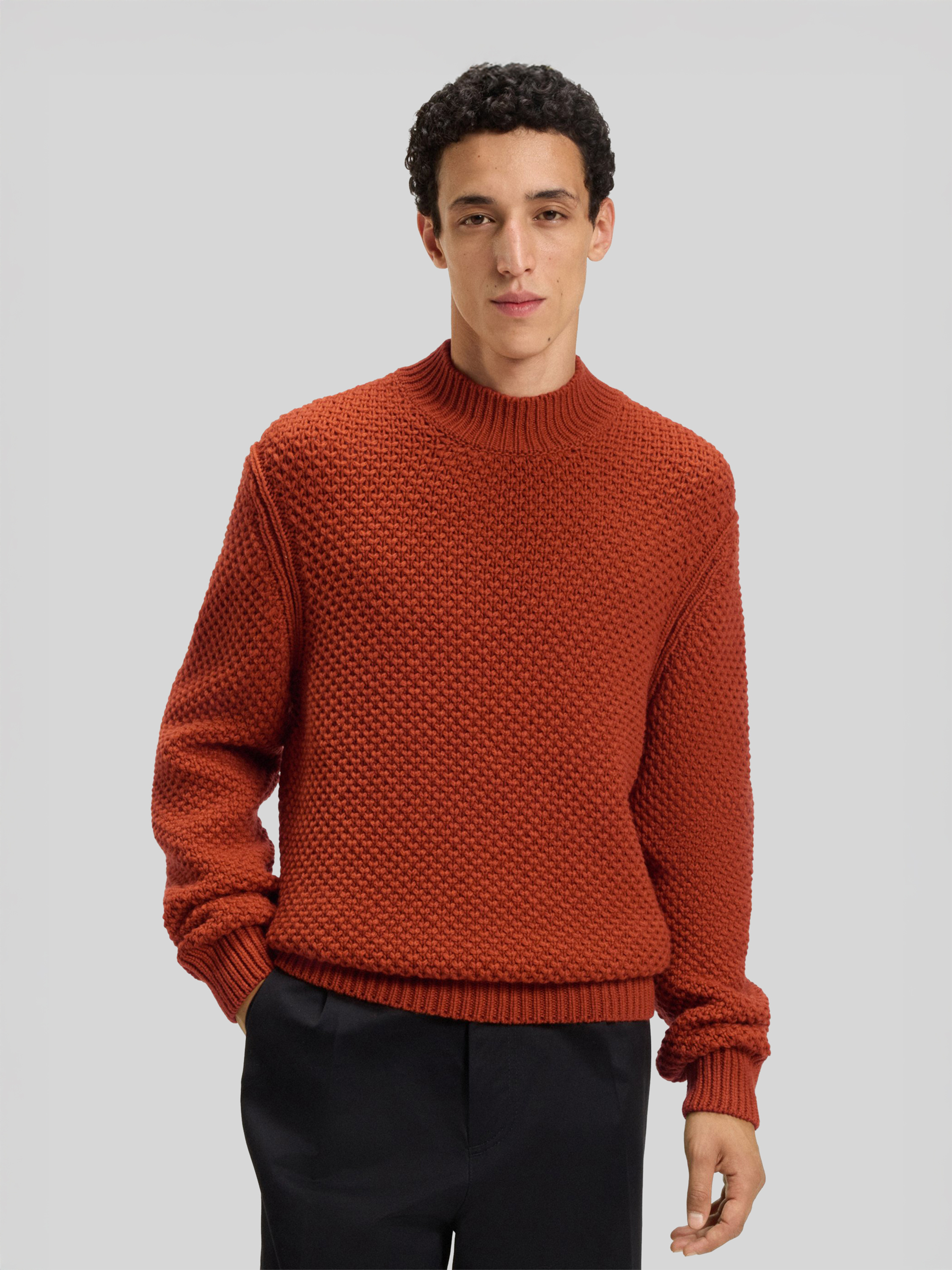 Der Herrenpullover von BECKHAM x BOSS, Modell C-Heletto, überzeugt durch seinen Regular Fit und eine strukturierte Oberfläche. Gefertigt aus reiner Schurwolle, sorgt er für ein angenehmes Tragegefühl. Der Mock Neck und das unifarbene Design runden den zeitgemäßen Look ab.