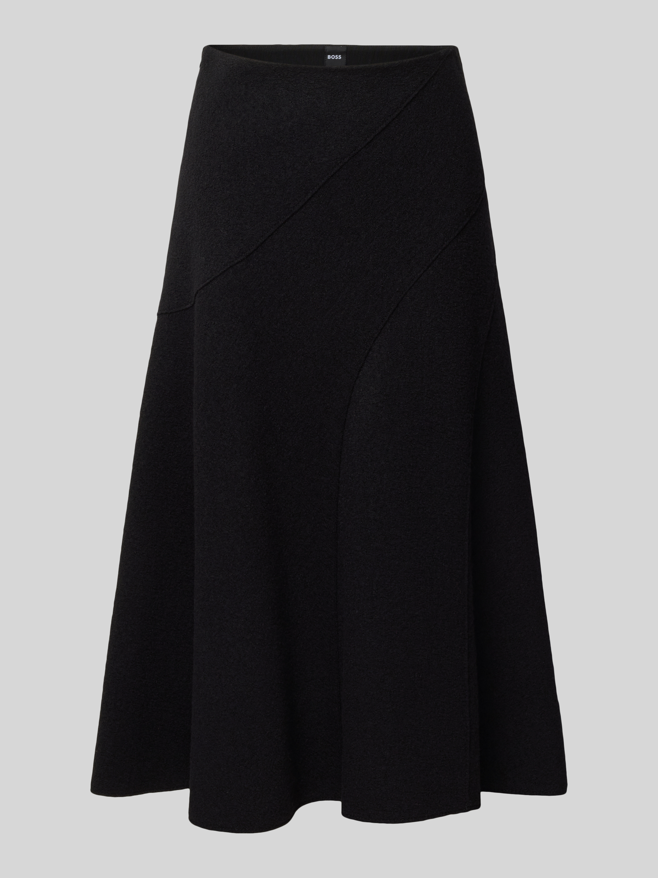 Der A-Linien Rock von BOSS, Modell Vicena, besteht aus reiner gekochter Schurwolle und fühlt sich angenehm auf der Haut an. Durch die Midi-Länge und die klare, unifarbene Optik eignet er sich ideal für unterschiedliche Anlässe. Dezente Nahtdetails betonen die zeitlose Schnittführung.