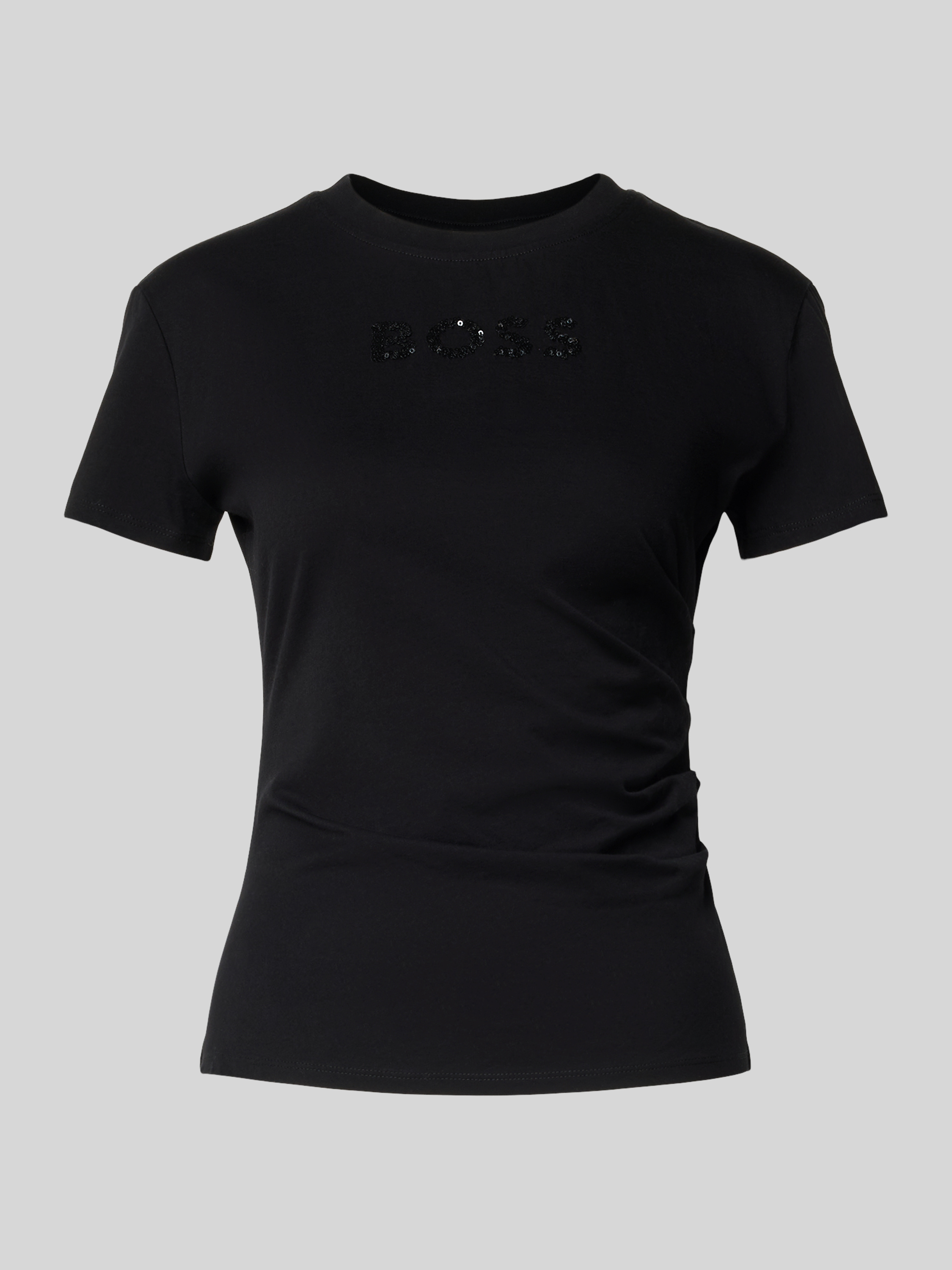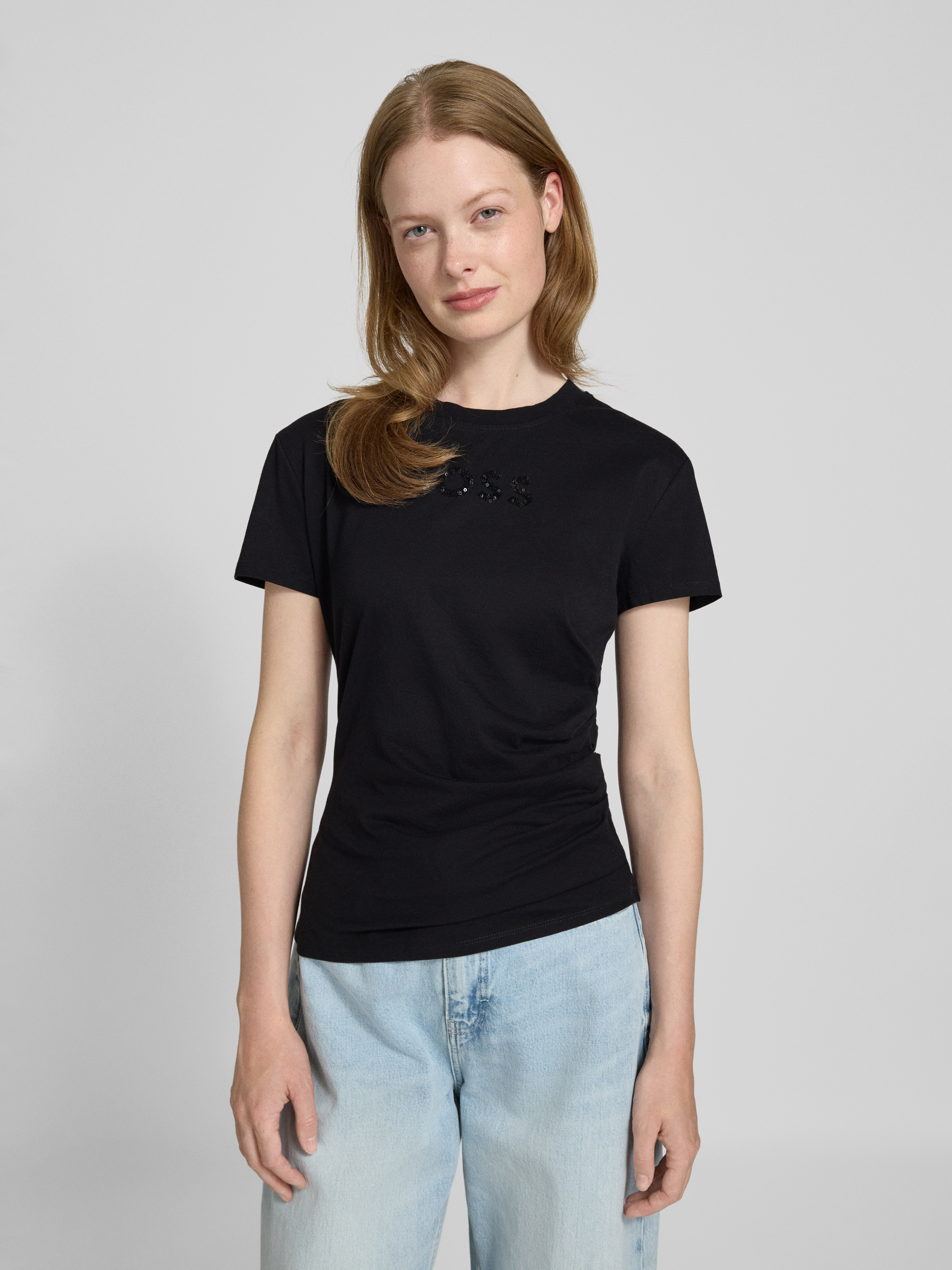 Das Damen T-Shirt von BOSS kombiniert schlichte Eleganz mit einer raffinierten Slim Fit Passform. Dank der reinen Baumwolle im Jersey-Stil trägt es sich angenehm leicht und bietet einen hohen Tragekomfort. Die seitliche Raffung verleiht dem unifarbenen Design eine dezente, aber wirkungsvolle Note.