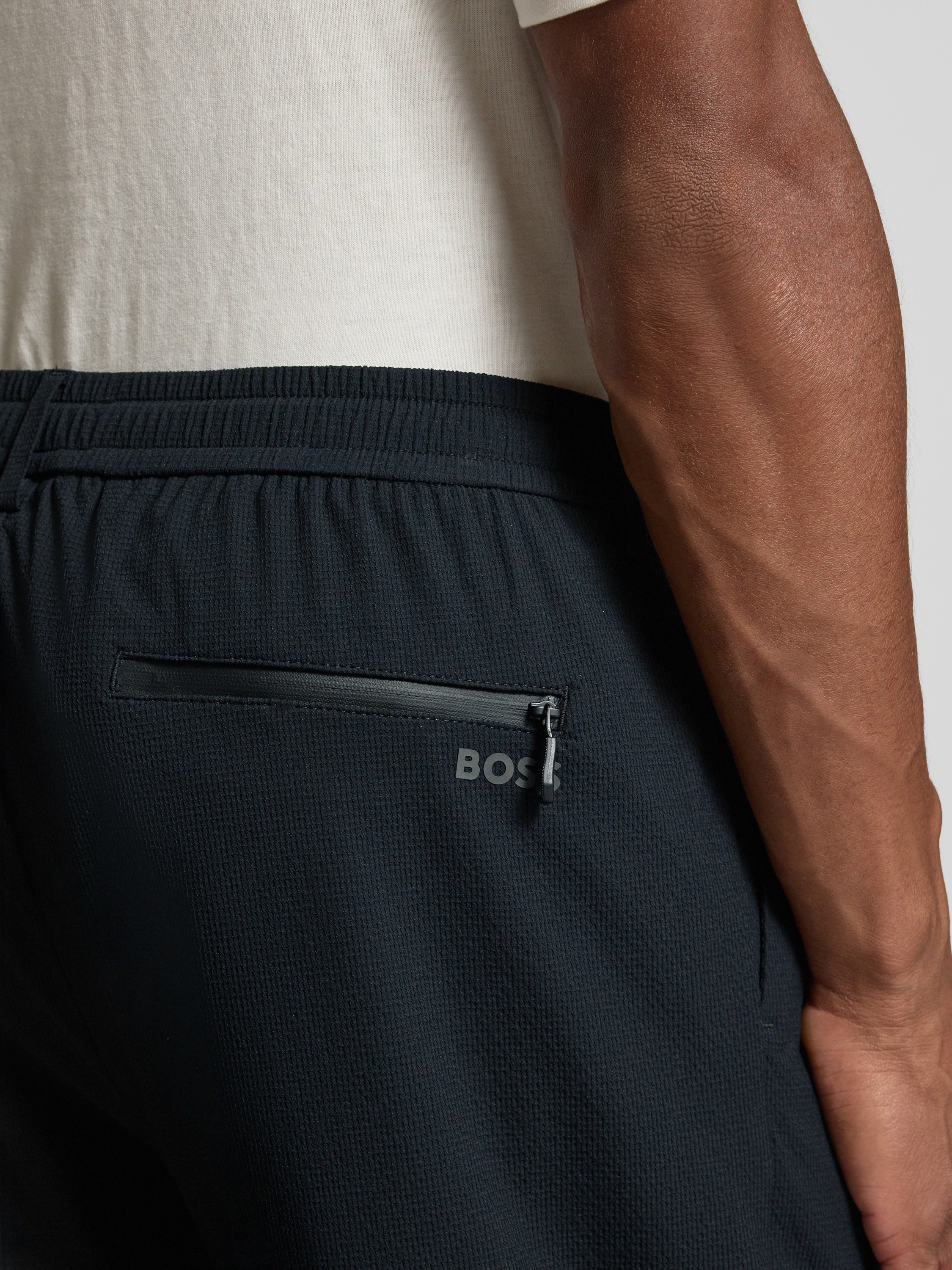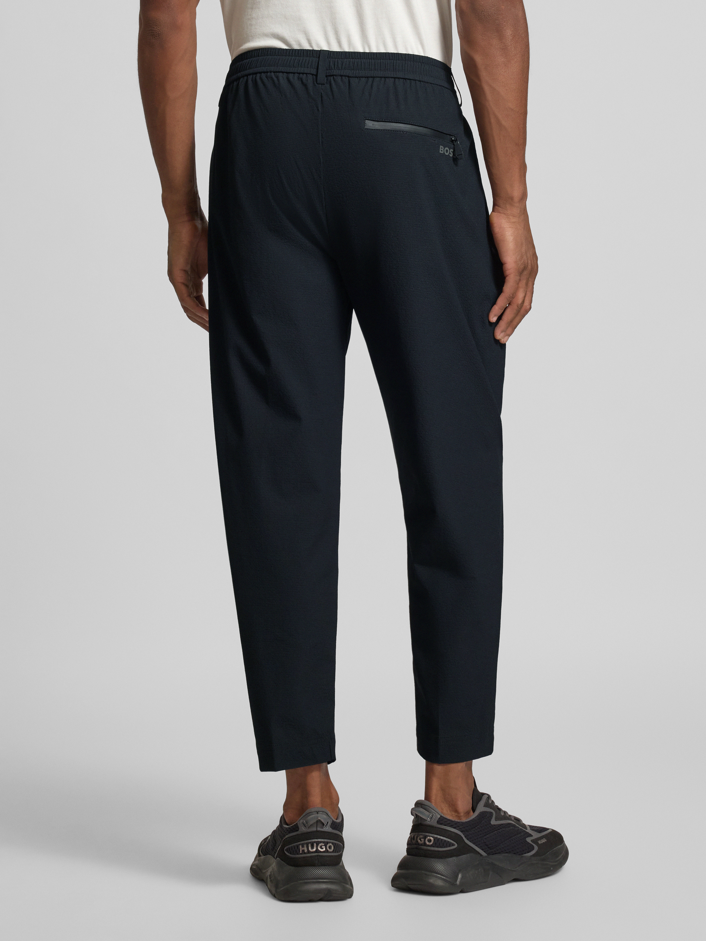 Die Tapered Fit Hose mit Tunnelzug von BOSS Green, Modell 'Convert Pleat', überzeugt durch eine moderne Silhouette und angenehmen Tragekomfort. Dank des leichten Seersucker-Materials bleibt sie auch an langen Tagen luftig, während praktische Details wie Bügelfalten und Kartenhalter alltagstaugliche Flexibilität ermöglichen. So eignet sich diese Hose für vielseitige Gelegenheiten, ohne einzuengen.