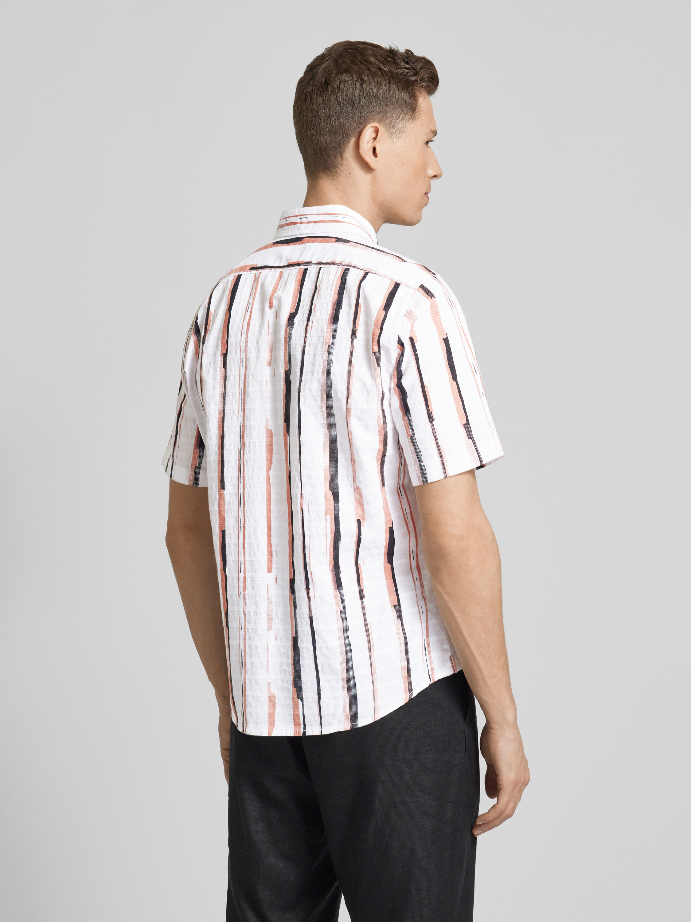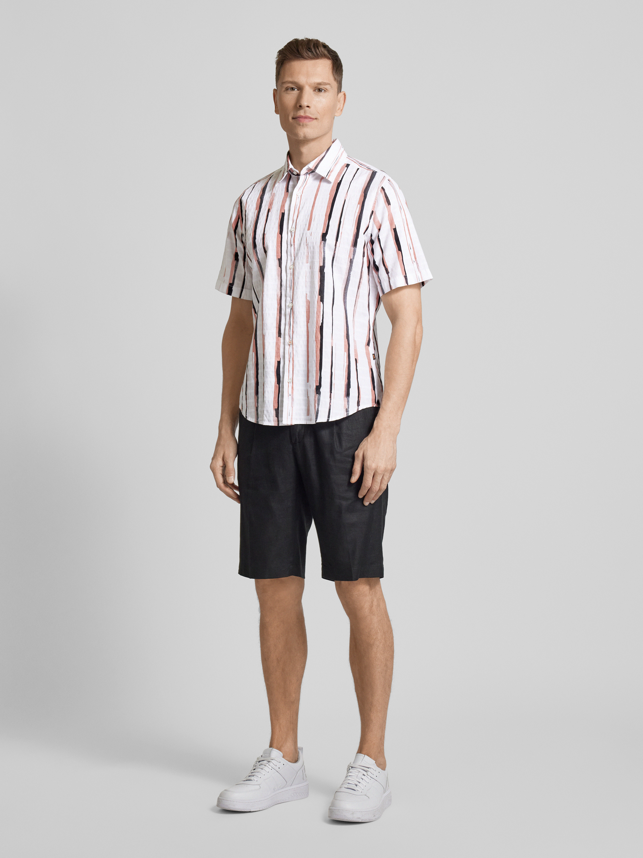 Das BOSS Orange Freizeithemd präsentiert sich im Regular Fit und vereint einen elastischen Material-Mix mit einem stilvollen Streifenmuster. Der Kentkragen und das kurzärmelige Design schaffen eine lässige Eleganz, die sich für diverse Freizeitaktivitäten eignet. Es bietet Komfort und Stil für den Alltag.