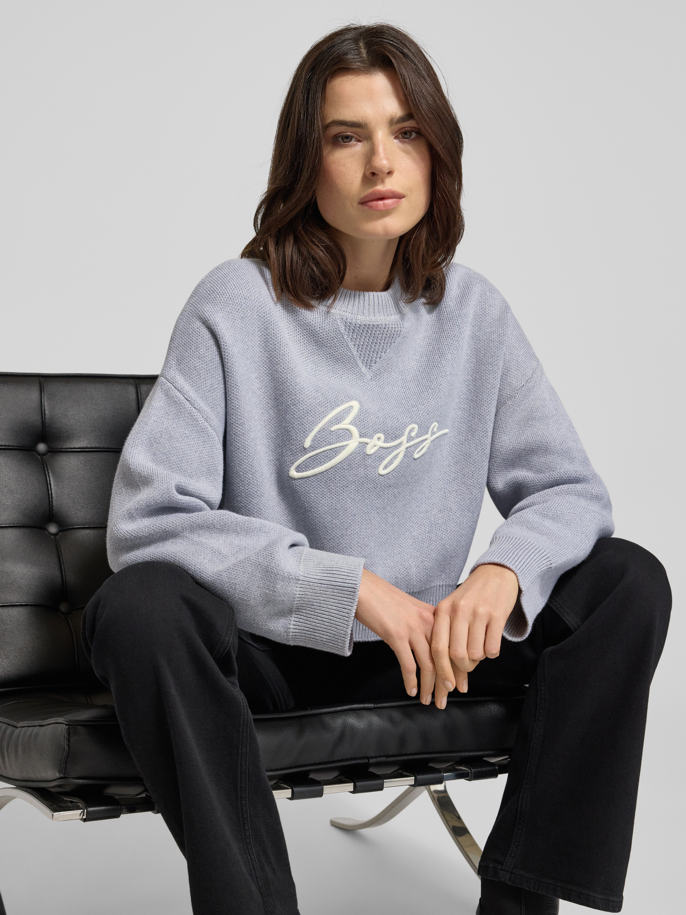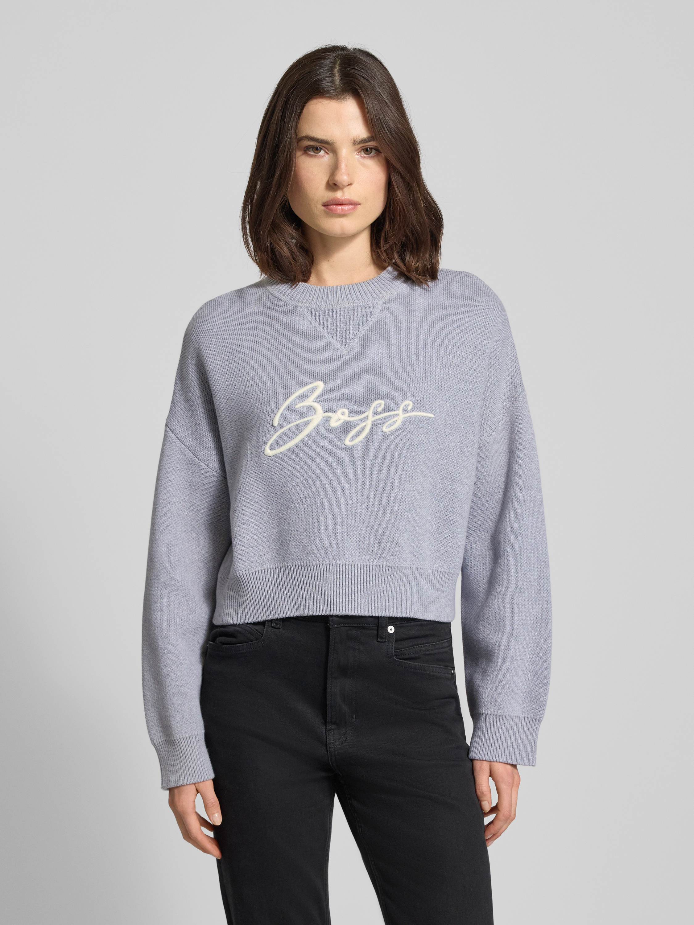 Der Damen Strickpullover von BOSS Orange, Modell Finevra, legt mit seinem entspannten Relaxed-Fit und den überschnittenen Schultern den Fokus auf bequemen Sitz und moderne Silhouette. Die reine Baumwolle sorgt für ein angenehmes Hautgefühl und unterstützt ein ausgeglichenes Trageklima im Alltag. Durch die Cropped-Länge und die dezente Label-Applikation lässt sich das Oberteil vielseitig kombinieren, wodurch man auf unkomplizierte Weise Abwechslung in die Garderobe bringt.