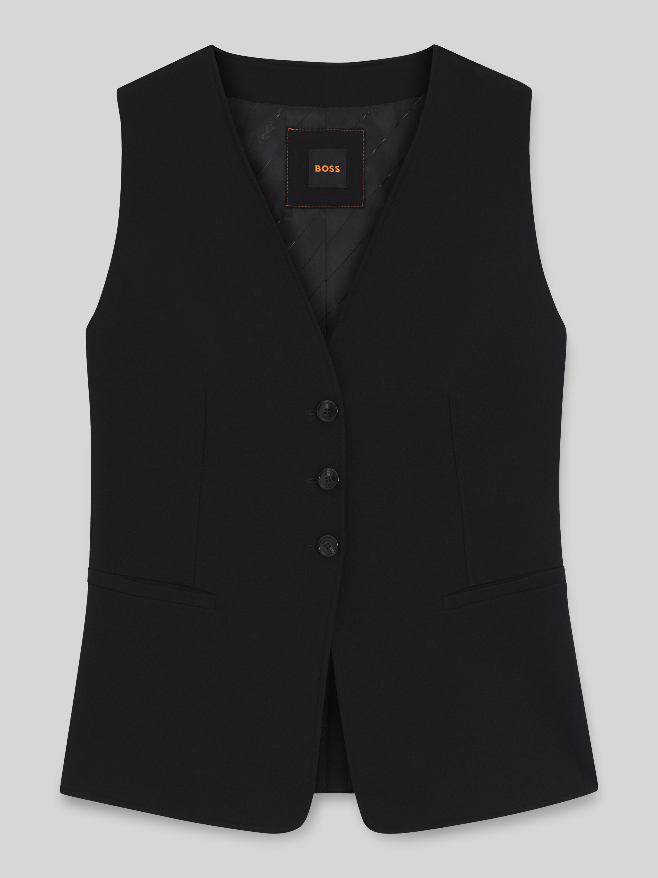 Die Damen Weste von BOSS Orange zeigt sich in schmaler Slim Fit Passform und überzeugt durch ihre unifarbene Optik, die vielseitig kombiniert werden kann. Dank des 3-Knopf-Verschlusses und der Cinch-Schnalle am Rücken lässt sich die Silhouette individuell anpassen. Dezente Paspeltaschen runden das zeitlose Design praktisch ab.