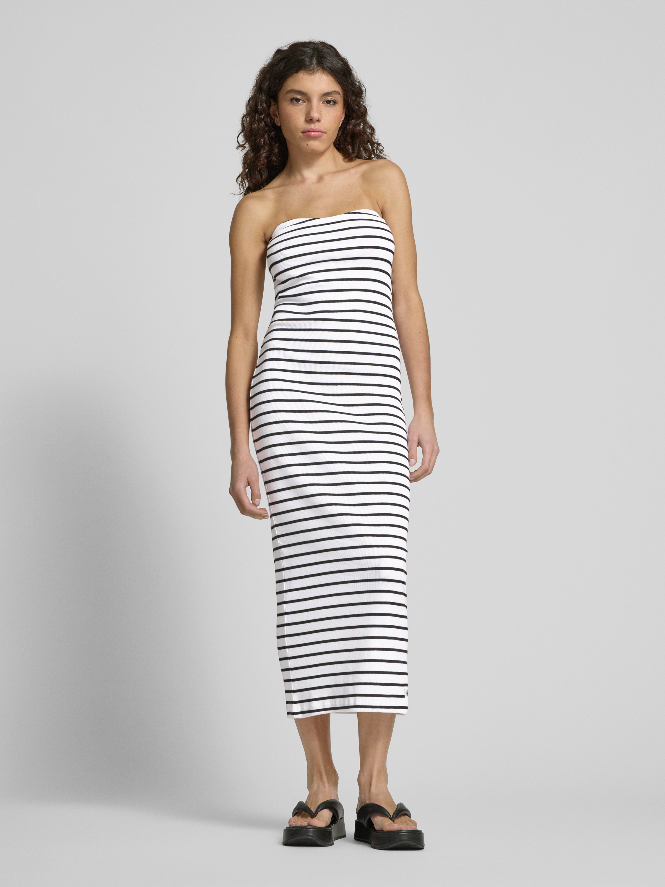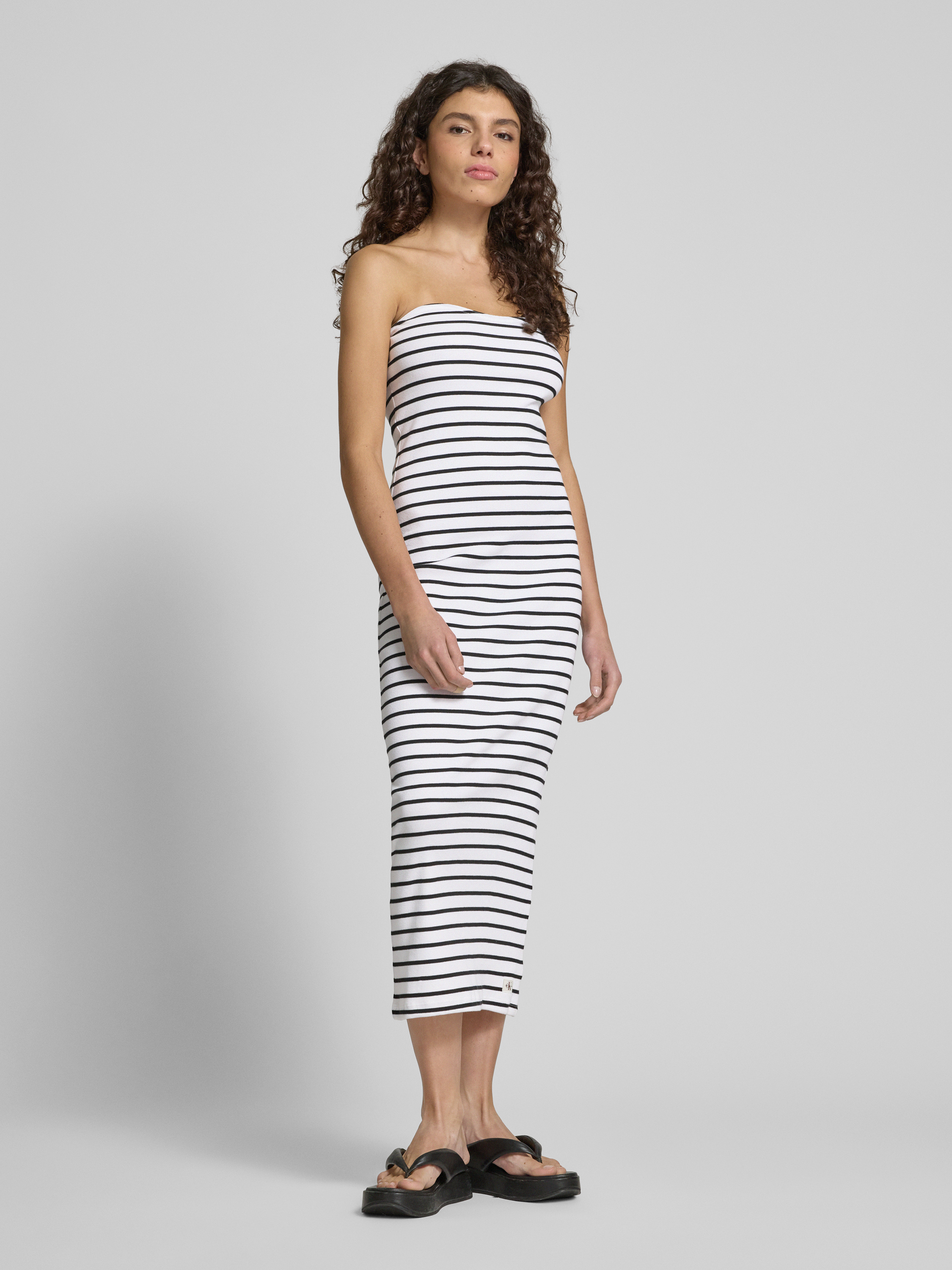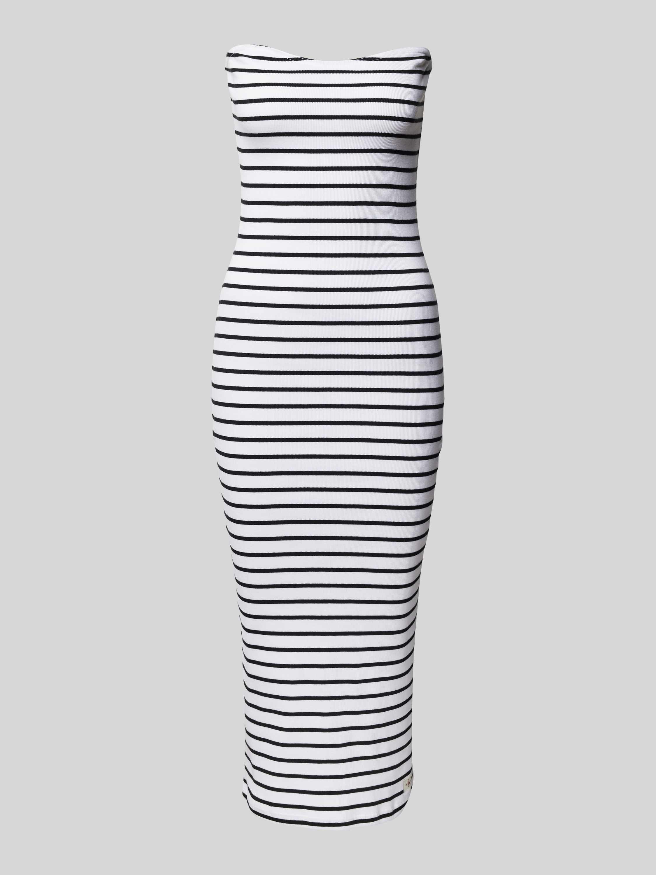 Das Midikleid von Calvin Klein Jeans beeindruckt durch seine eng anliegende Passform in einer eleganten Bandeau-Form. Der Baumwoll-Elasthan-Mix sorgt für angenehmen Tragekomfort, während die feine Ripp-Optik dem Kleid eine besondere Struktur verleiht. Ein dezentes Label-Detail rundet das Design ab.