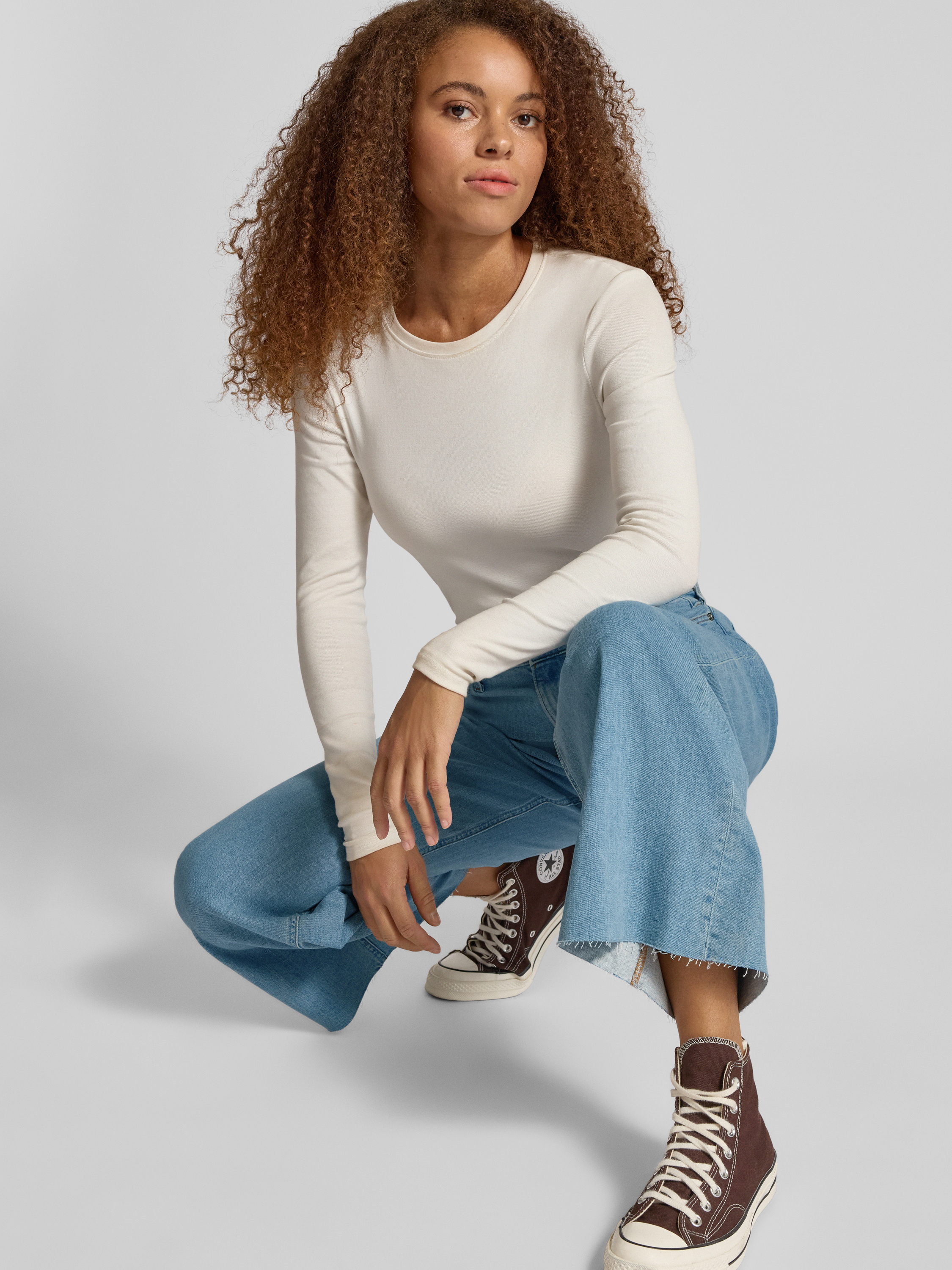 Die Ultra High Waist Wide Fit Jeans von Calvin Klein Jeans fällt durch ihren lockeren Schnitt auf, der Bewegungsfreiheit im Alltag ermöglicht. Ein Baumwoll-Elasthan-Mix sorgt für angenehmen Tragekomfort und eine lässige Passform. Die Fransen am Beinabschluss setzen einen dezenten, modernen Akzent.