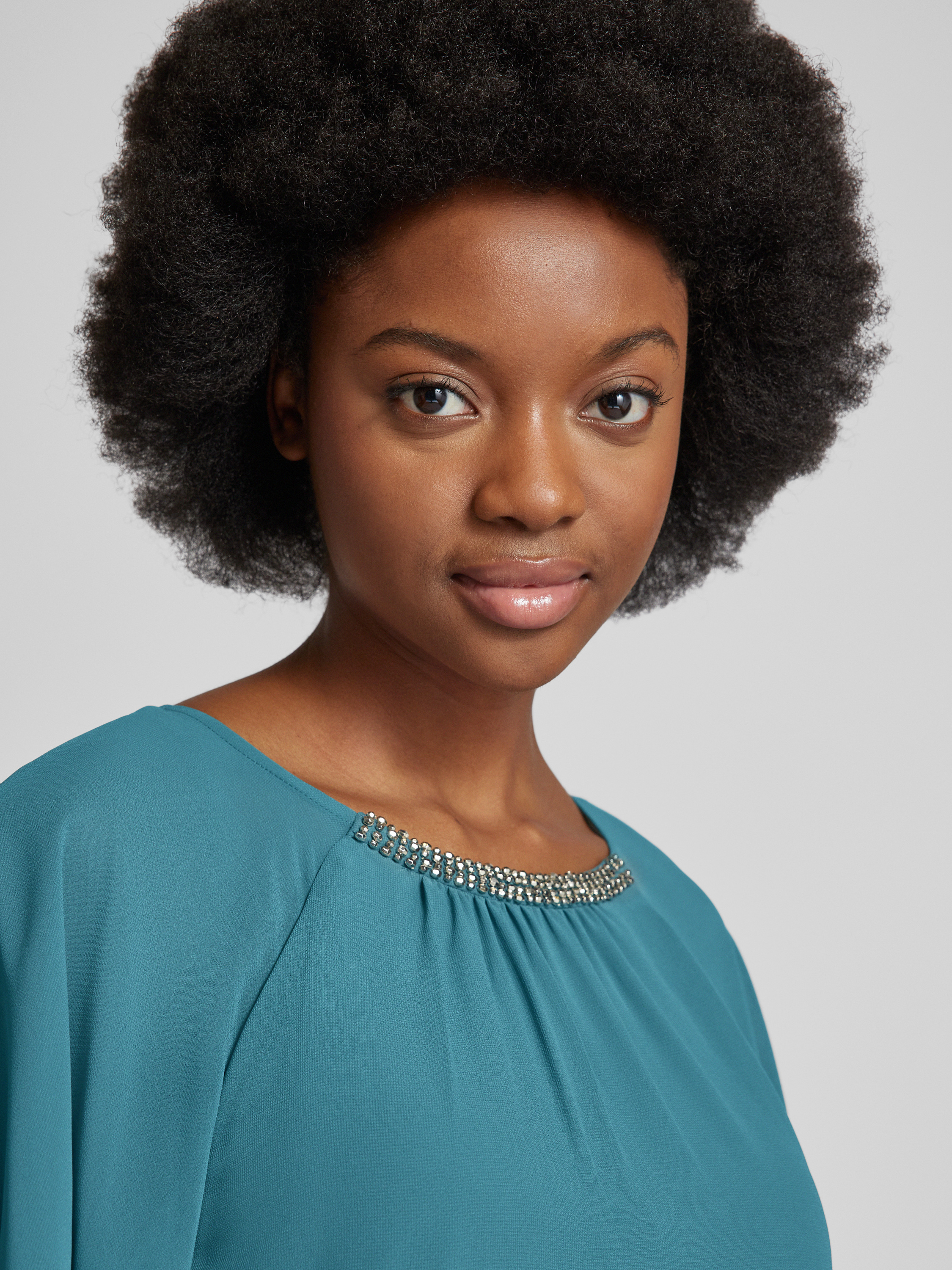 Das Christian Berg Cocktailkleid im Stufen-Look präsentiert sich in einem eleganten, unifarbenen Design mit einem geraden Schnitt, der eine schmeichelhafte Silhouette erzeugt. Der Rundhalsausschnitt mit Strasssteinbesatz sorgt für einen dezenten Glanz, während die semitransparenten Ärmel Leichtigkeit verleihen. Gefertigt aus Chiffon, eignet sich das Minikleid ideal für besondere Anlässe.
