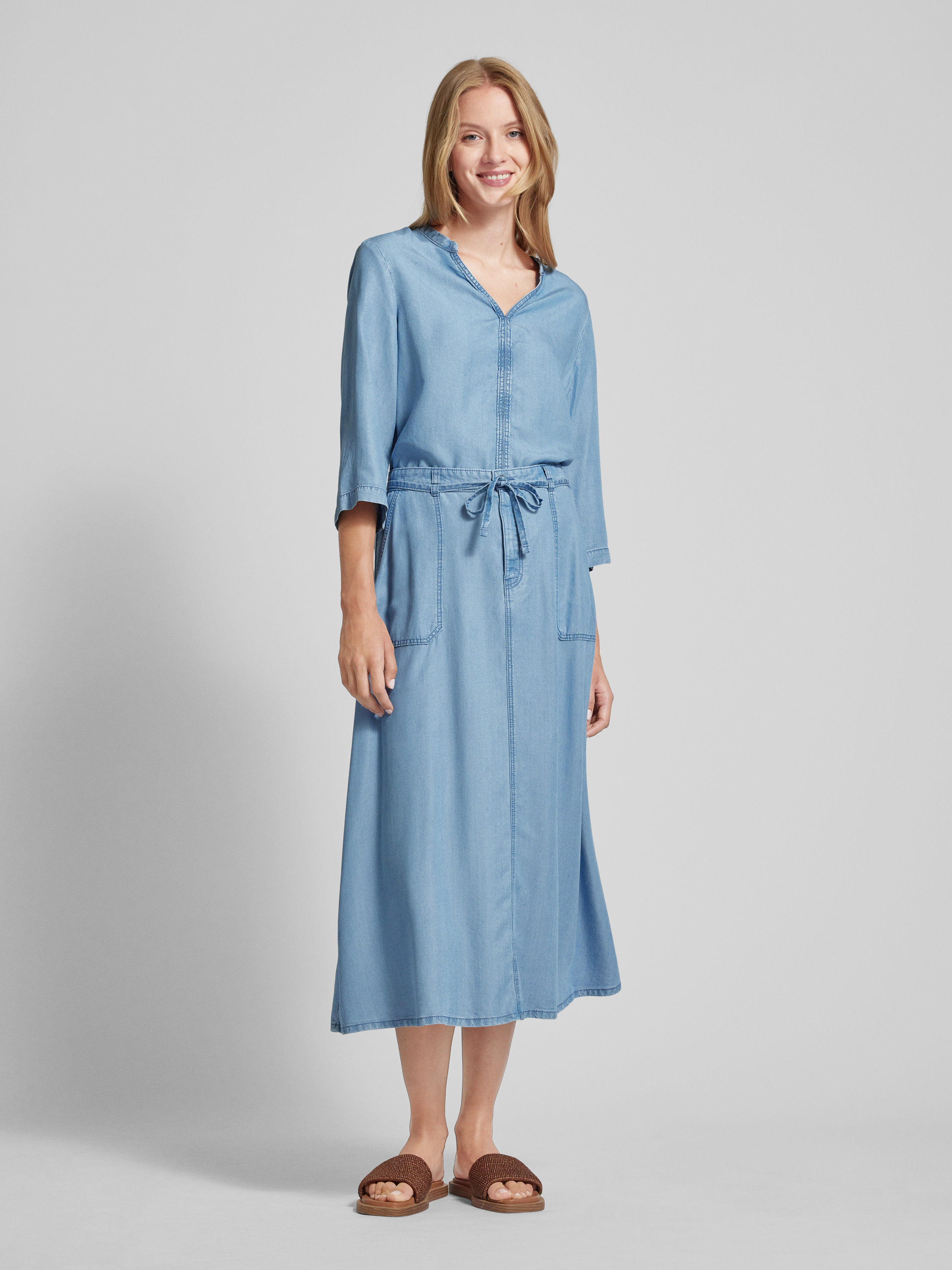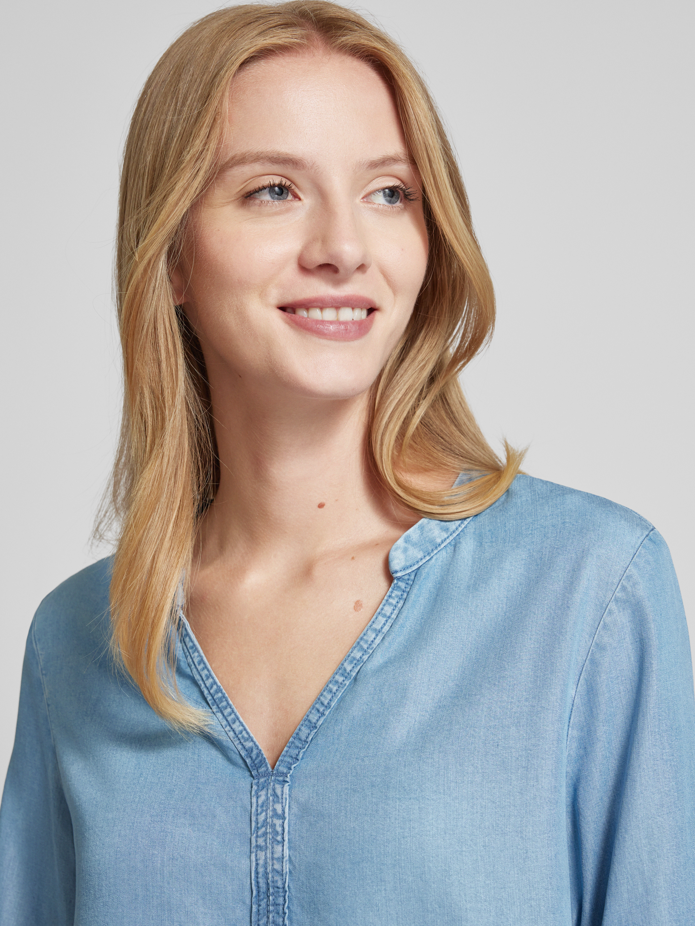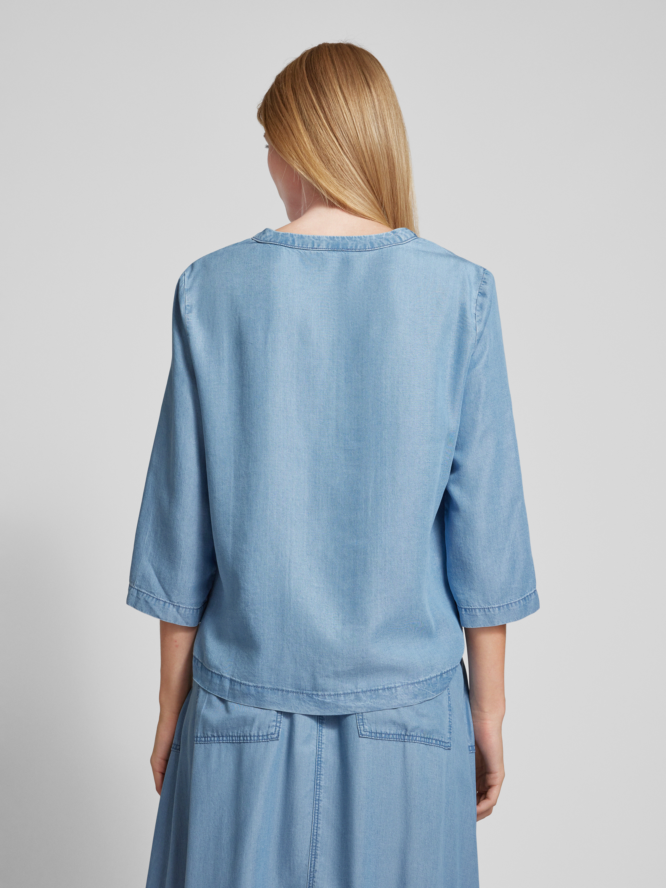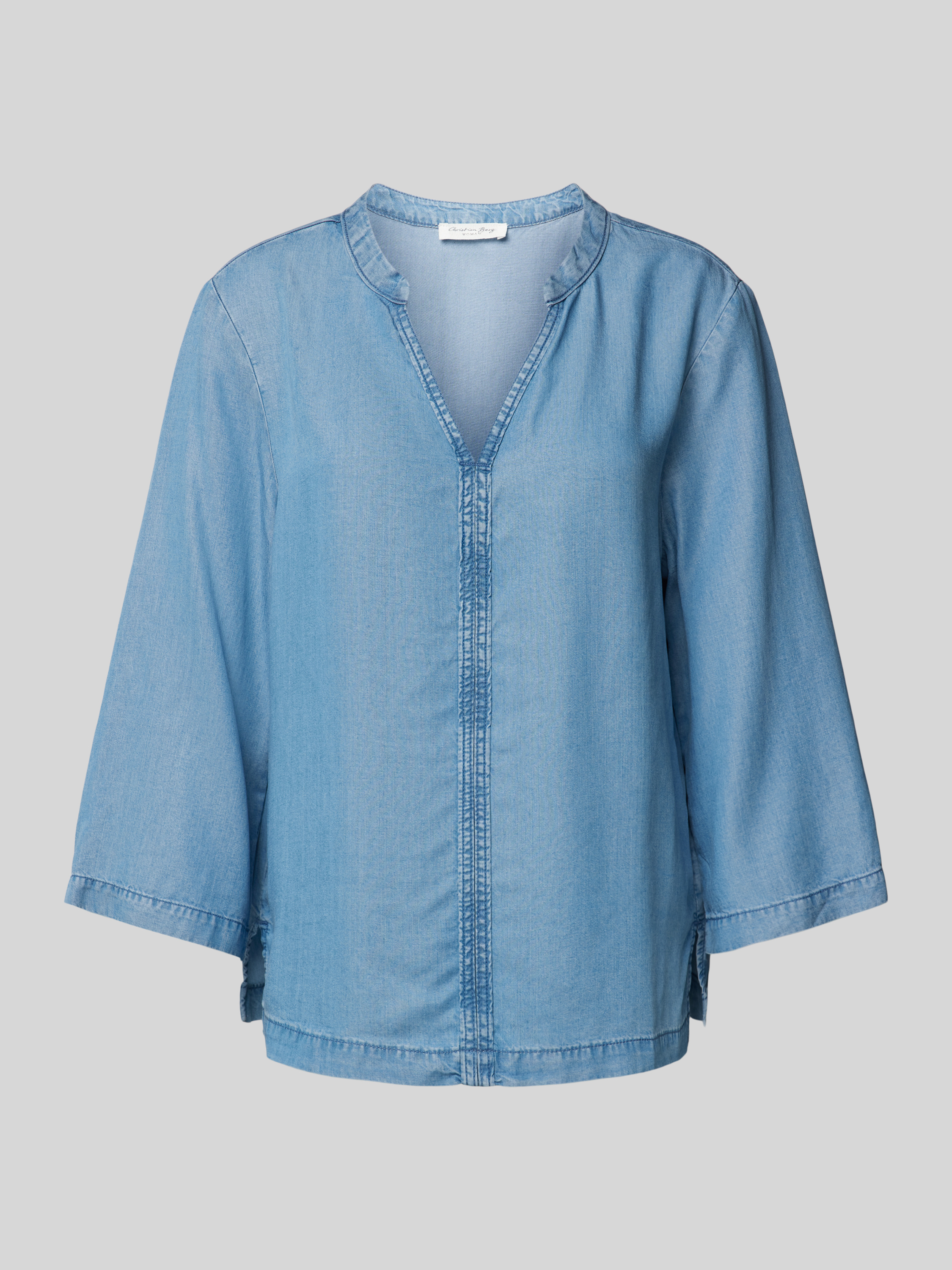 Die Bluse von Christian Berg Woman in Denim-Optik aus reinem Lyocell bietet durch ihren lockeren Schnitt und den V-Ausschnitt eine angenehme Passform. Der 3/4-Arm und die Seitenschlitze verleihen Bewegungsfreiheit und Komfort. Ideal für vielfältige Anlässe und stilvolle Auftritte.