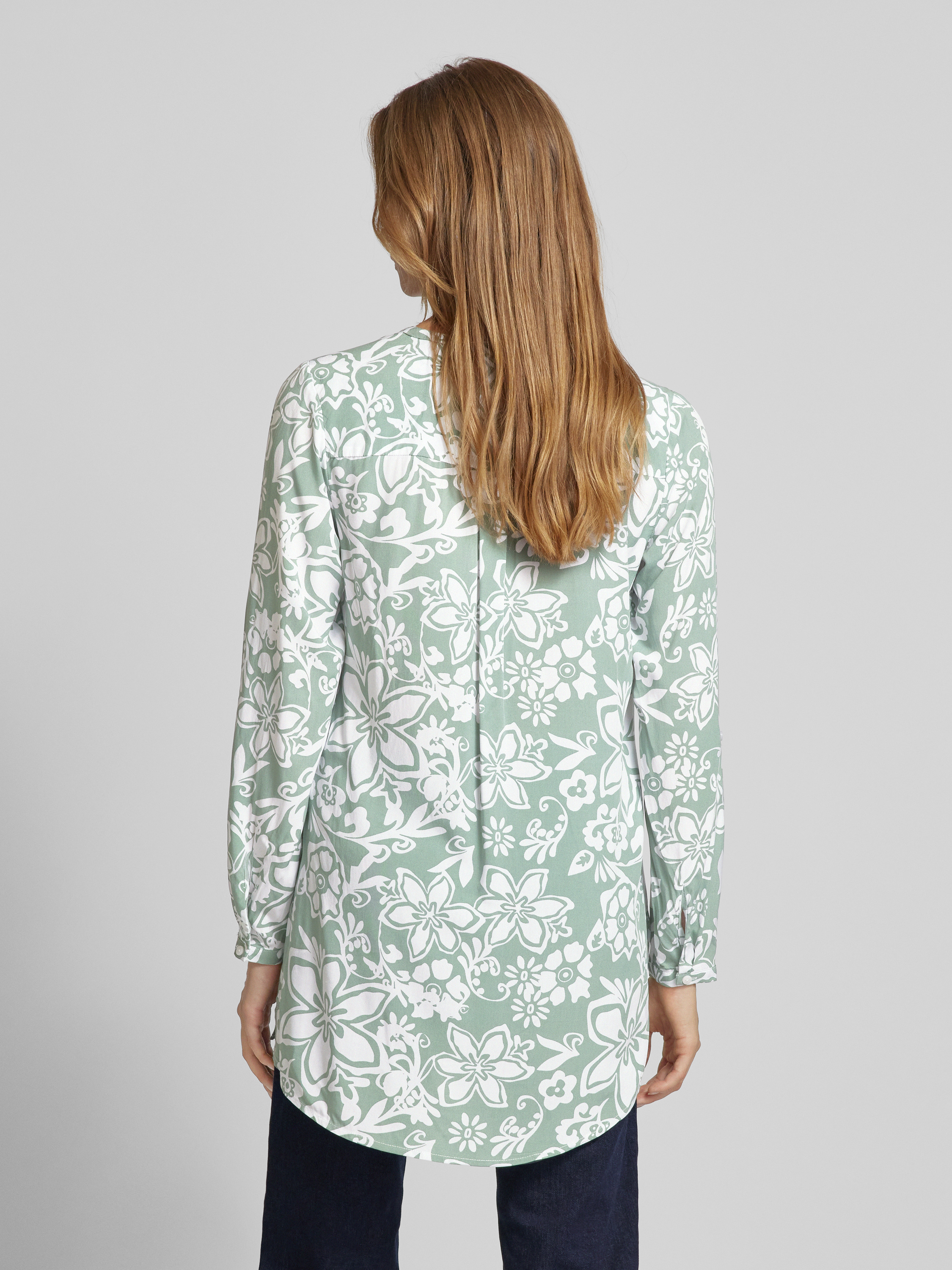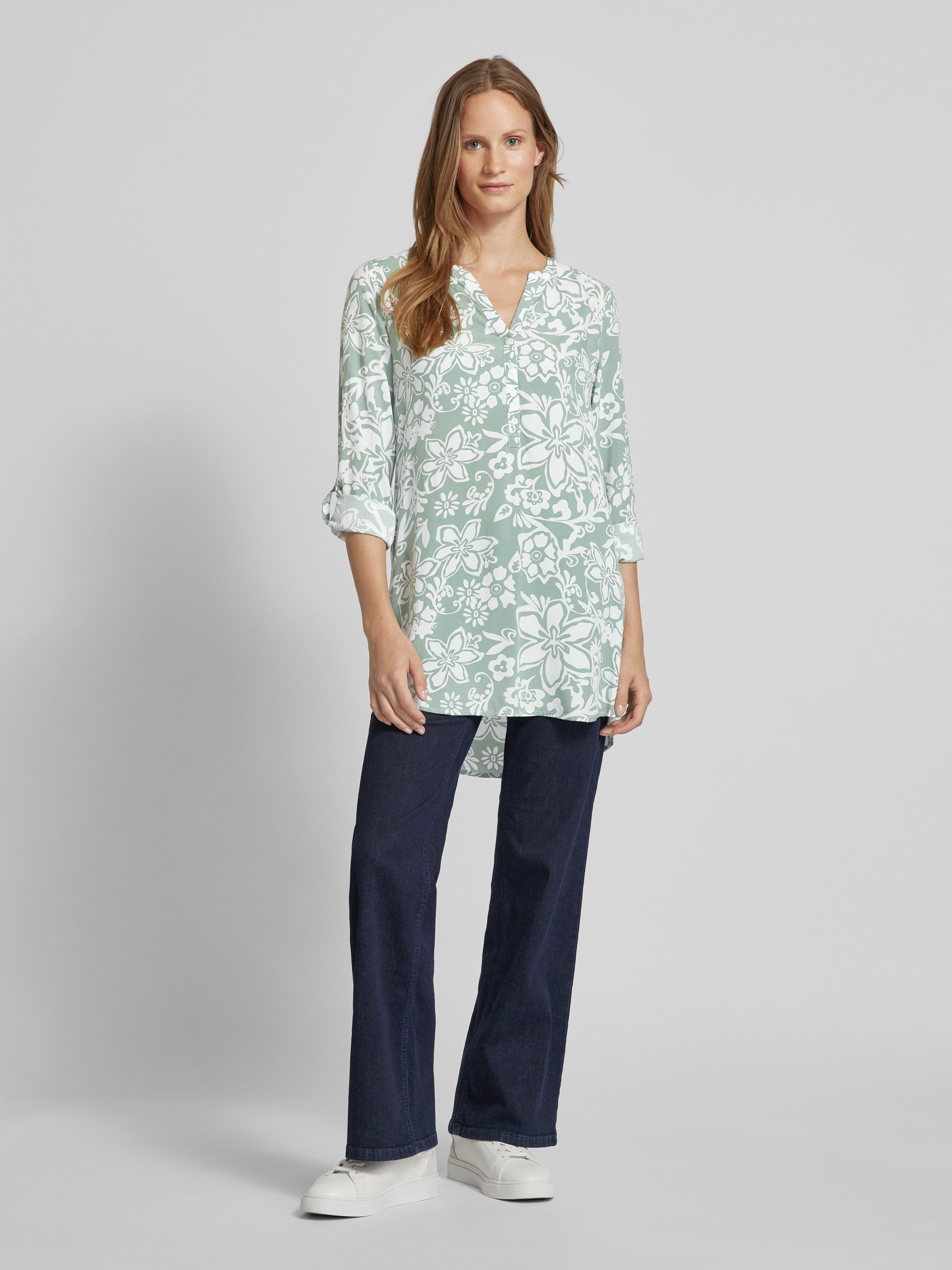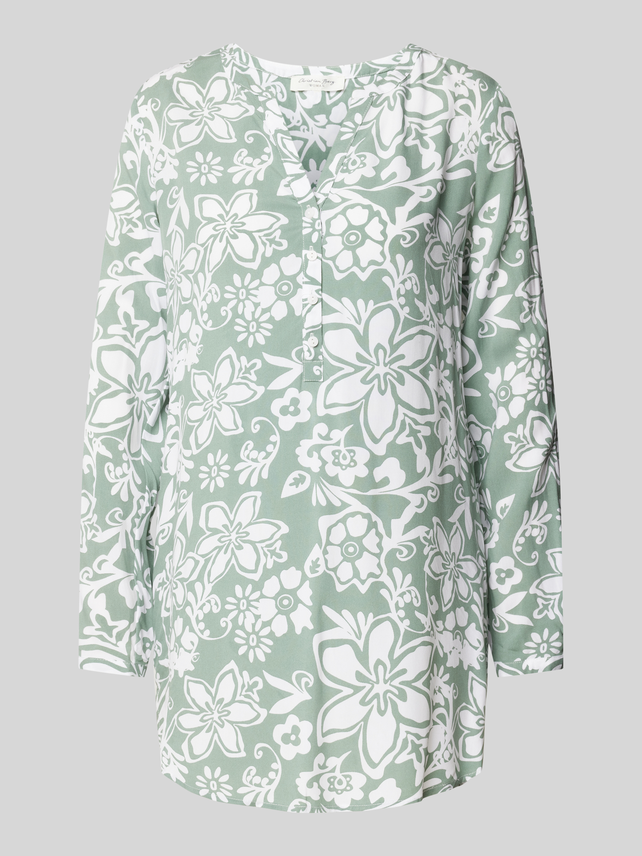 Das Blusenshirt von Christian Berg Woman verbindet elegantes Allover-Muster mit lockerer Passform und einem schmeichelhaften V-Ausschnitt. Lange Ärmel lassen sich praktisch krempeln, was Flexibilität bei wechselnden Temperaturen bietet. Hergestellt aus reiner Viskose, bietet es ein angenehmes Tragegefühl.