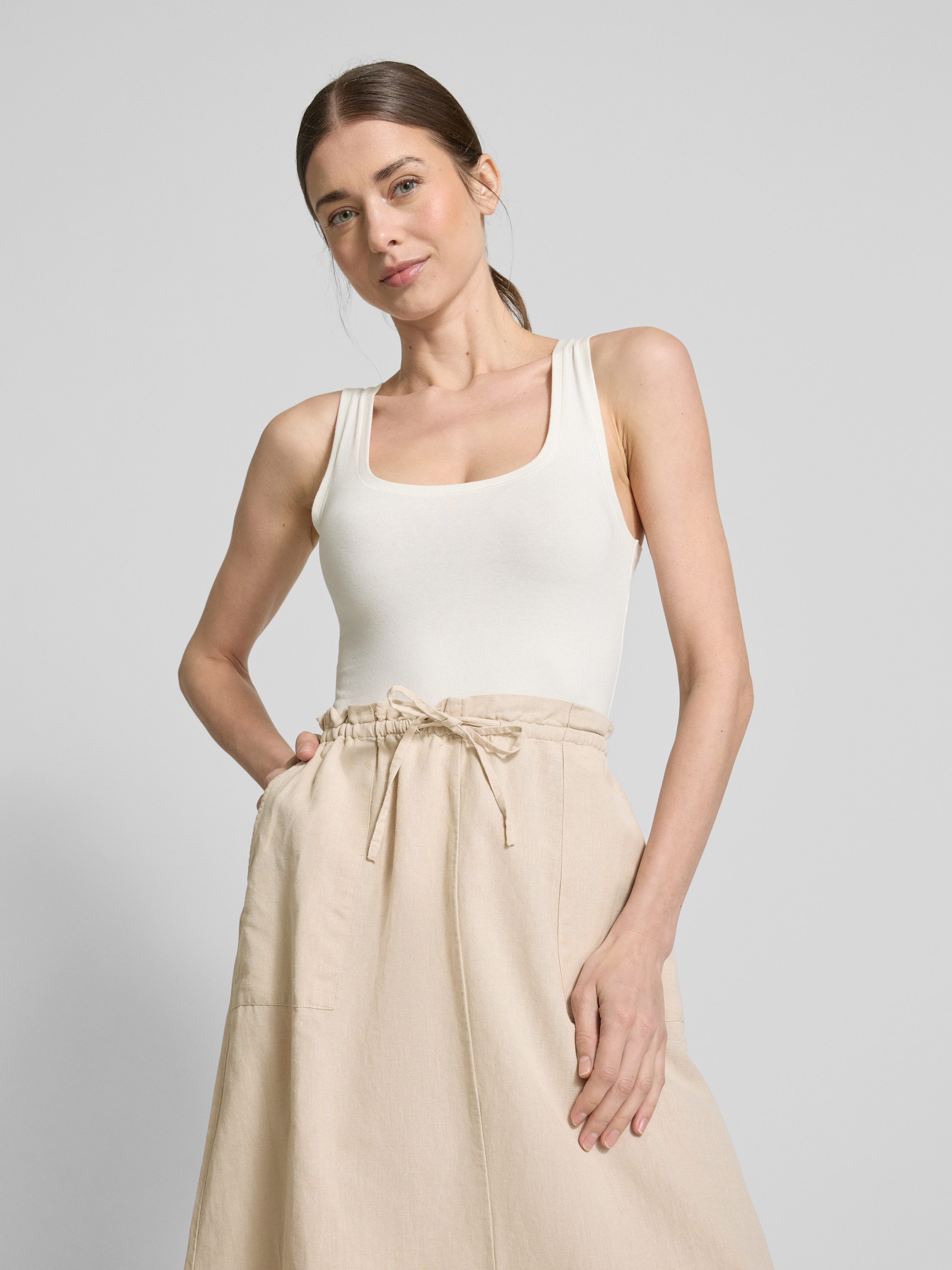 Der Leinenrock von Christian Berg Woman besteht aus reinem Leinen und überzeugt durch seine A-Linien-Silhouette, die eine schmeichelhafte Passform bietet. Der Gehschlitz sorgt für zusätzliche Bewegungsfreiheit, während der elastische Bund mit Tunnelzug einen angenehmen Sitz gewährleistet. Ein vielseitiger Midirock für verschiedene Anlässe.