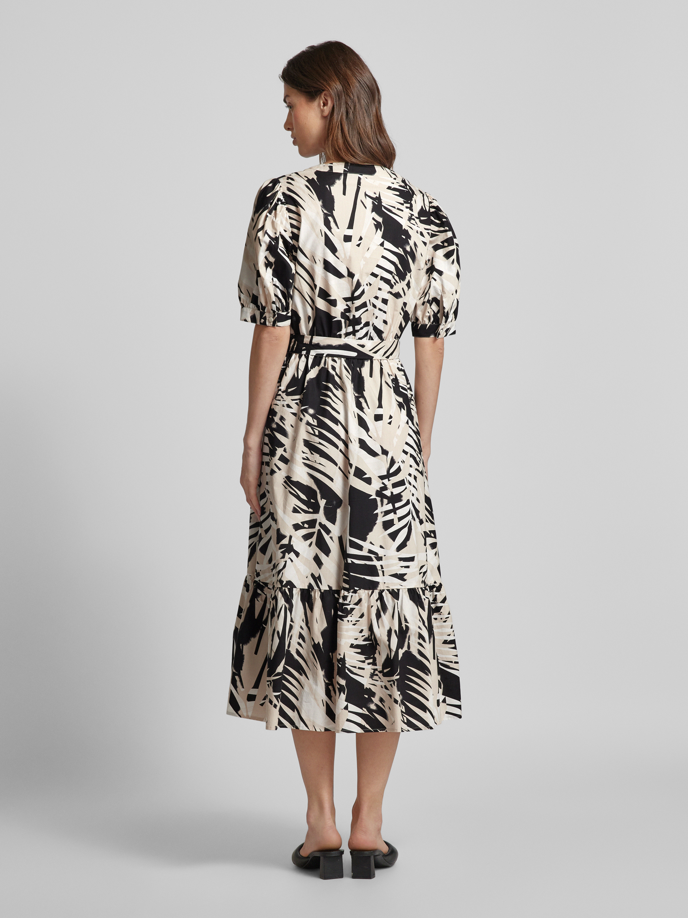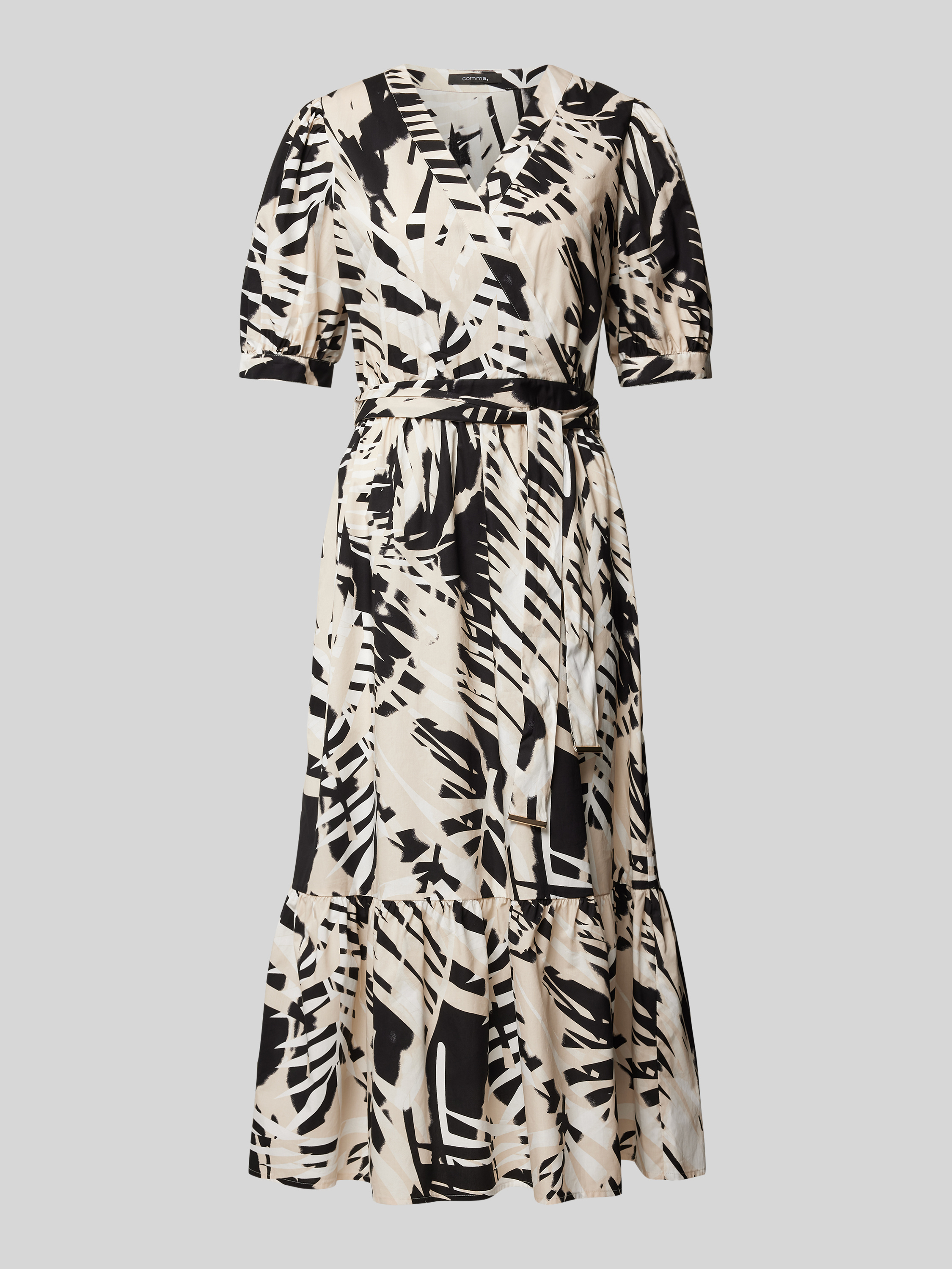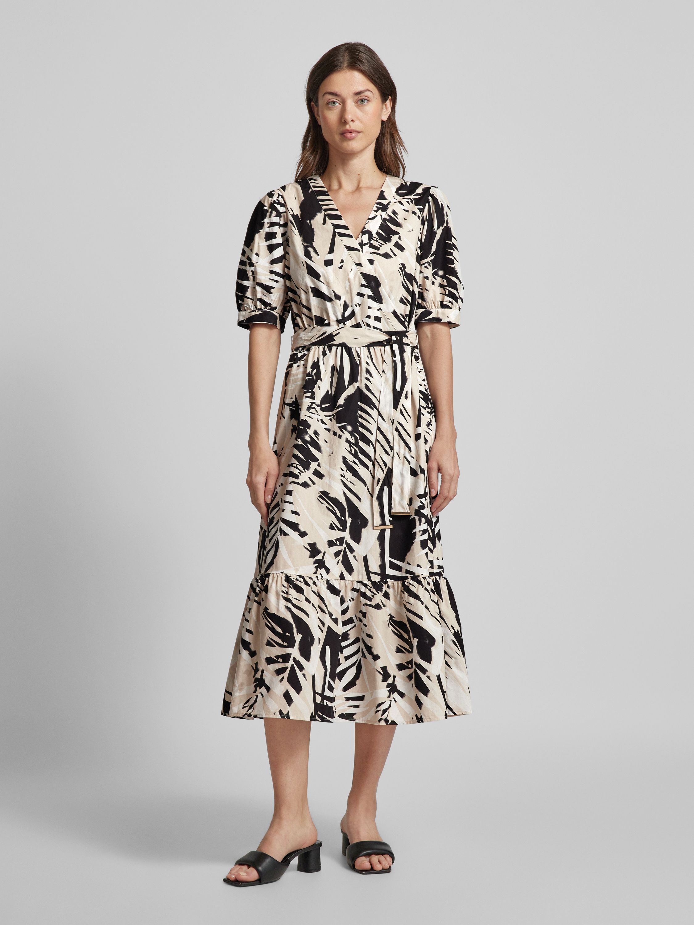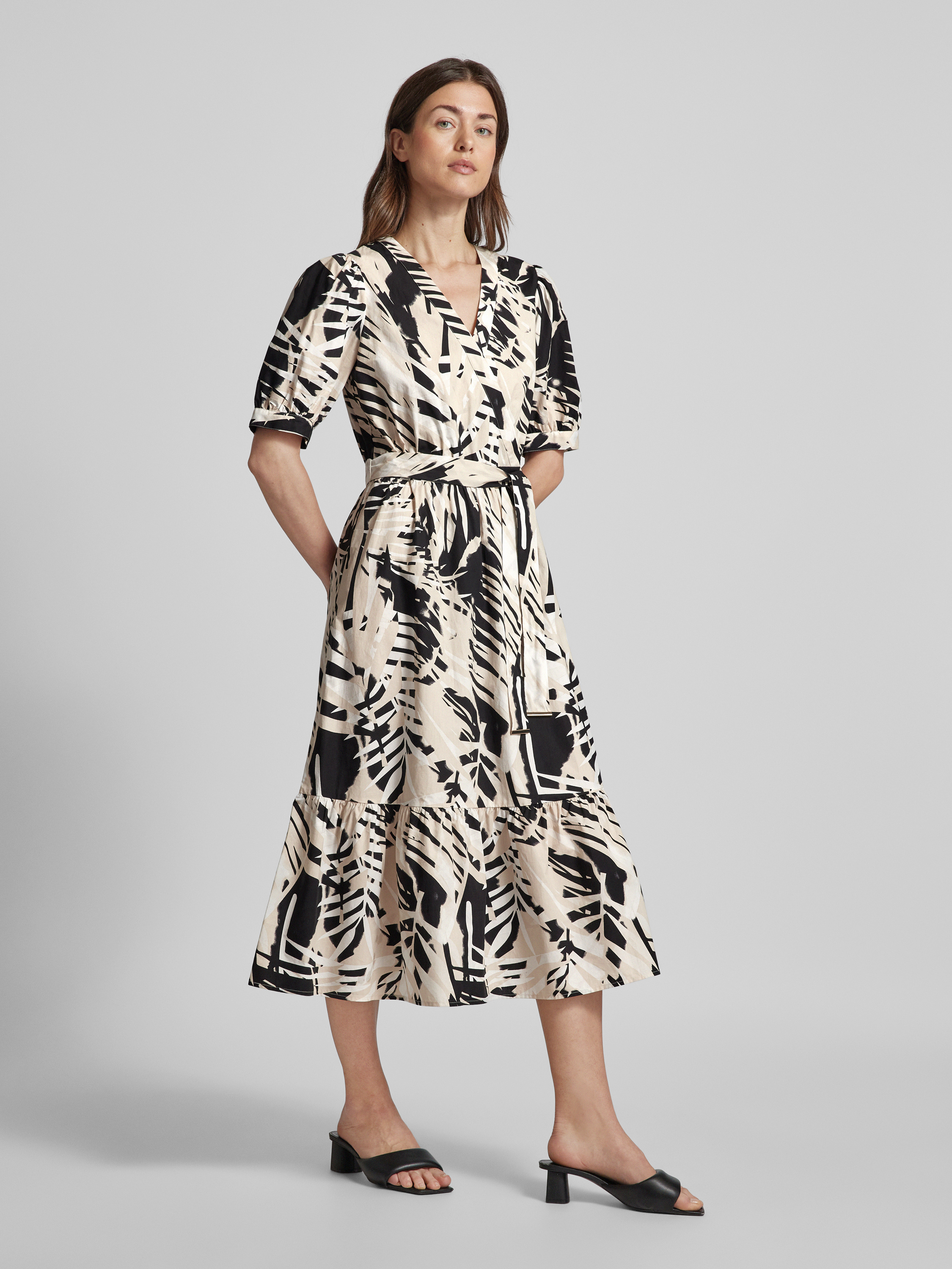 Das Damen Midikleid von comma aus reiner Baumwolle vereint Stil und Komfort mit einem taillierten Schnitt und einem charmanten Allover-Muster. Das raffinierte Schleifen-Detail und die Wickel-Optik unterstreichen die feminine Silhouette, während der V-Ausschnitt und die 1/2-Ärmel eine zeitlose Eleganz ausstrahlen.