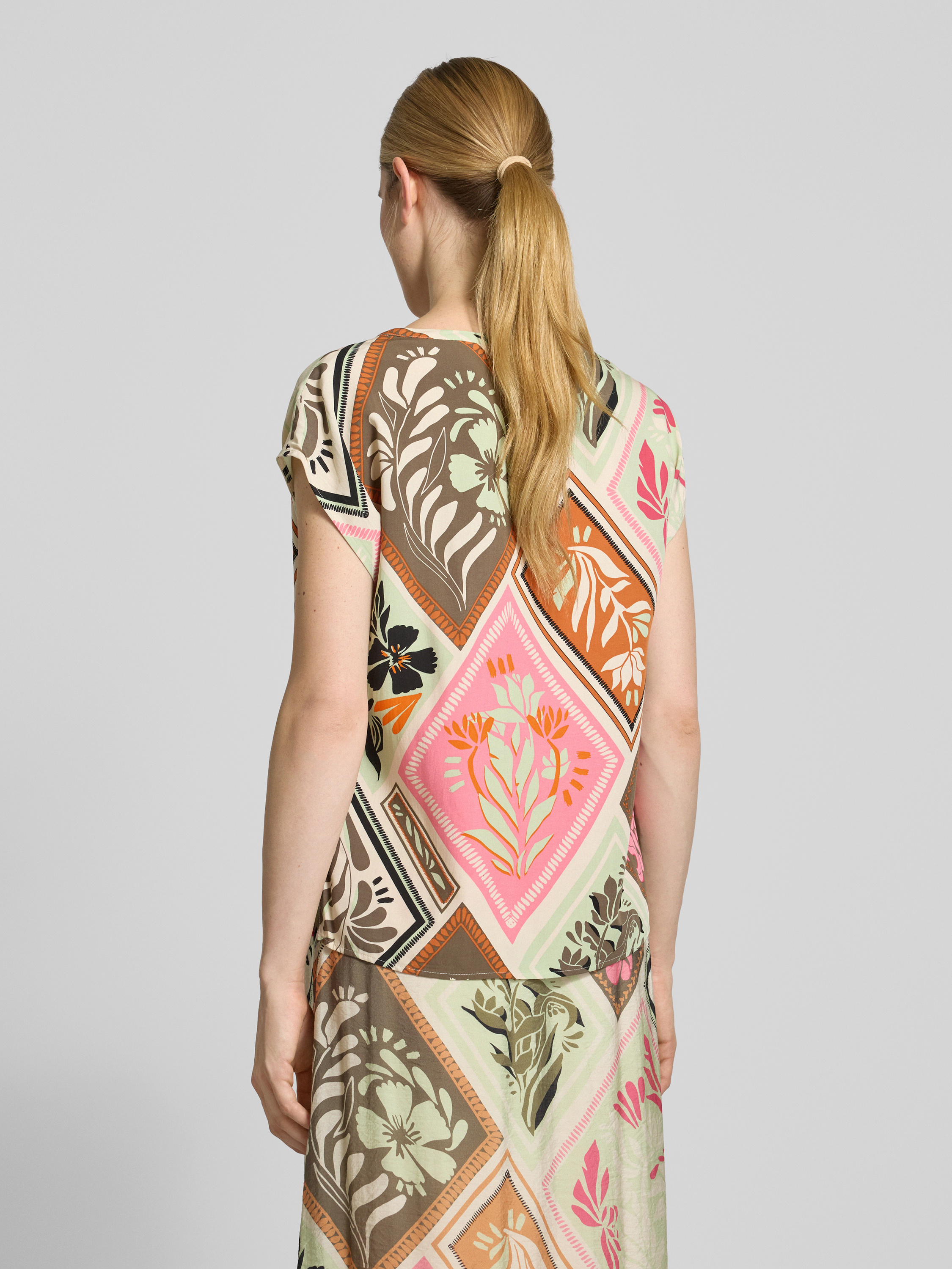 Das Blusenshirt von comma, aus reiner Viskose gefertigt, bietet mit seinem Regular Fit eine bequeme Passform, die Bewegungsfreiheit ermöglicht. Der V-Ausschnitt und die zarten Kappärmel verleihen dem Design eine elegante Note, ideal für vielseitige Kombinationen im Alltag.