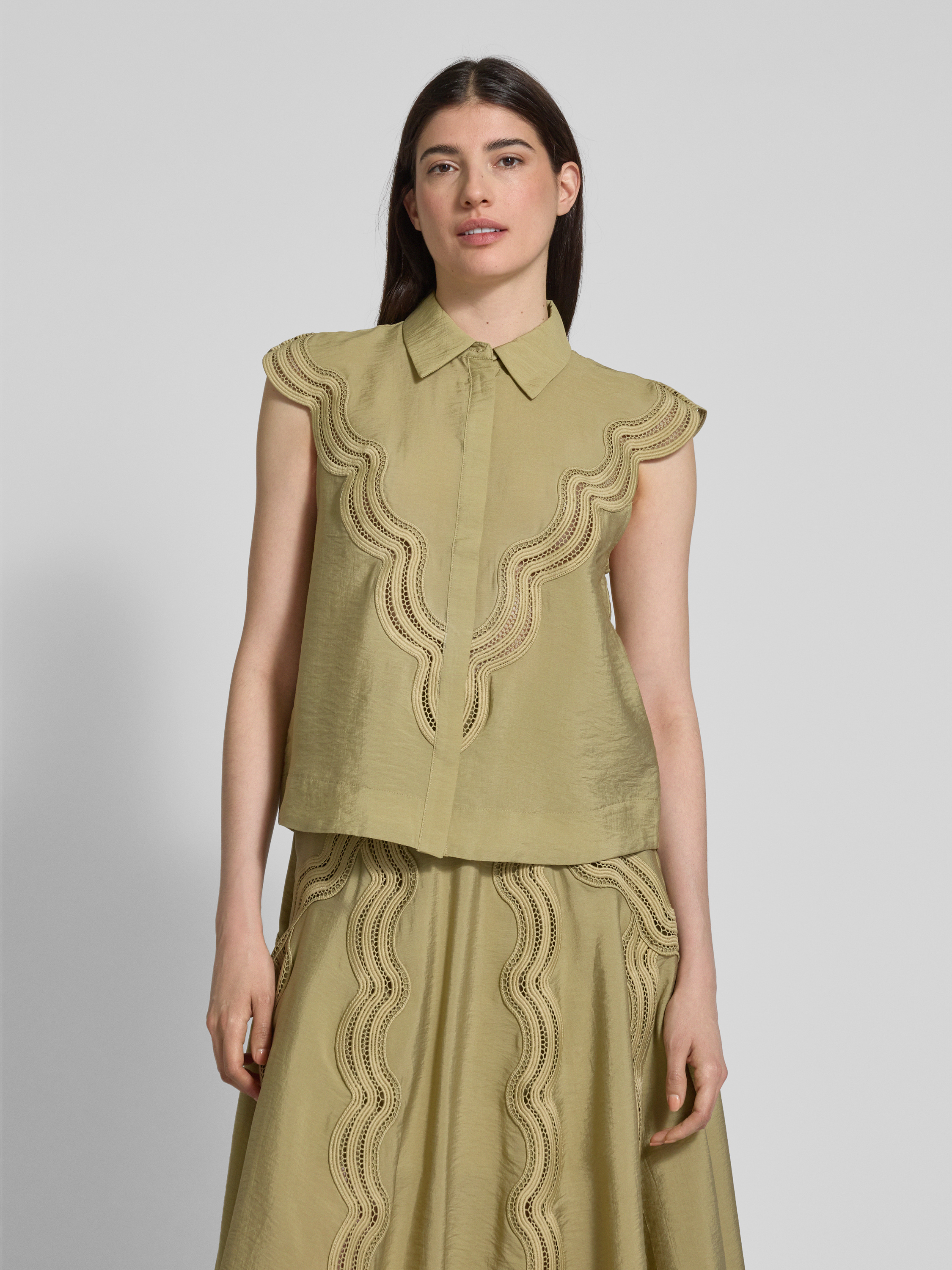 Das Slim Fit Blusenshirt 'COLE' von COPENHAGEN MUSE präsentiert sich in einem eleganten Modal-Mix, der einen angenehmen Tragekomfort bietet. Der Kentkragen verleiht dem ärmellosen Design eine klassische Note, während die Lochstickerei subtile Details hinzufügt. Ideal geeignet für einen stilvollen, aber entspannten Look.