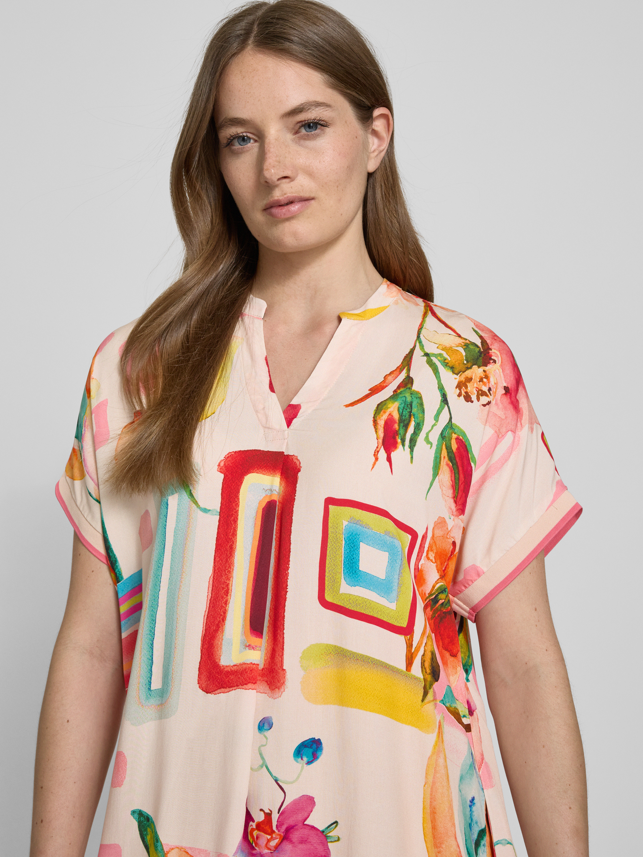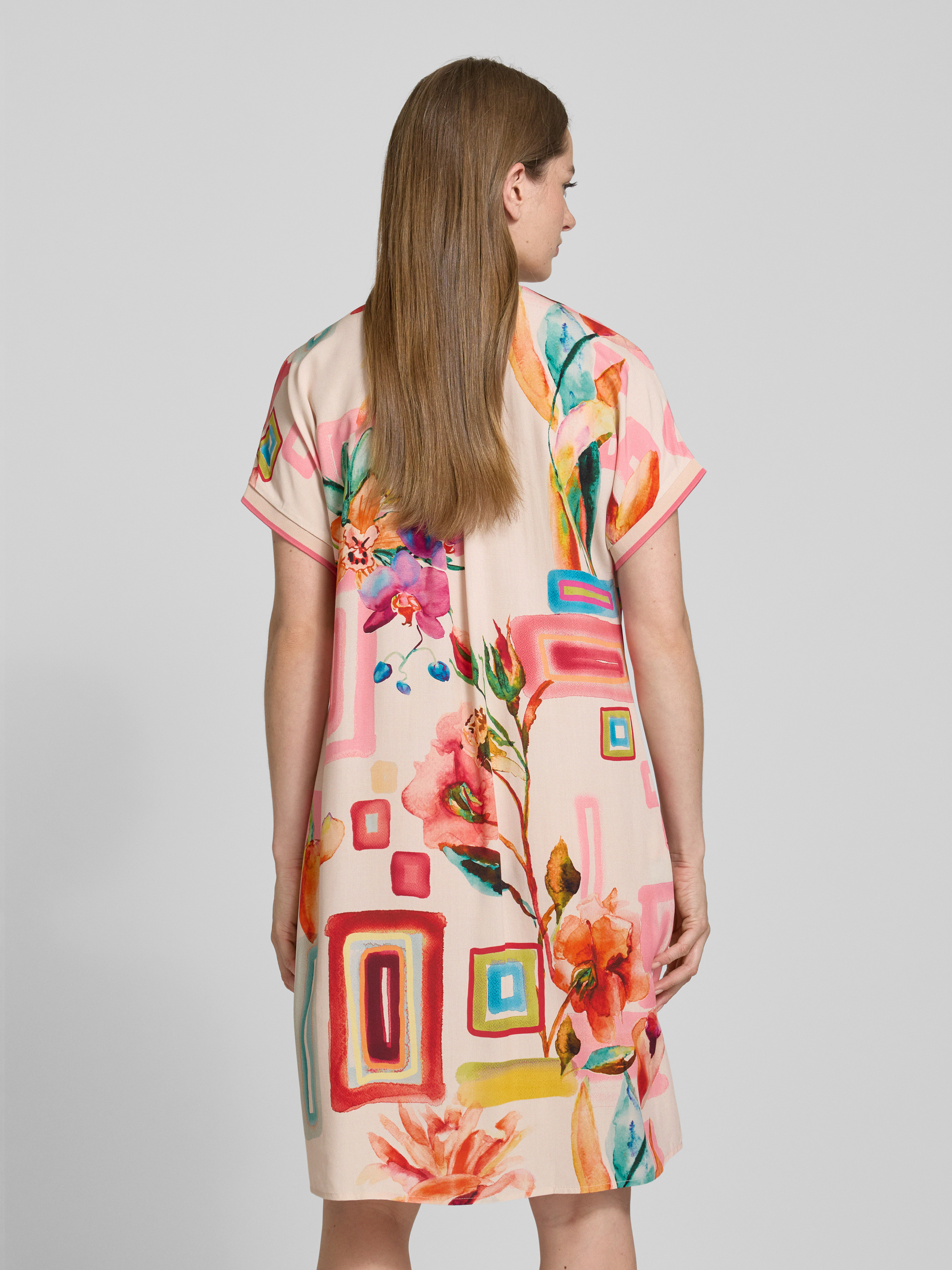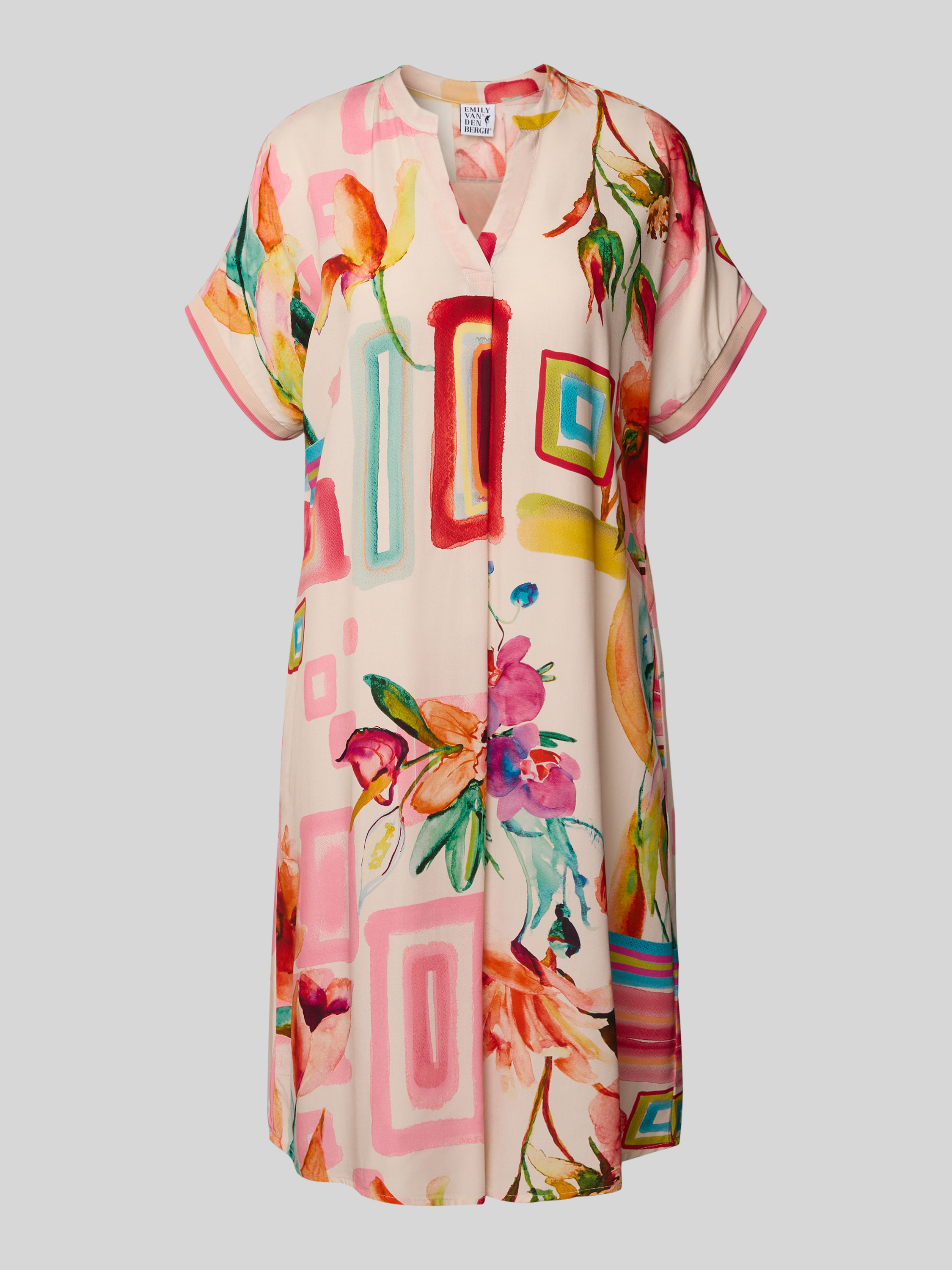 Das Emily Van den Bergh Kleid aus reiner Viskose vereint Komfort mit einem eleganten Design. Der gerade Schnitt und die knielange Passform sorgen für eine schmeichelhafte Silhouette. Der Tunikakragen und die Kappärmel verleihen dem Kleid einen lässigen und dennoch stilvollen Look.