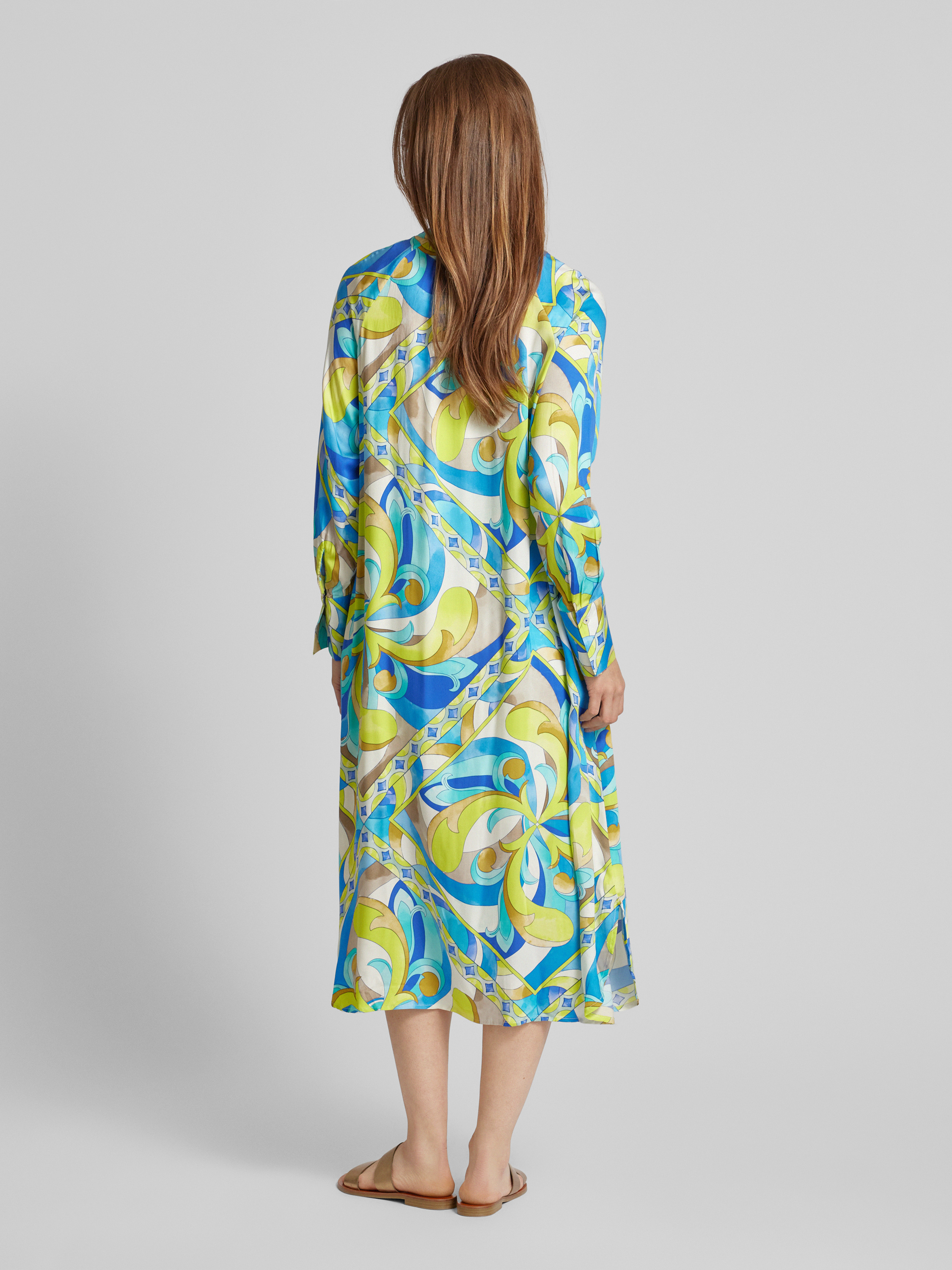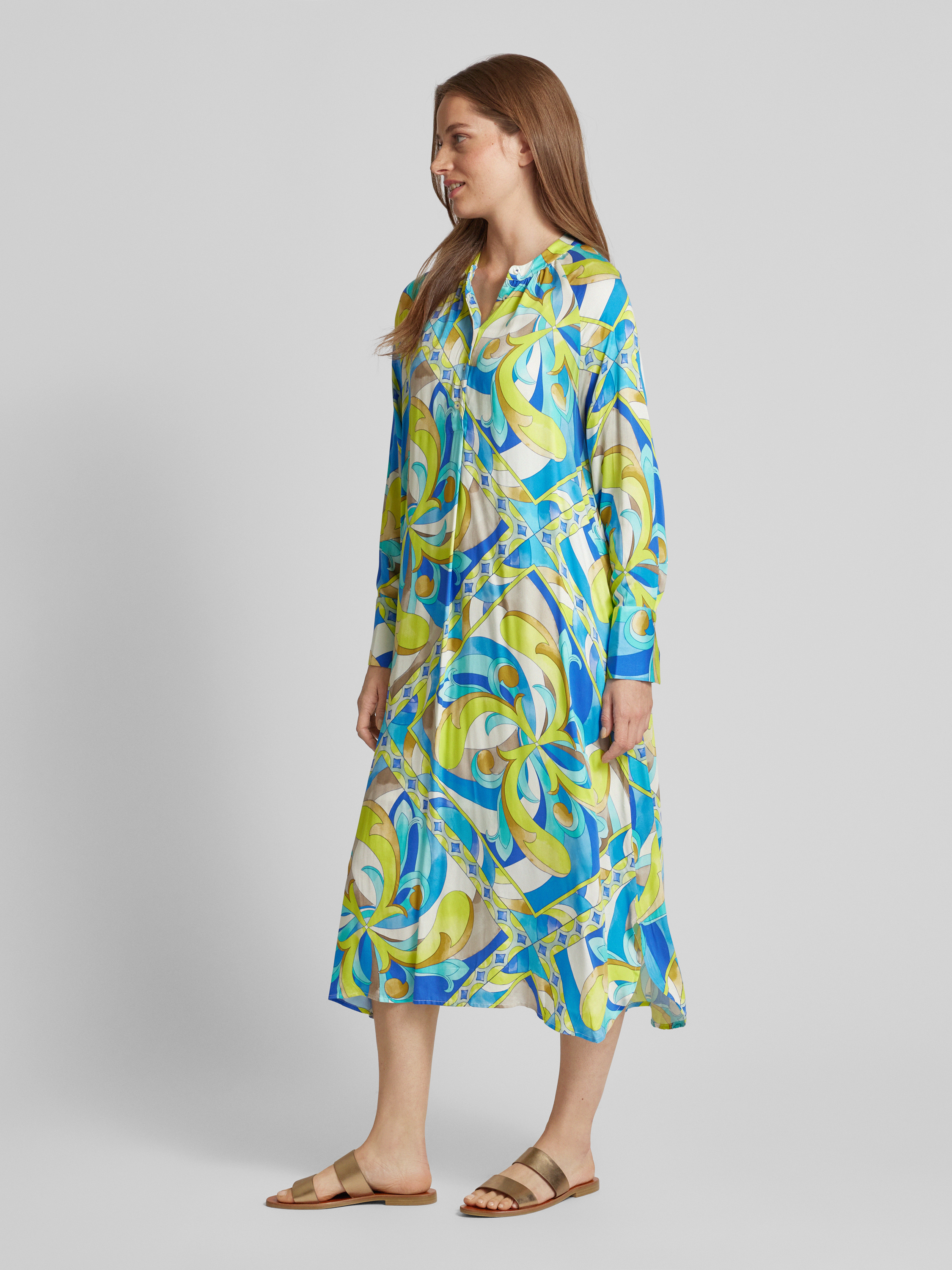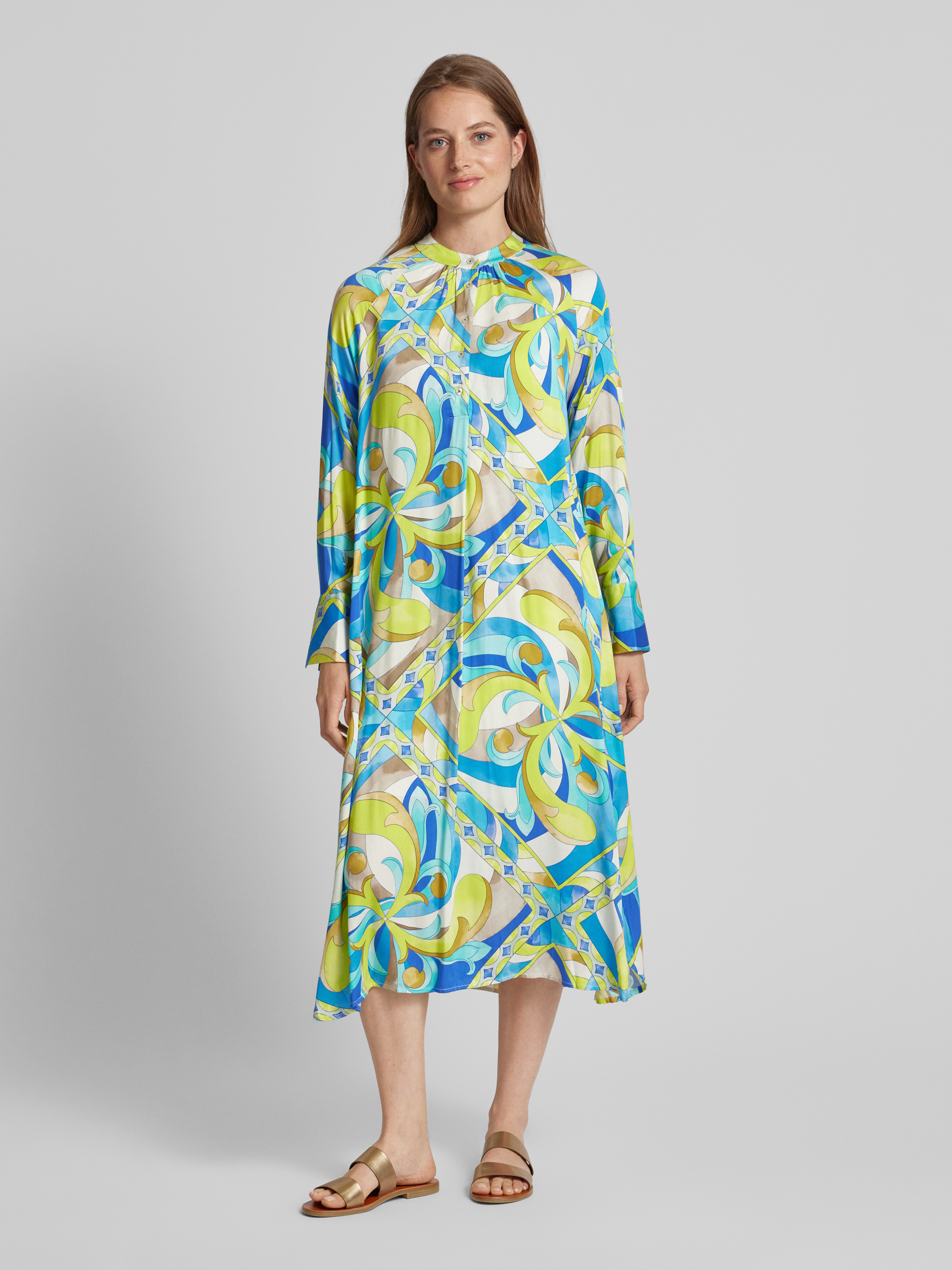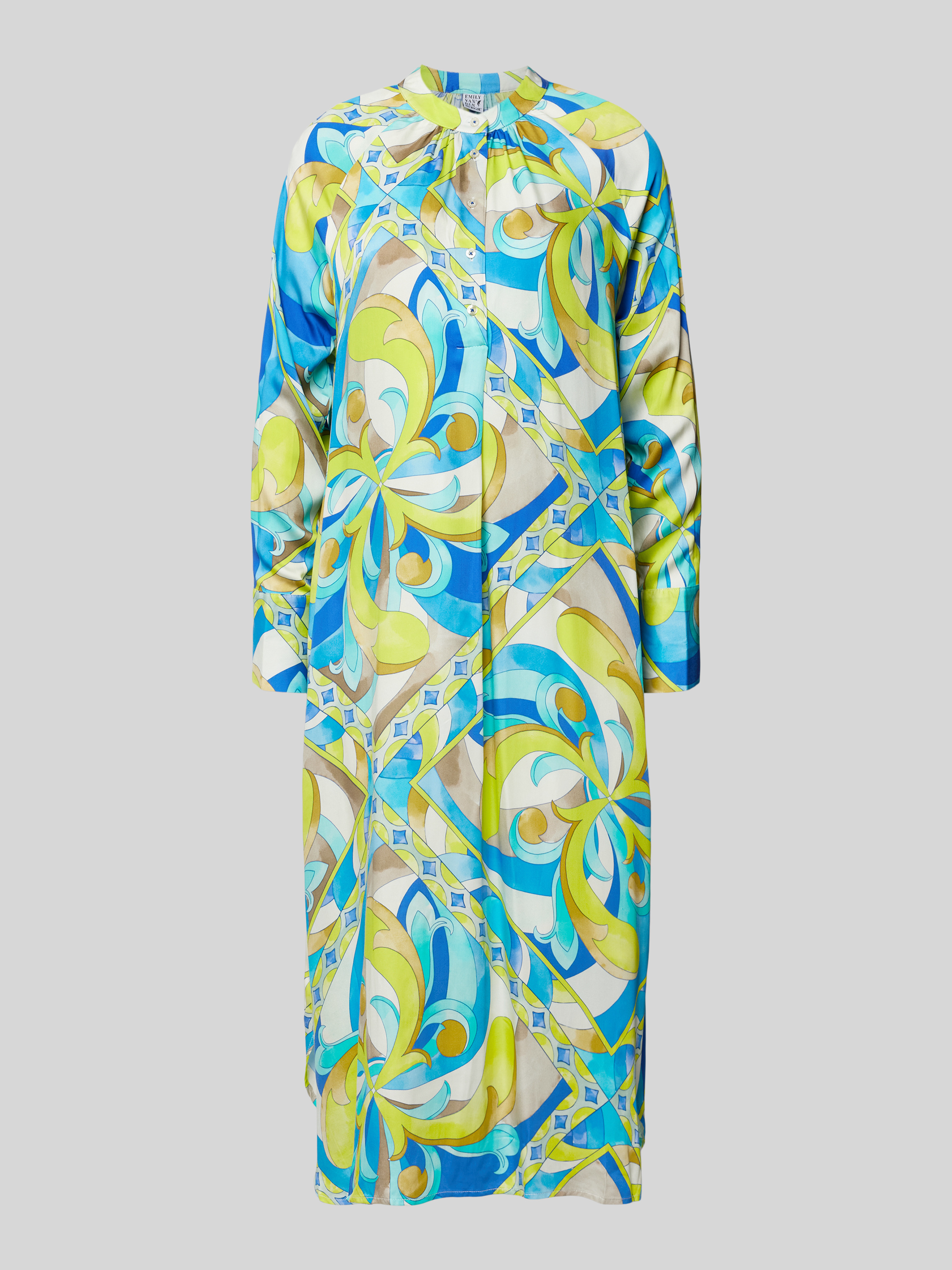 Das Midikleid von Emily Van den Bergh, gefertigt aus reiner Viskose, überzeugt durch seinen geraden Schnitt und den lebhaften Allover-Print. Der Maokragen verleiht dem Kleid eine dezente Eleganz, während der fließende Stoff angenehm auf der Haut liegt. Ideal für vielseitige Alltagskombinationen.