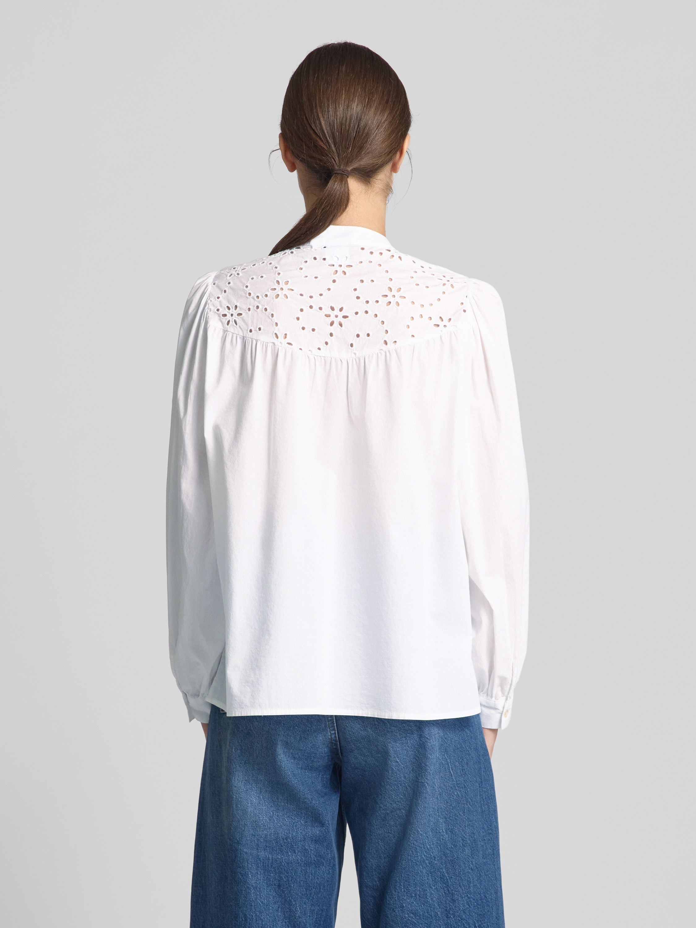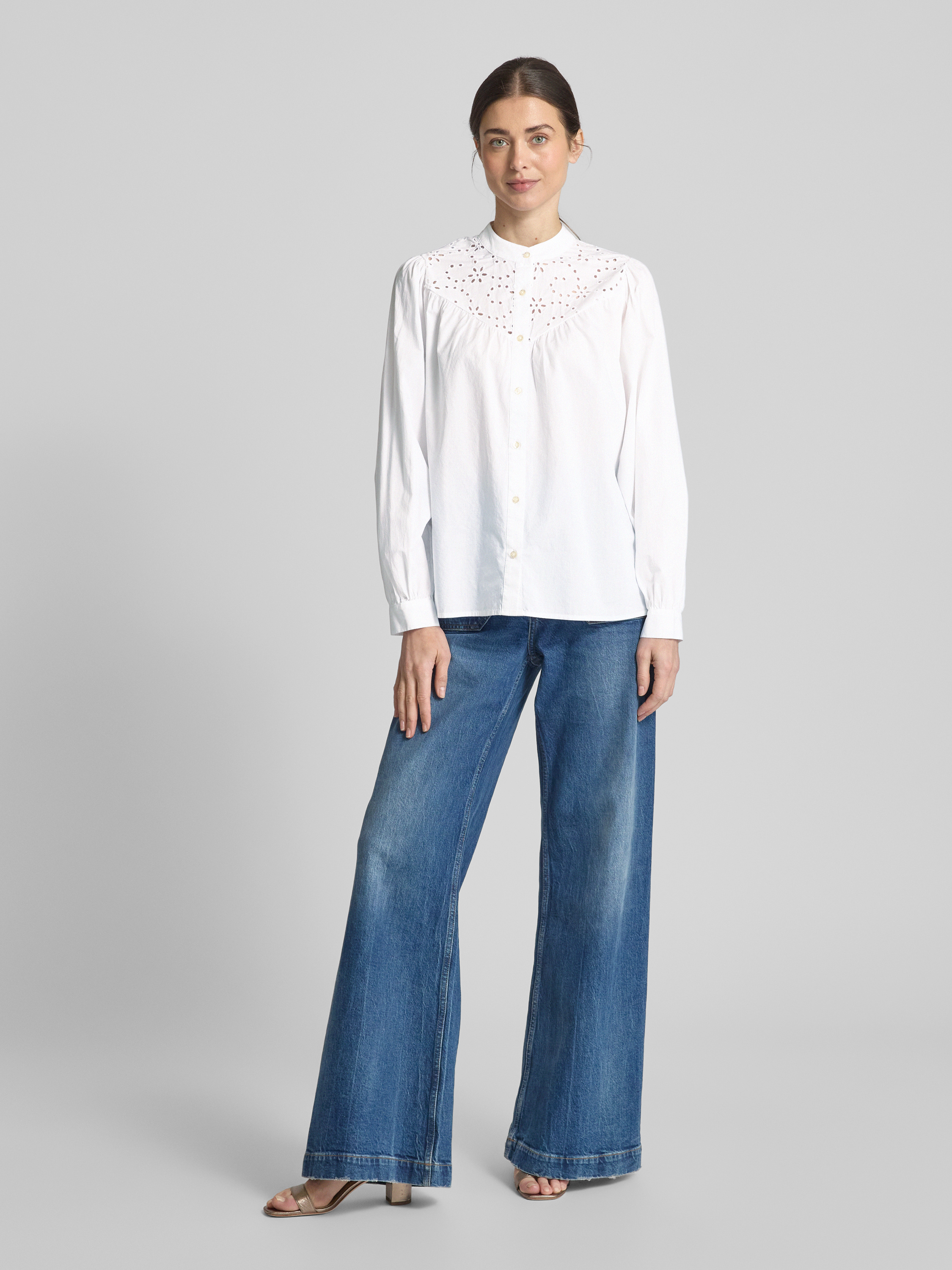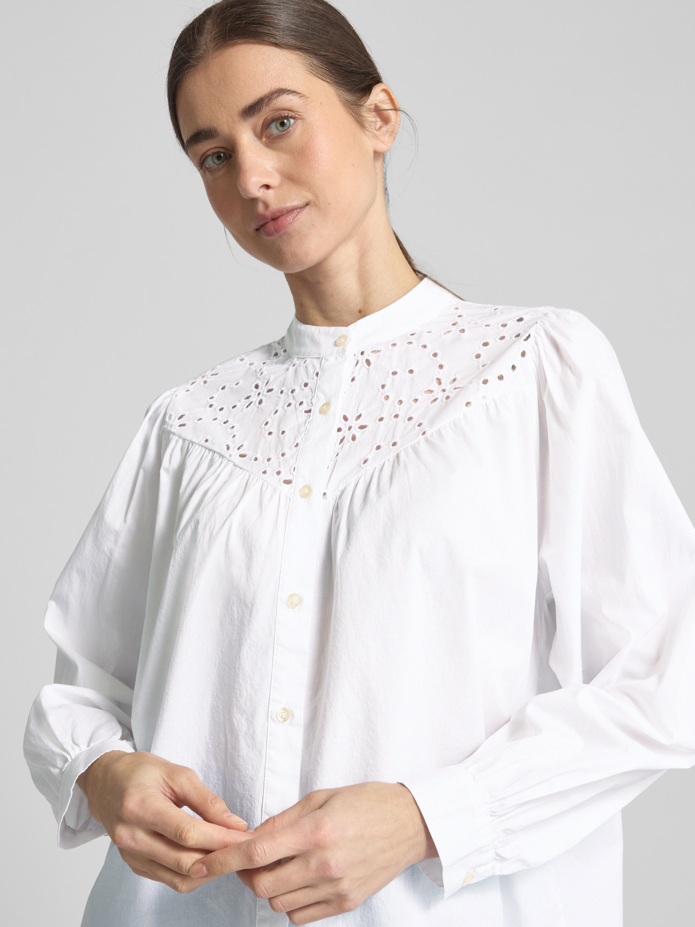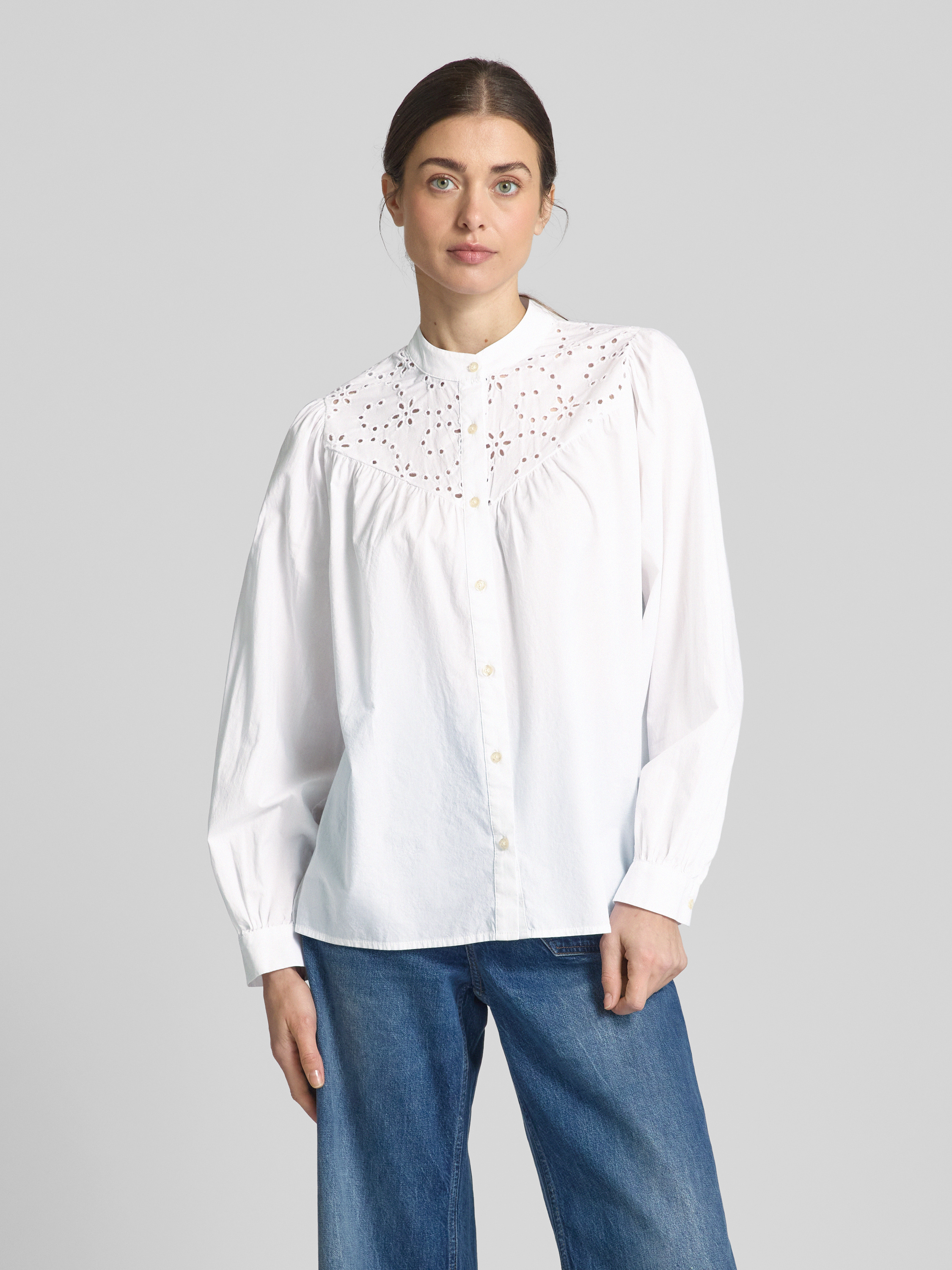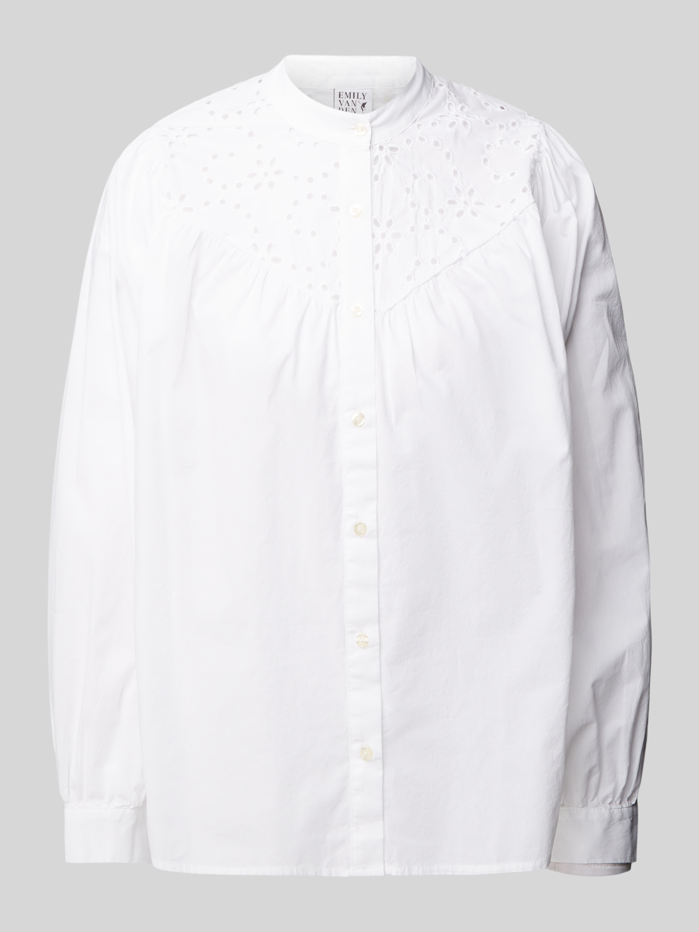Die Hemdbluse von Emily Van den Bergh, gefertigt aus einem Baumwoll-Mix, präsentiert sich in einem entspannten Schnitt, der durch den Maokragen und die Ballonärmel stilvoll ergänzt wird. Die dezente Lochstickerei verleiht dem Design eine besondere Note. Der lockere Schnitt sorgt für angenehmen Tragekomfort.