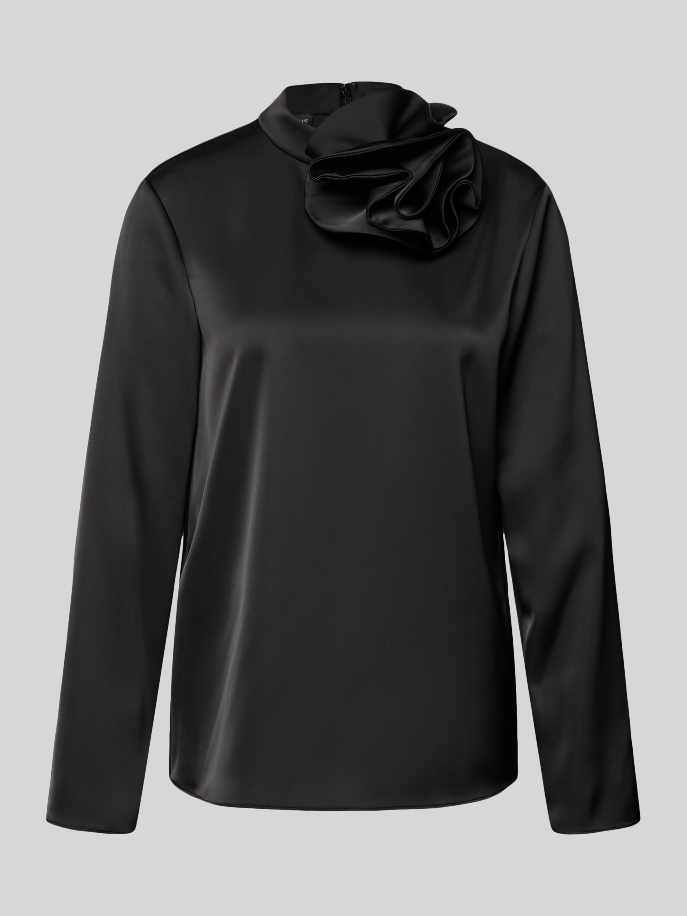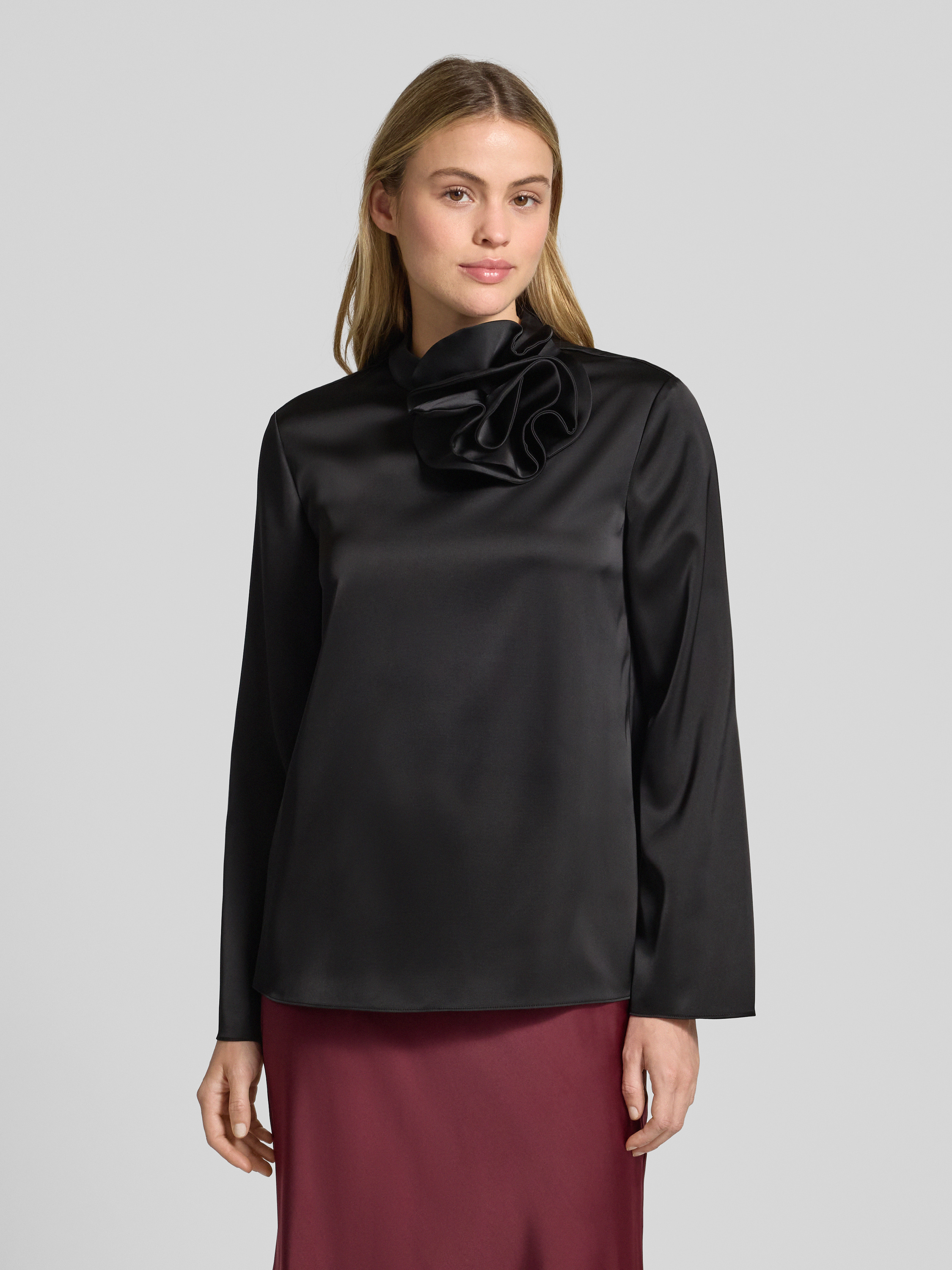 Das Damen Blusenshirt von Emporio Armani zeigt durch den geraden Schnitt und den Stehkragen eine klare Linie, während das Rüschen-Detail für einen feinen Akzent sorgt. Das langärmelige Design eignet sich an kühleren Tagen ebenso wie im Büro. So entsteht ein Kleidungsstück, das Bewegungsfreiheit mit einem besonderen Detail verbindet.