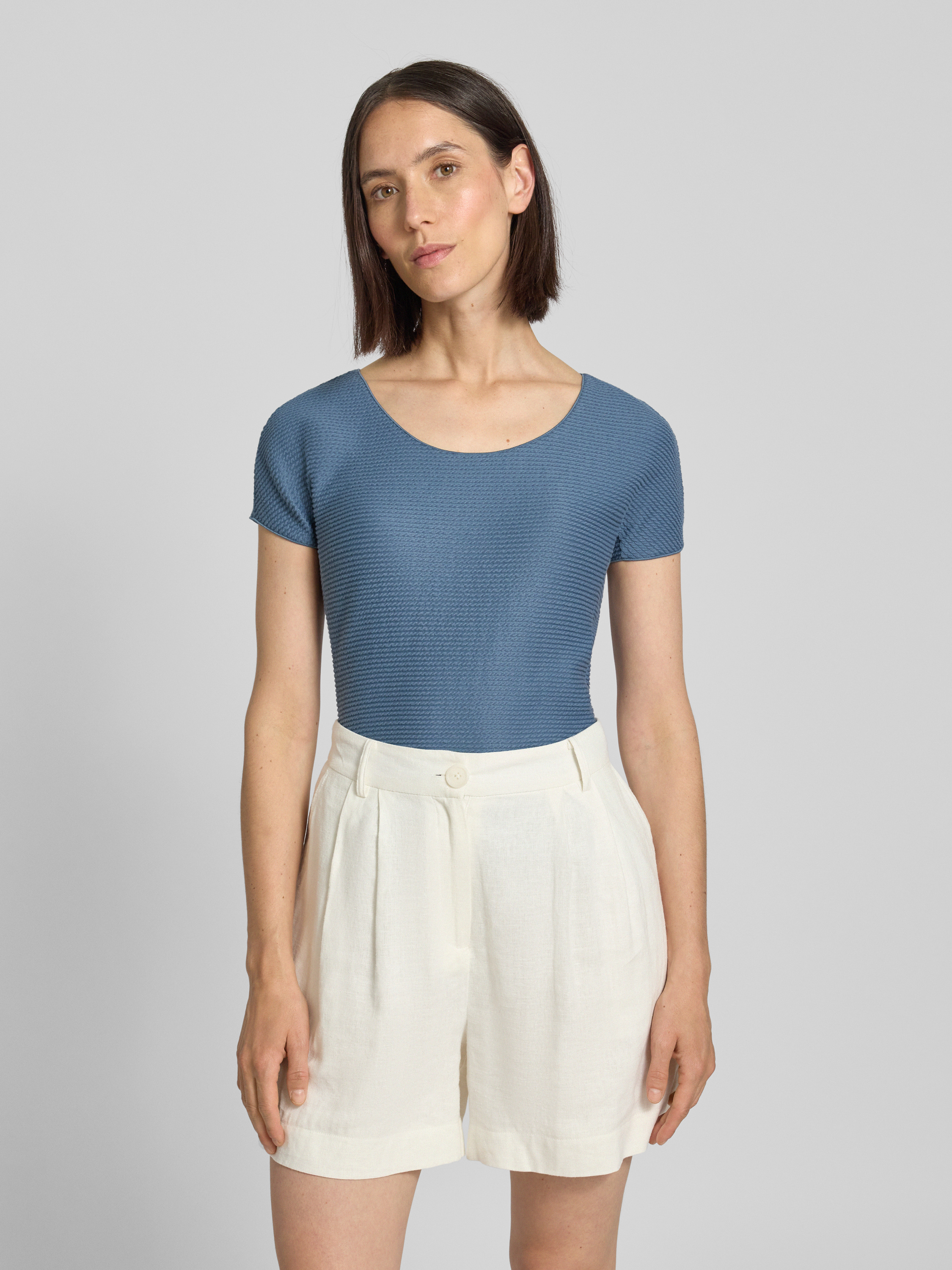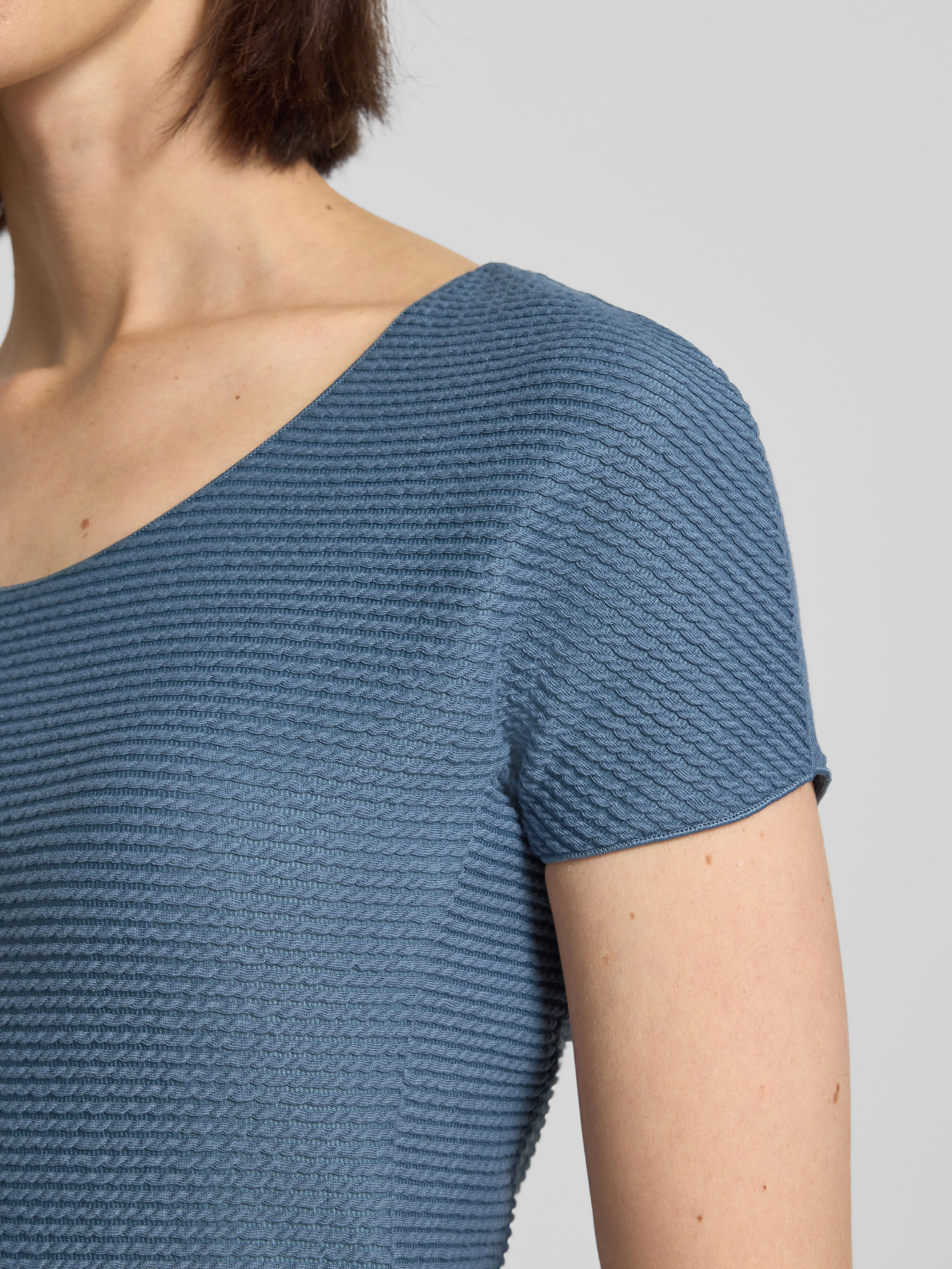 Das Damen T-Shirt von Emporio Armani kombiniert einen Baumwoll-Mix mit Stretch-Anteil, was eine flexible Passform im Slim Fit ermöglicht. Das feine Strukturmuster verleiht dem T-Shirt einen besonderen Akzent. Ein klassischer Rundhalsausschnitt rundet das Design elegant ab.