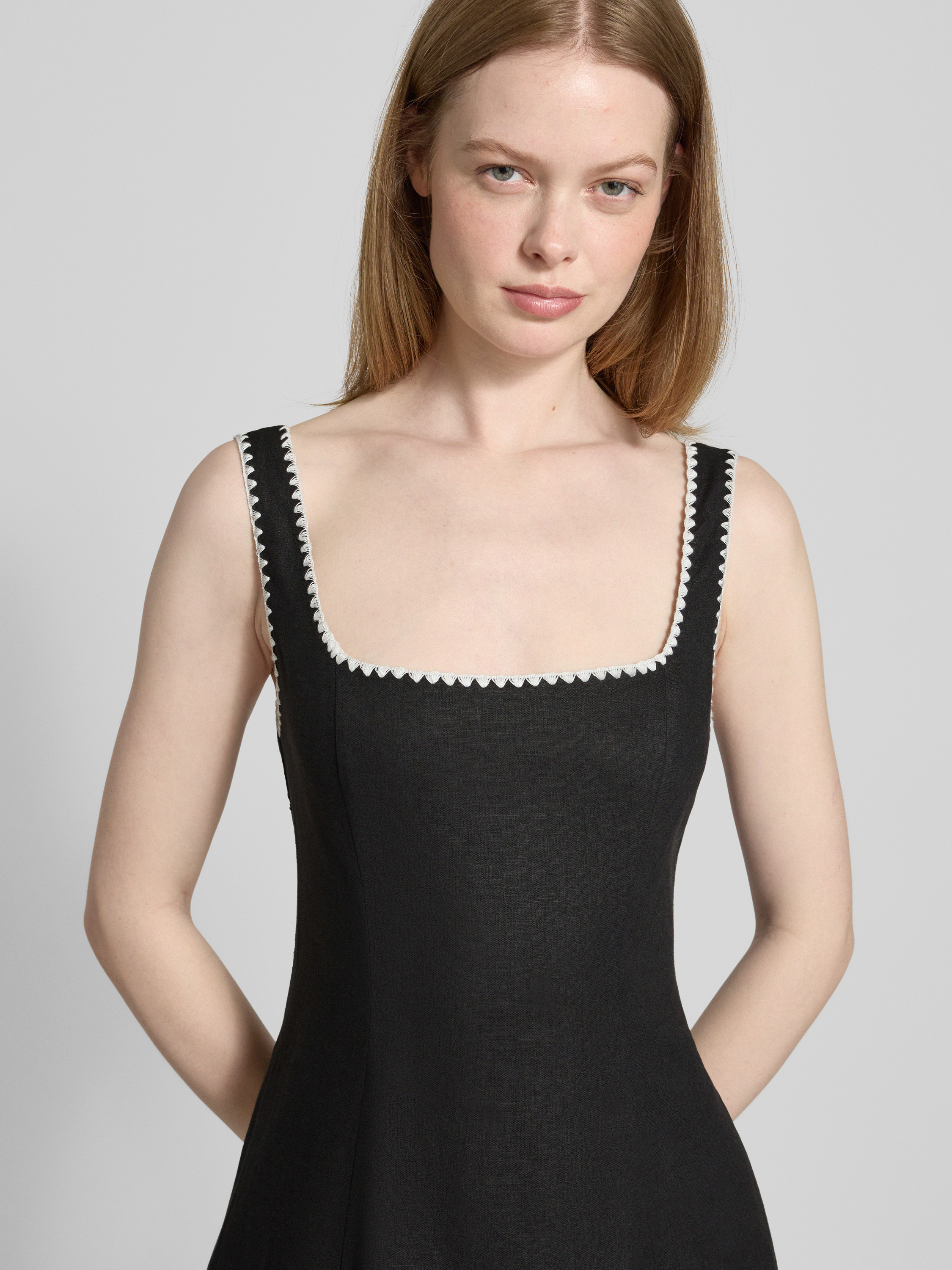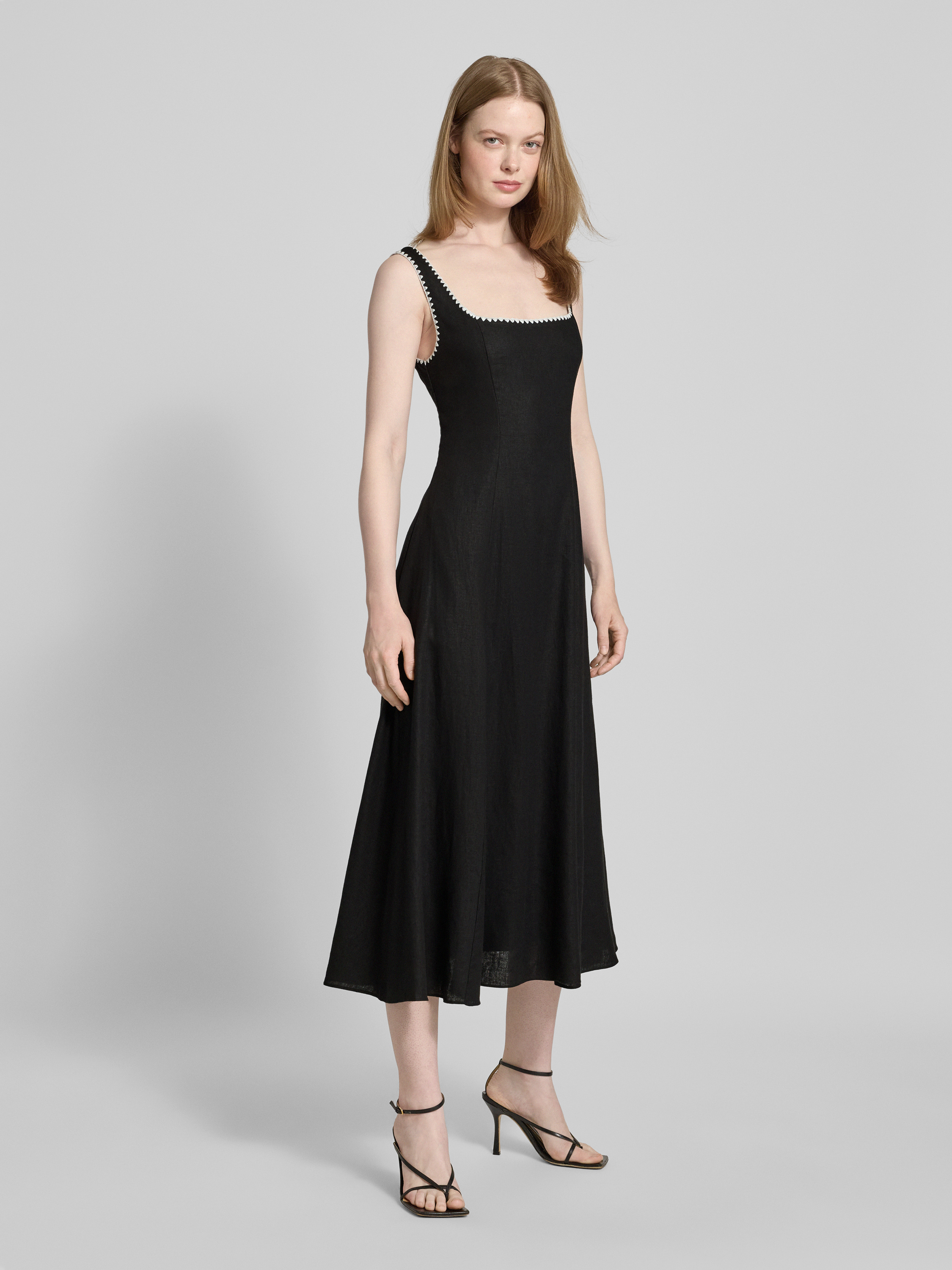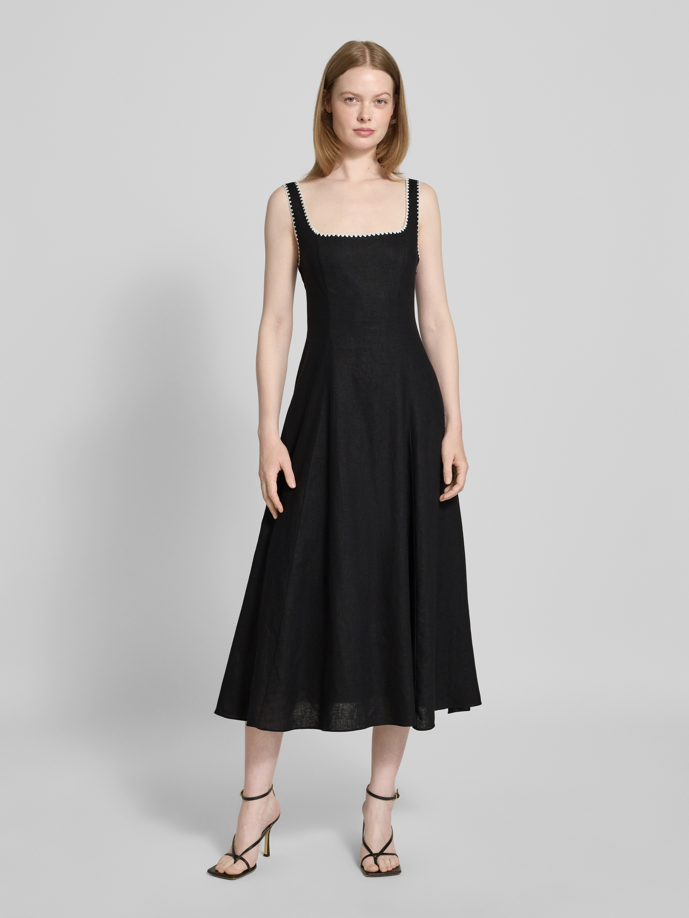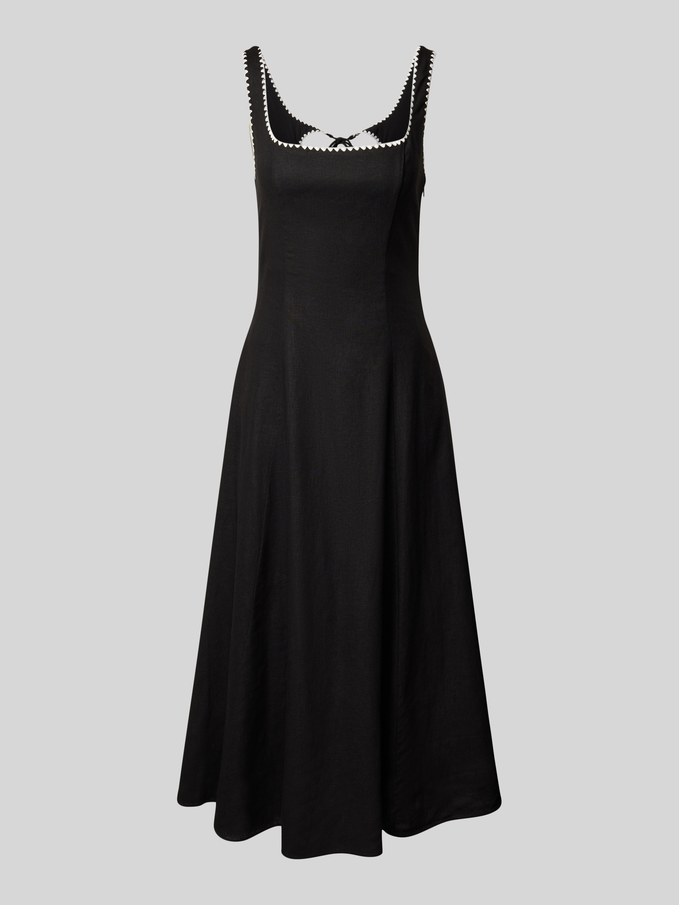 Das Midikleid 'Solene' von Forever New kombiniert einen eleganten Leinen-Viskose-Mix mit einer schmeichelnden A-Linie. Der Karree-Ausschnitt setzt stilvolle Akzente, während die rückseitige Schnürung für eine individuelle Passform sorgt. Ideal für warme Tage, bietet es Komfort und einen modernen Look.