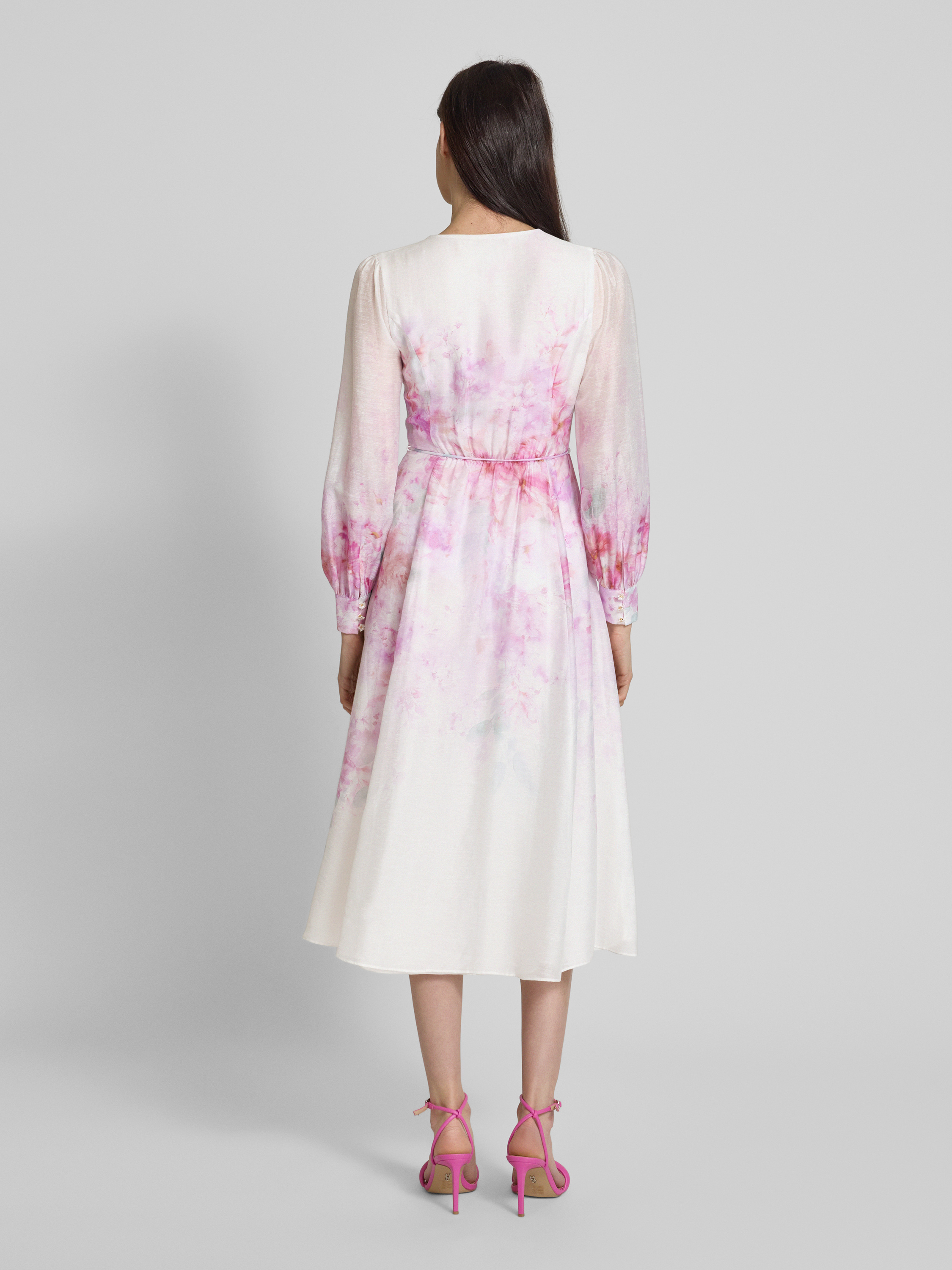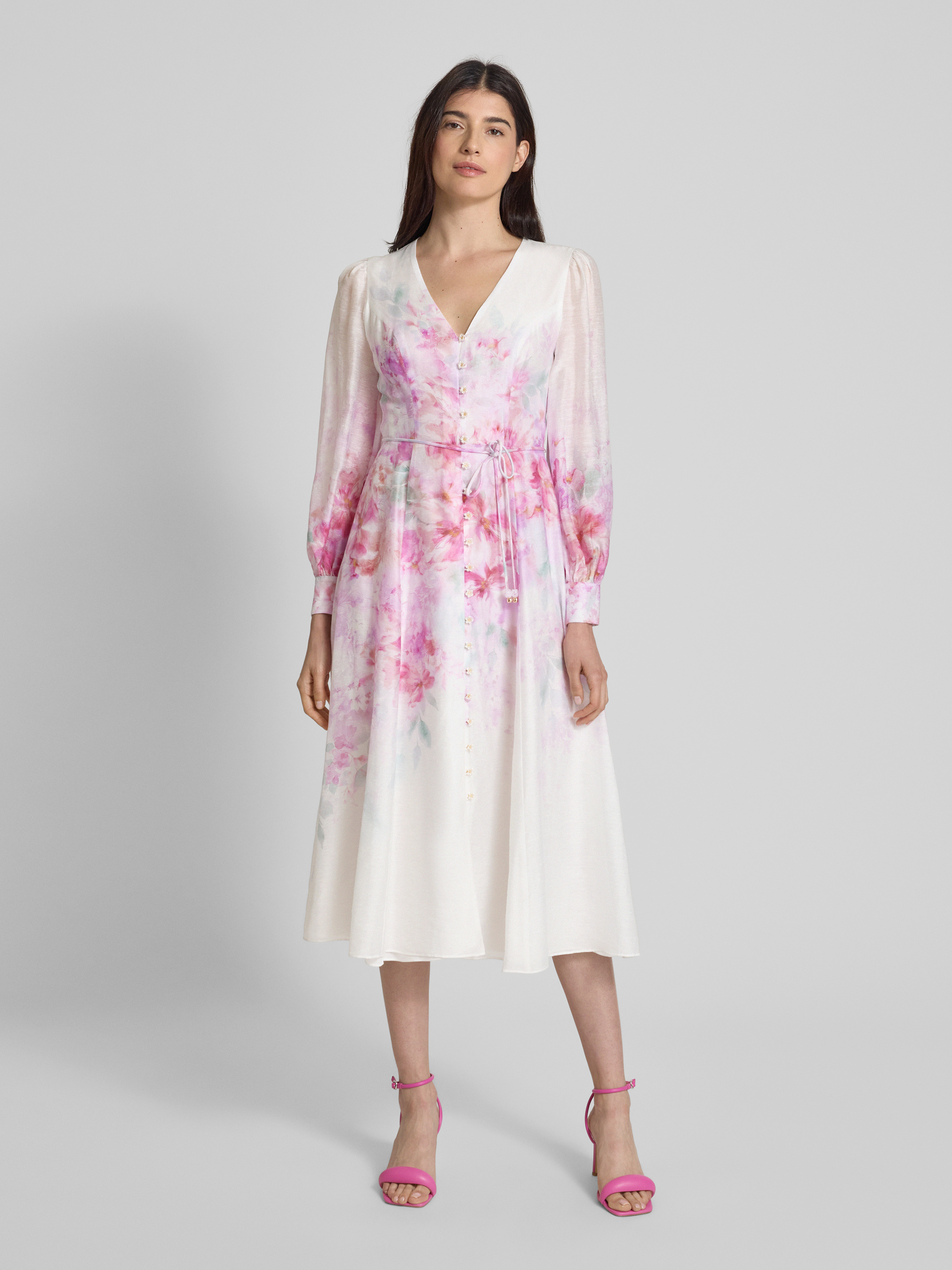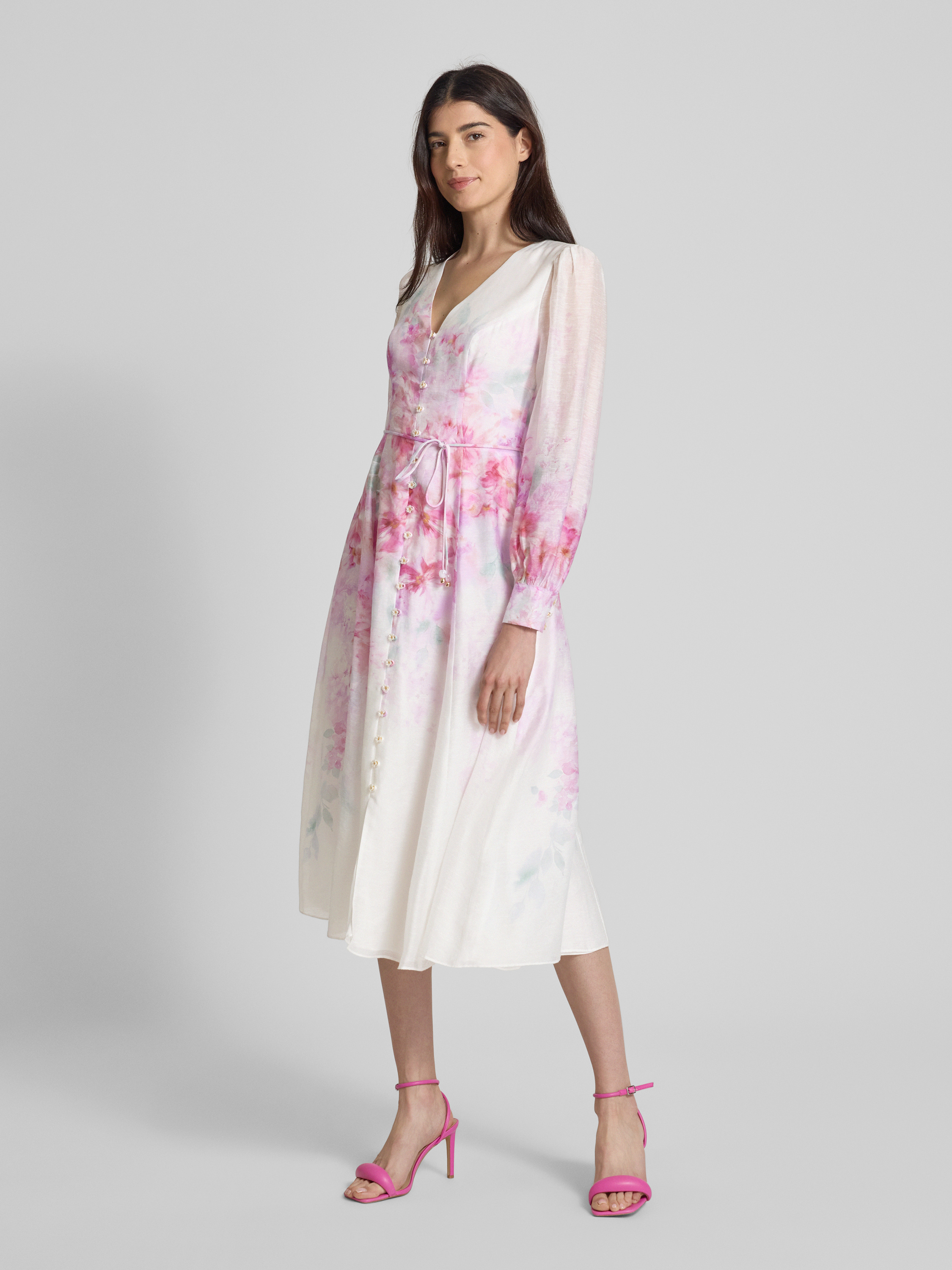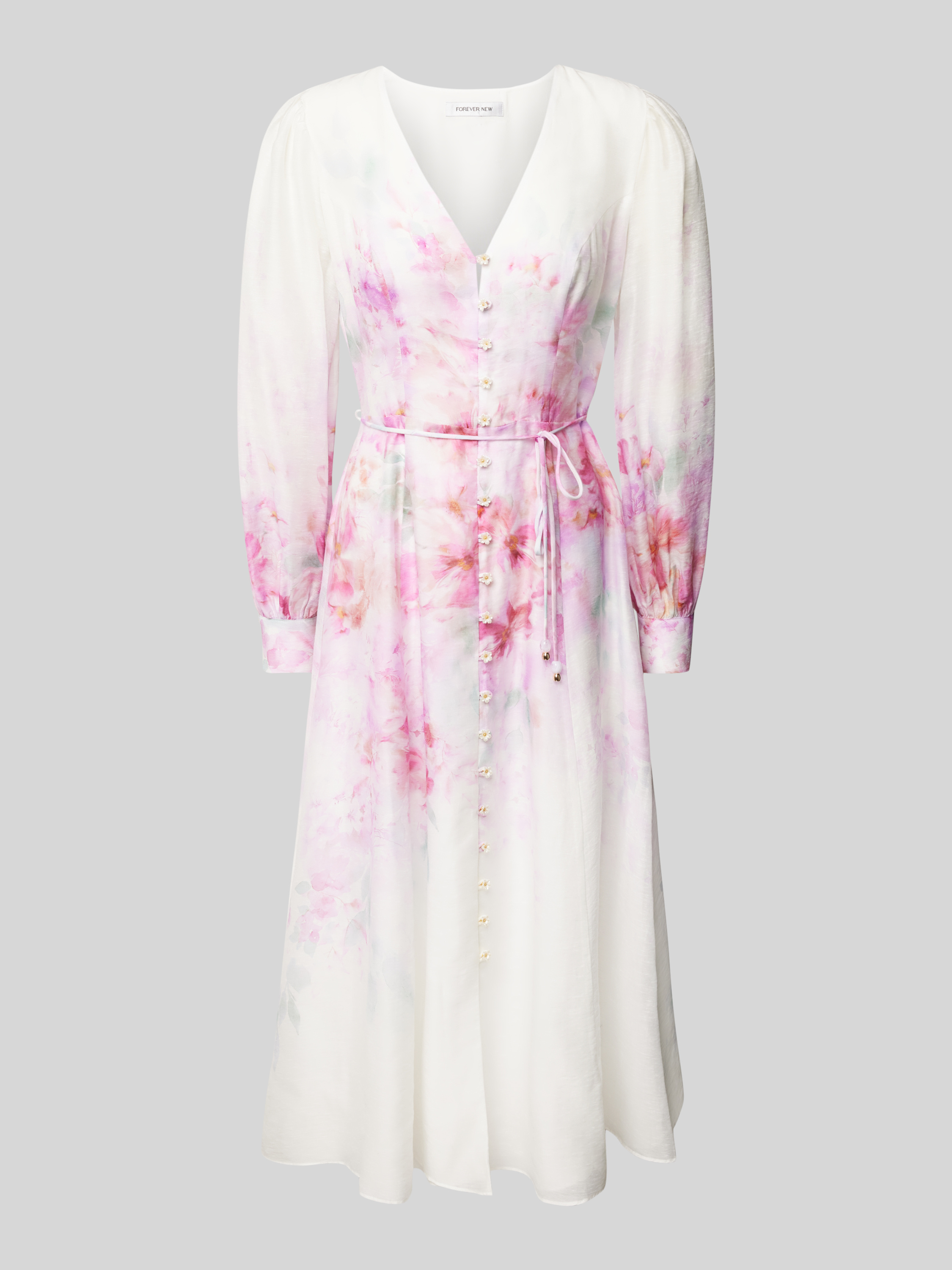 Das taillierte Abendkleid von Forever New verbindet stilvolle Eleganz mit angenehmem Tragekomfort. Der Lyocell-Mix mit Leinen-Anteil verleiht dem Midikleid eine leichte, atmungsaktive Qualität. Ein Bindegürtel betont die Taille, während der V-Ausschnitt und Ballonärmel dem Design eine feminine Note verleihen.