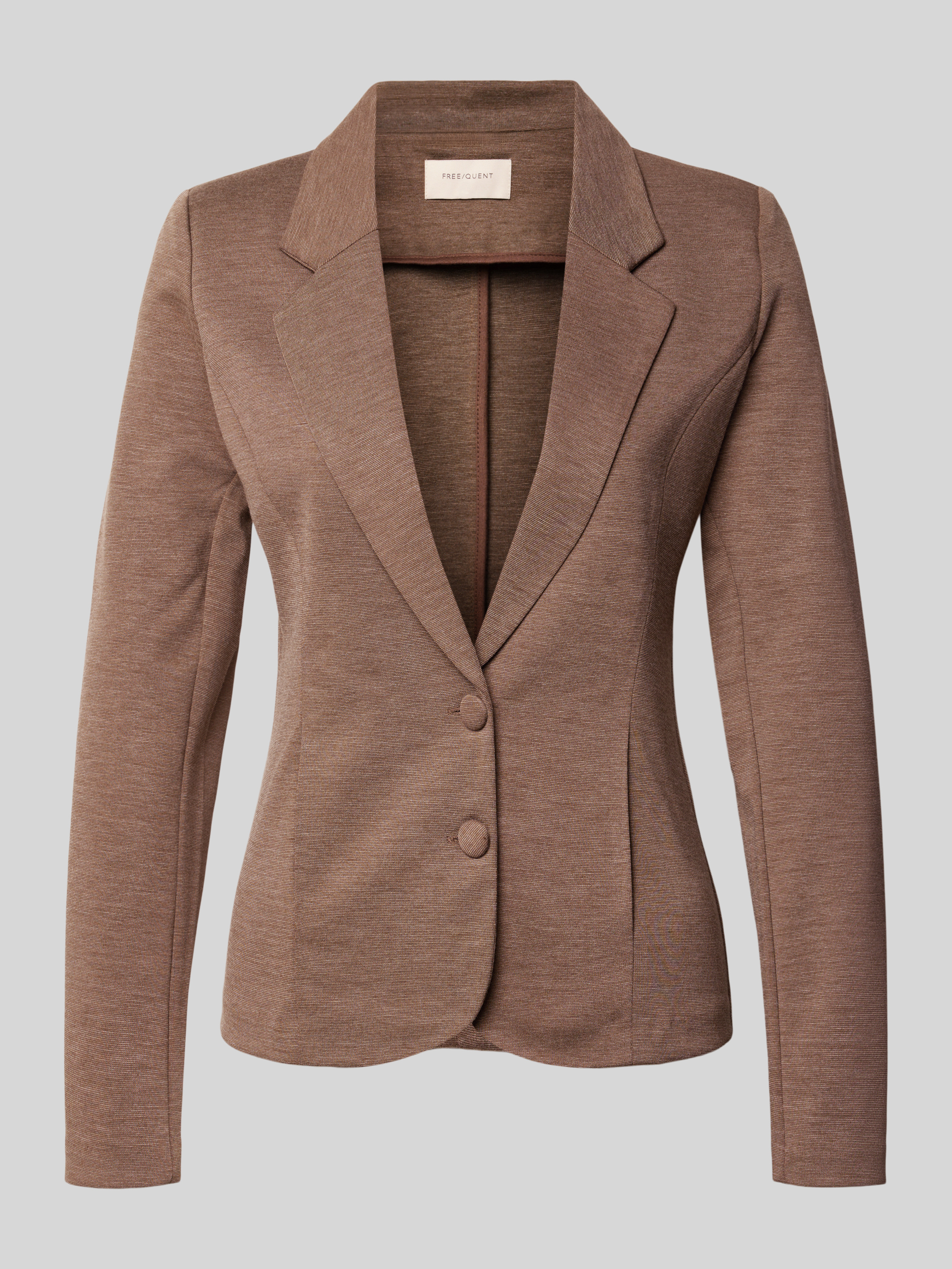 Der Damen Blazer von FREE/QUENT präsentiert sich im Modell 'NANNI' mit einem klassischen Reverskragen und eng anliegendem Schnitt, wodurch eine moderne Silhouette entsteht. Durch den Material-Mix mit Viskose-Anteil fühlt sich das Gewebe angenehm glatt an und trägt sich leicht. So eignet sich der Blazer mit Reverskragen Modell 'NANNI' besonders für vielfältige Kombinationen im Alltag und Büro.