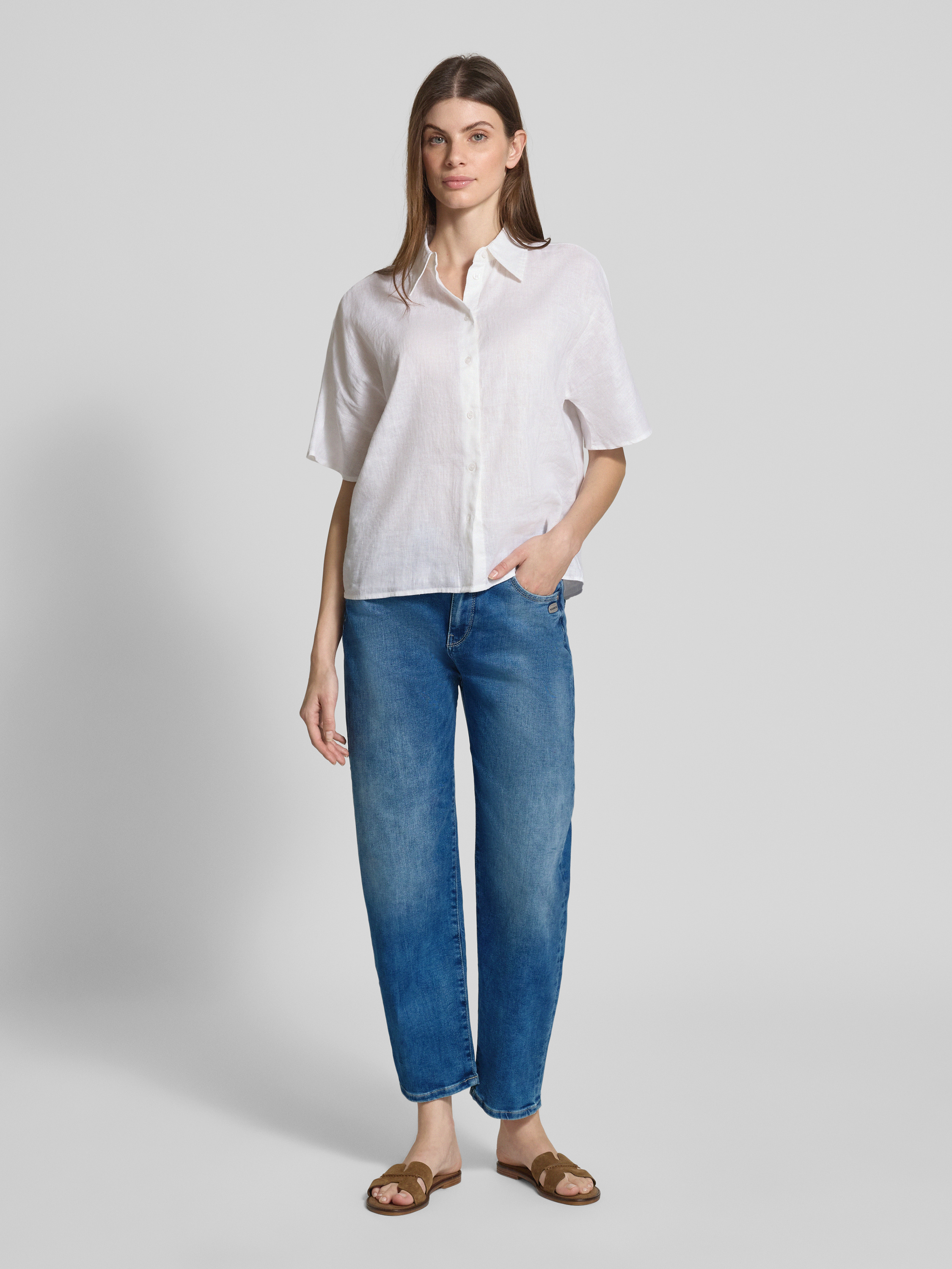 Die Cropped Jeans im Used-Look von Gang kombiniert einen hohen Bund mit einem elastischen Baumwoll-Mix, der bequemen Tragekomfort ermöglicht. Der lässige Schnitt und das auffällige Label-Detail sorgen für einen modernen Auftritt, während praktische Eingrifftaschen funktionalen Nutzen bieten.