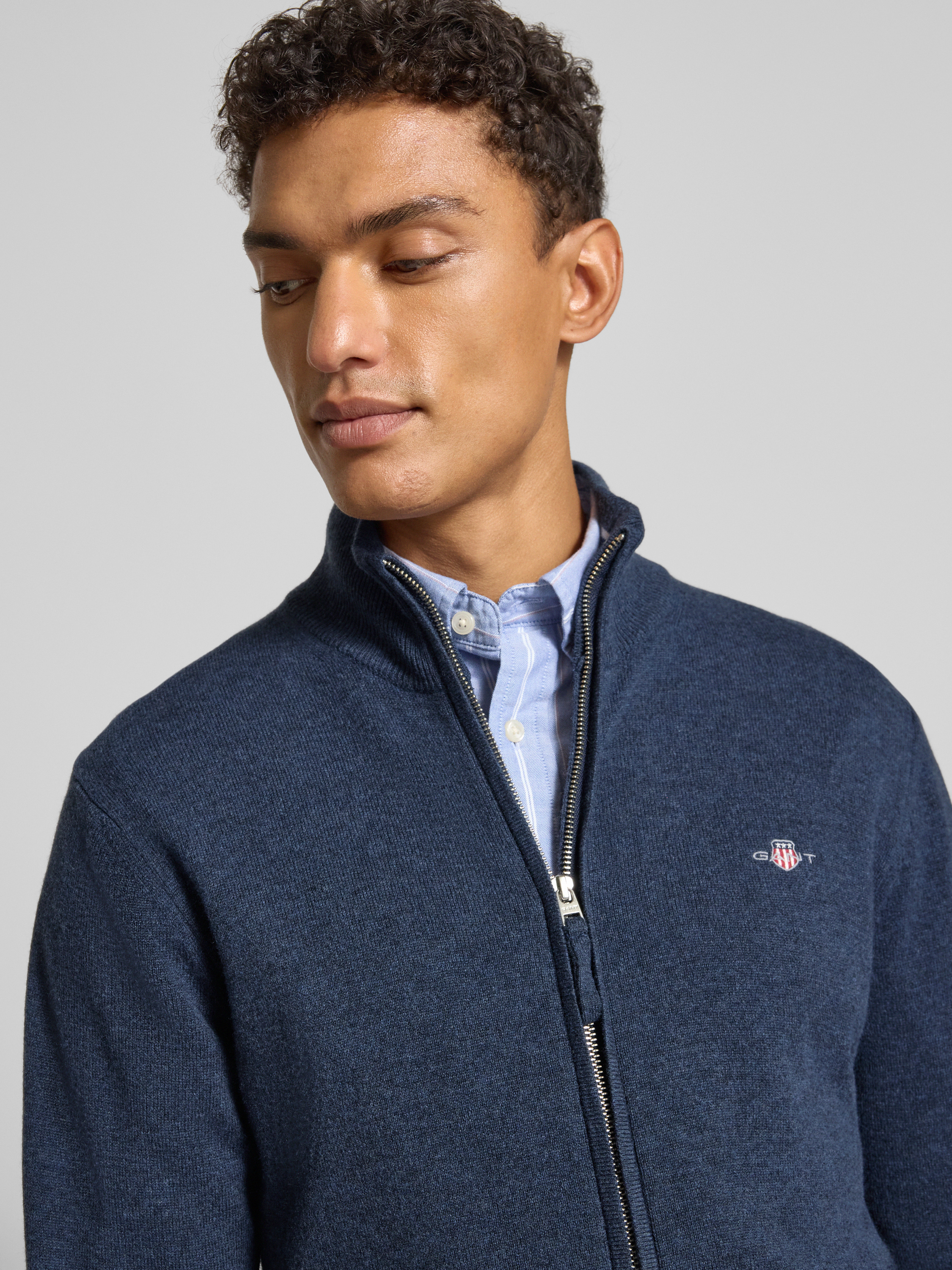 Die Herren Strickjacke von Gant aus reiner Baumwolle fühlt sich angenehm leicht auf der Haut an und begleitet entspannt durch den Tag. Durch den Regular Fit liegt sie bequem an, ohne einzuengen, und der gerippte Stehkragen sorgt für eine dezente, sportive Note. Dezentes Label-Stitching rundet das unaufdringliche Design ab.