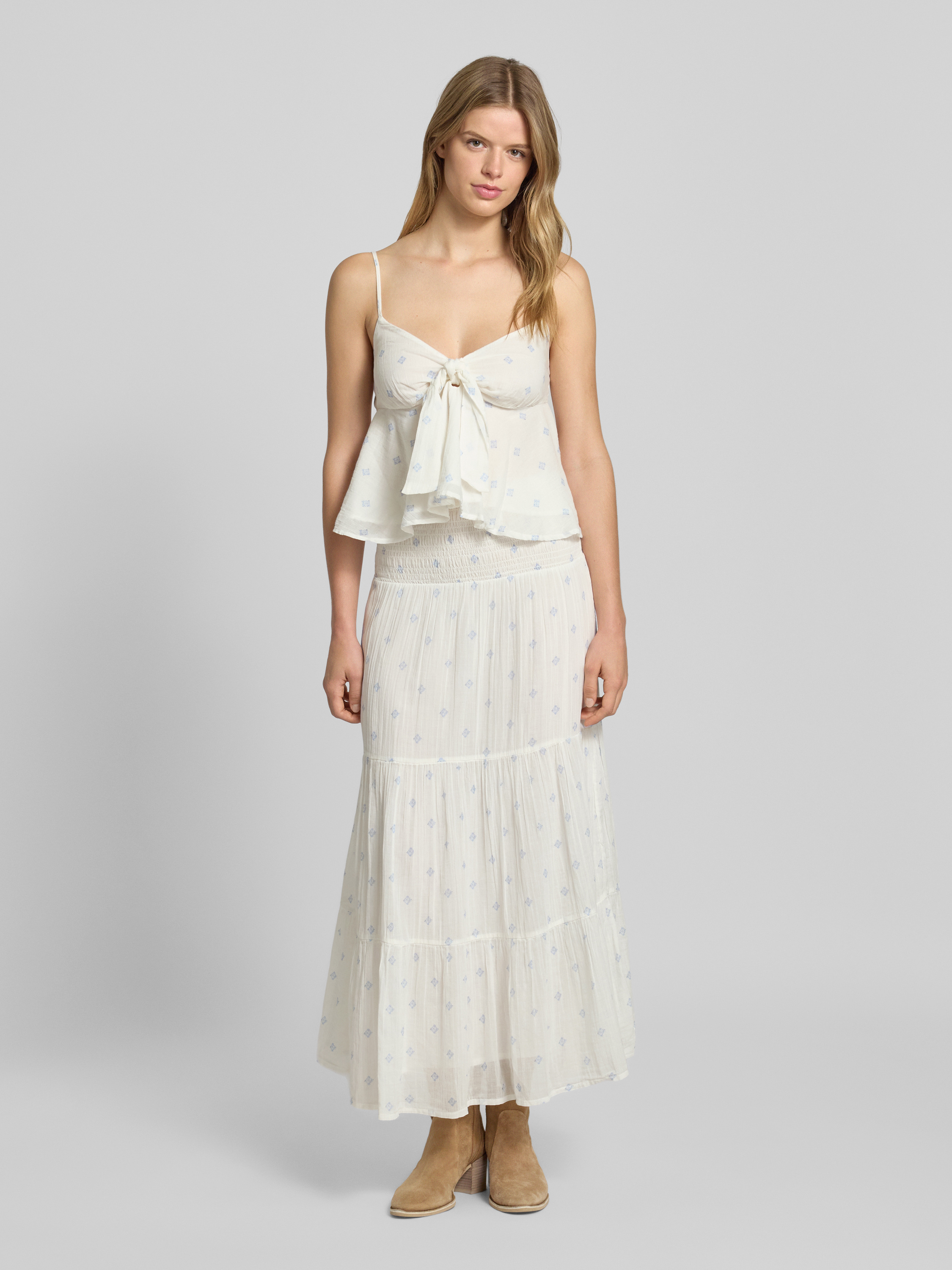 Der Maxirock von Gina Tricot aus reiner Baumwolle überzeugt durch seinen fließenden Stufen-Look und die bequeme A-Linie. Der elastische Bund sorgt für angenehmen Tragekomfort, sodass sich der Rock vielseitig im Alltag kombinieren lässt. Ideal für entspannte Freizeitaktivitäten oder sommerliche Spaziergänge.