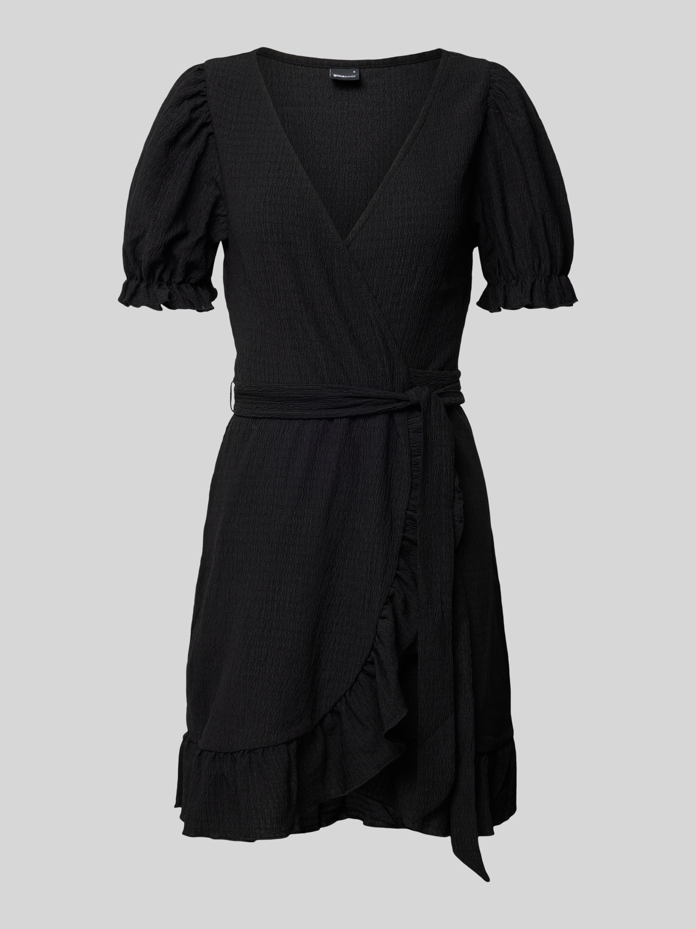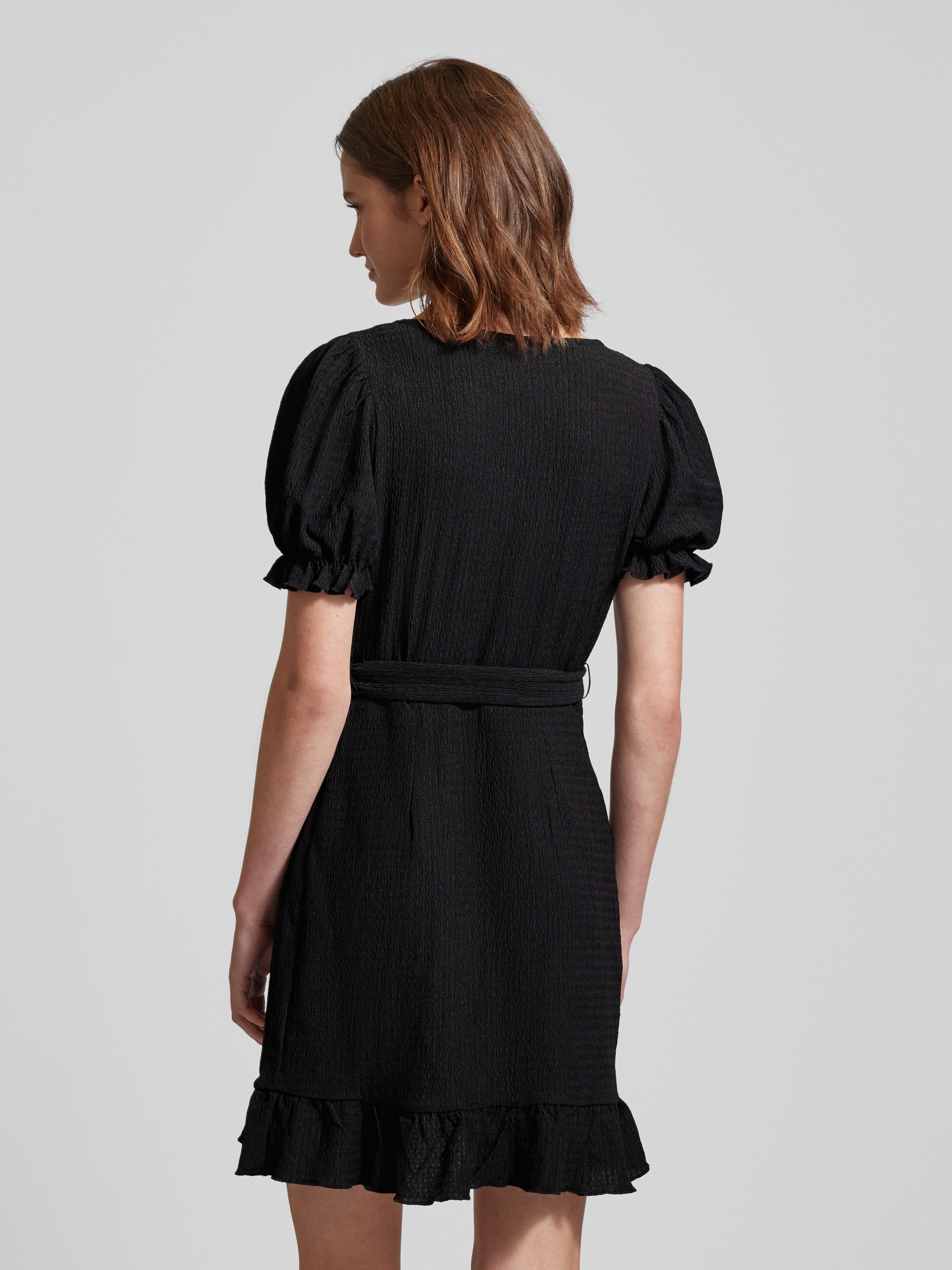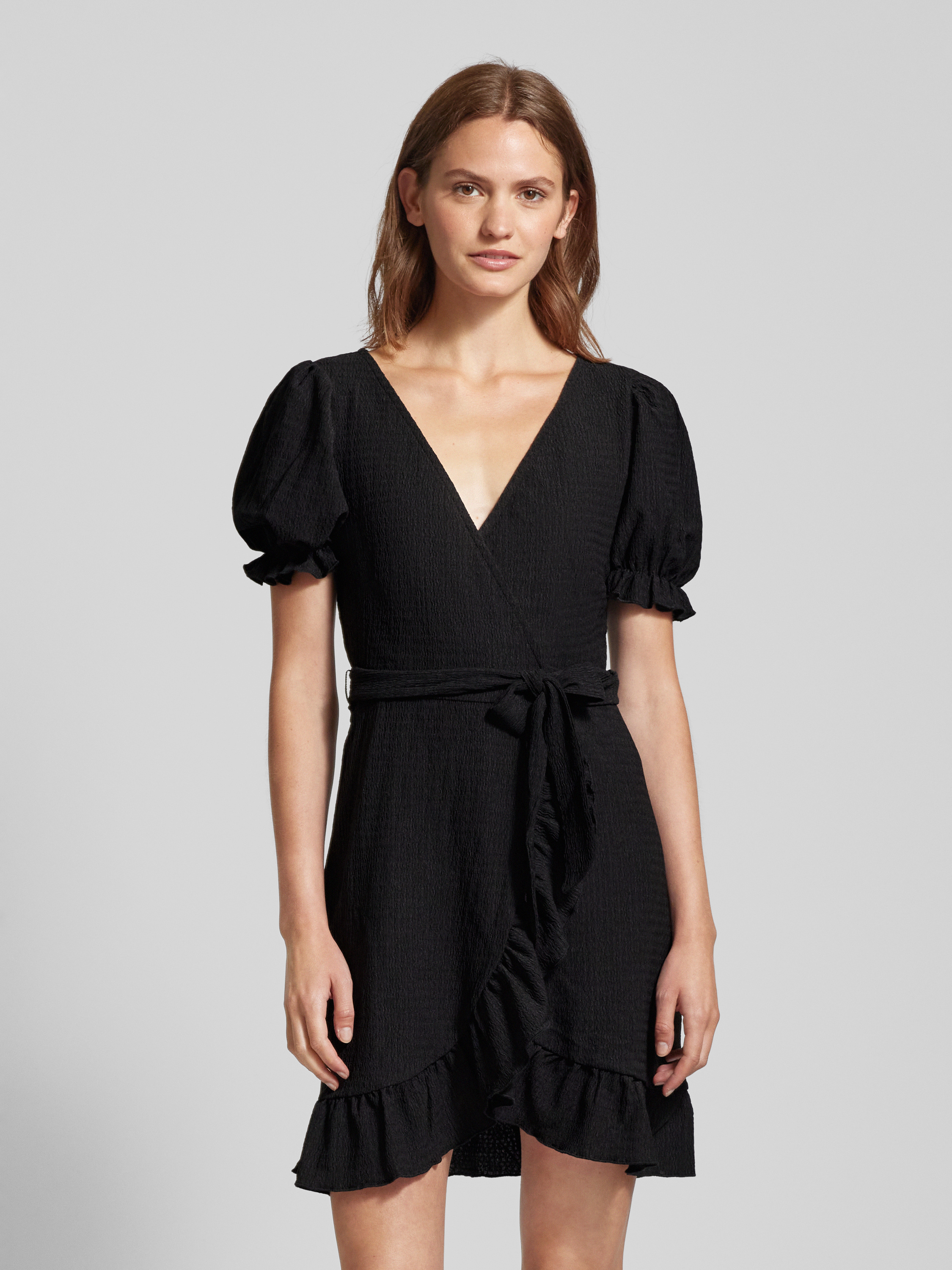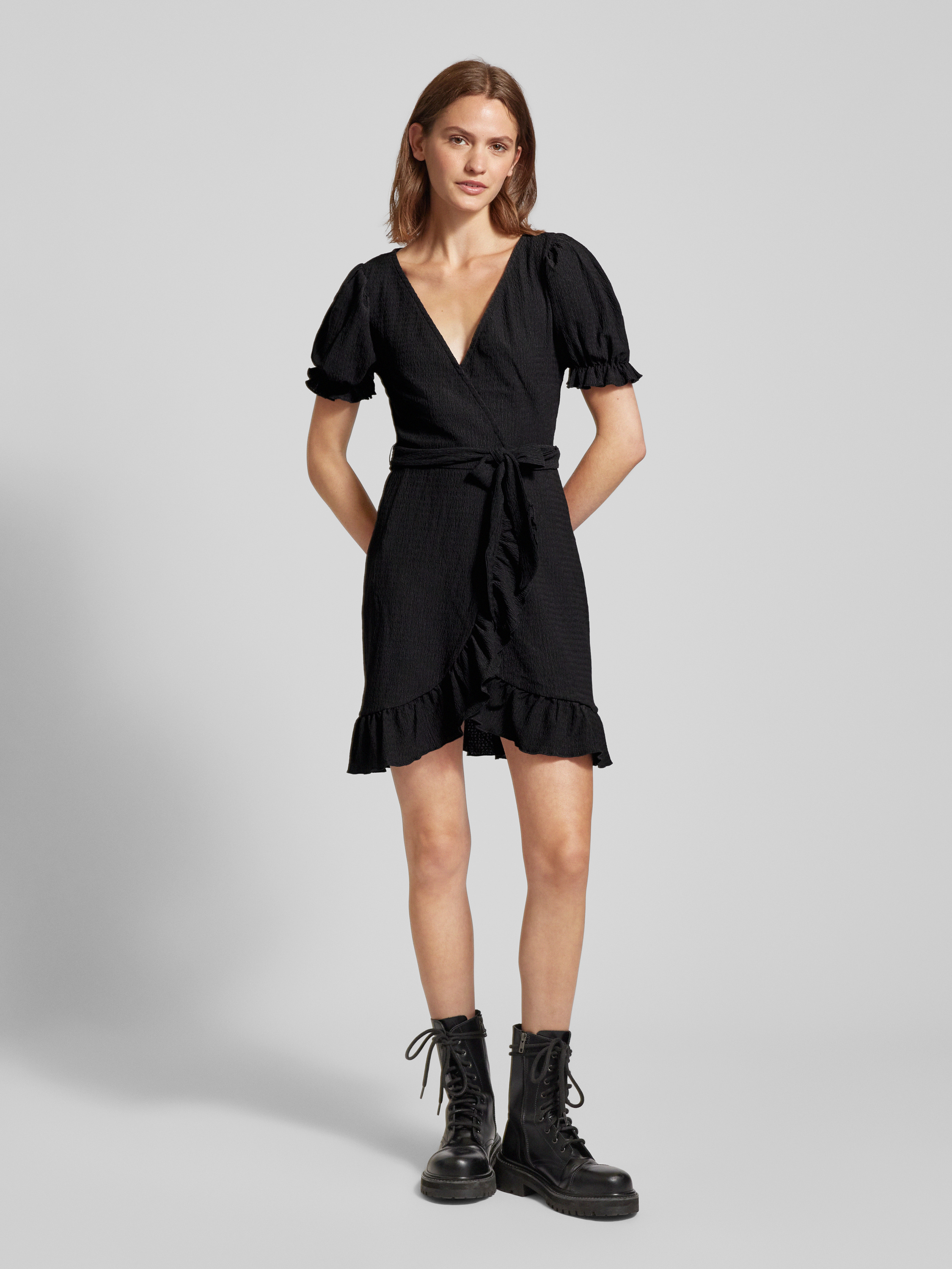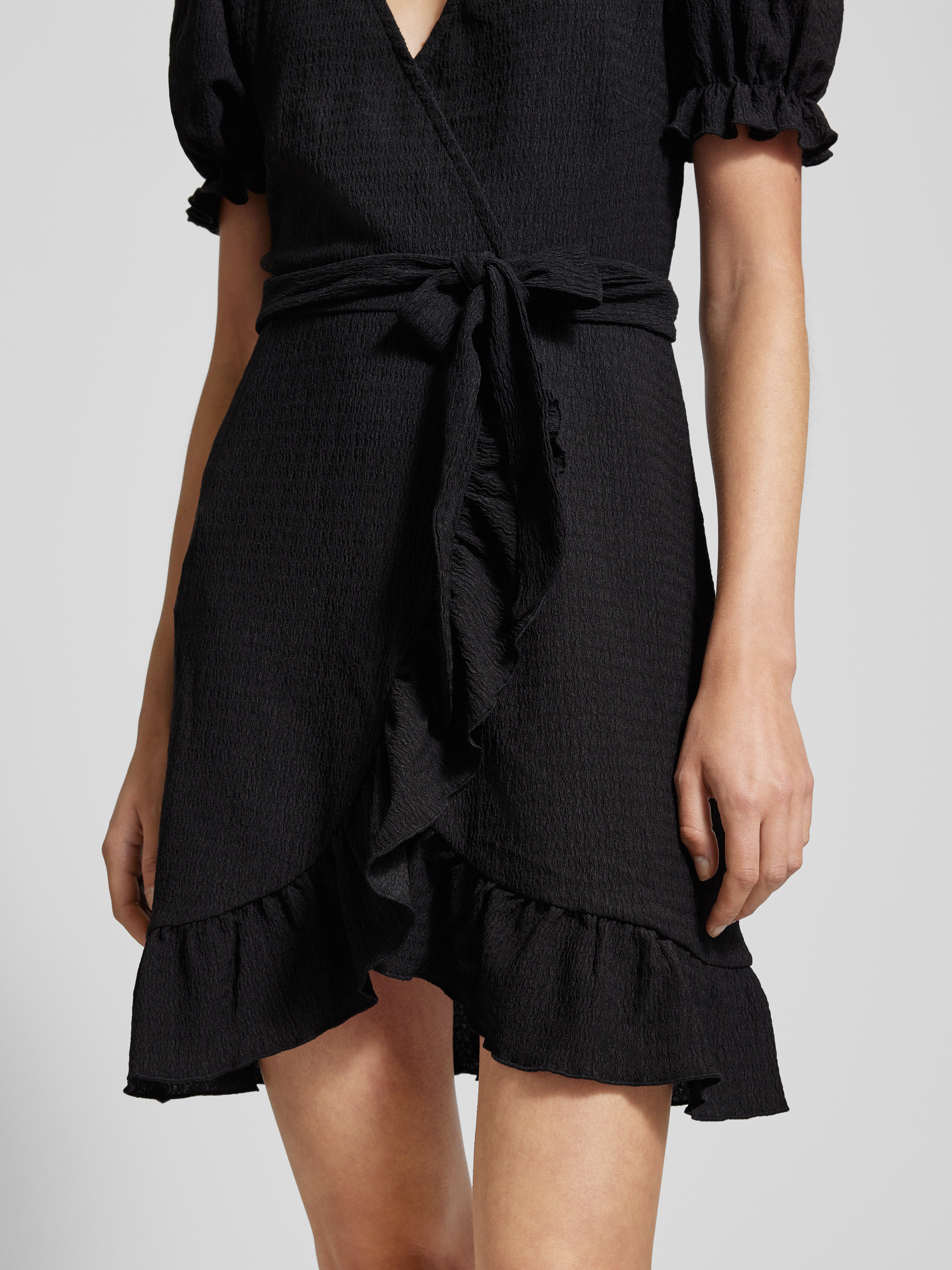 Das Minikleid von Gina Tricot kombiniert einen taillierten Schnitt mit einem raffinierten V-Ausschnitt und einem Bindegürtel. Der Material-Mix mit Stretch-Anteil sorgt für angenehmen Tragekomfort, während Volants und Wickel-Optik dem Kleid einen besonderen Charme verleihen. Ideal für vielseitige Anlässe.