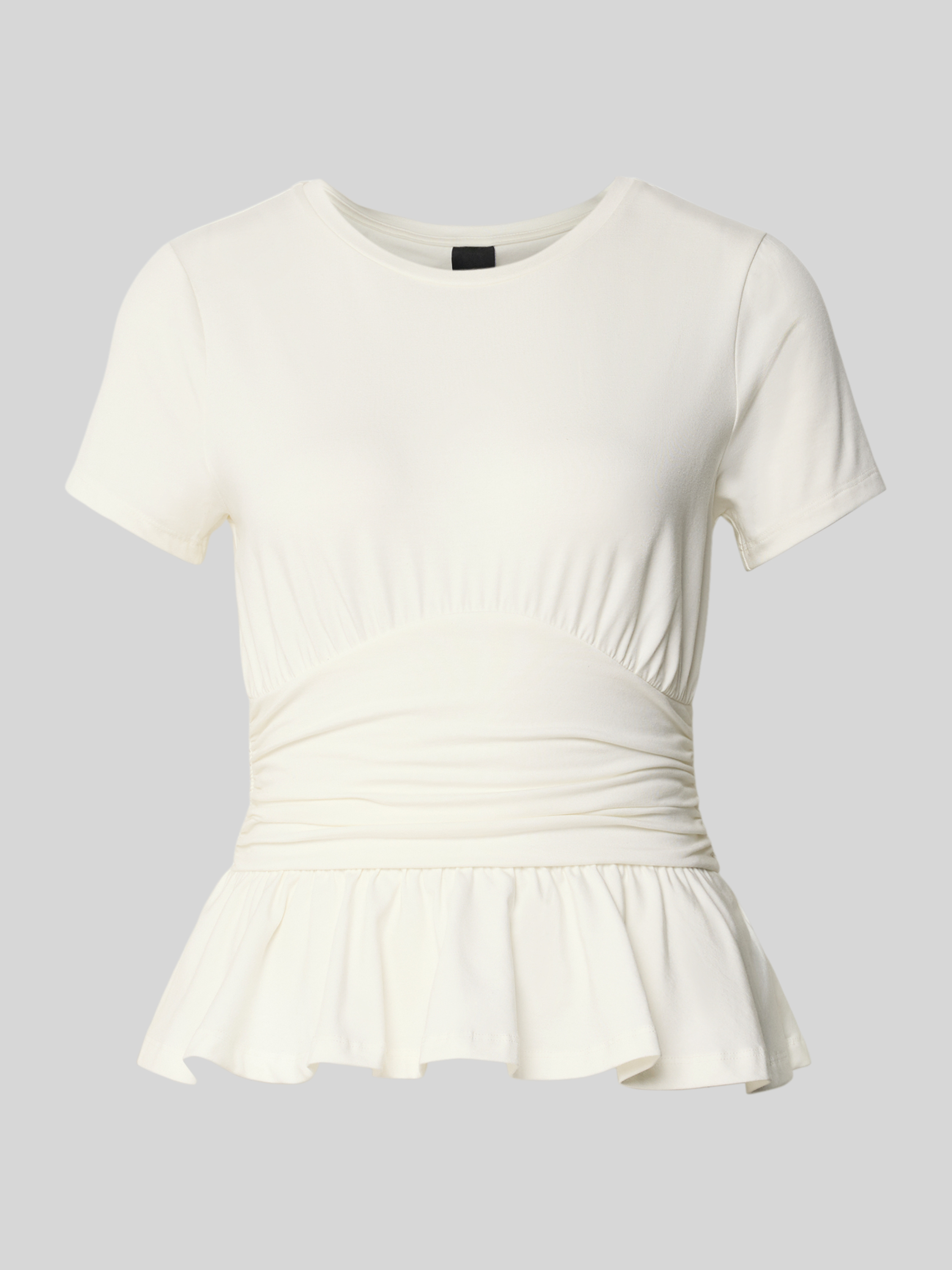 Das Damen T-Shirt von Gina Tricot fällt durch seine ausgestellte Rockpartie und feine Raffungen angenehm auf. Der Baumwoll-Micromodal-Mix mit Stretch-Anteil sorgt für ein angenehmes Tragegefühl, während der Regular-Fit Bewegungsfreiheit unterstützt. Ein gerippter Rundhalsausschnitt ergänzt den entspannten Look dezent.
