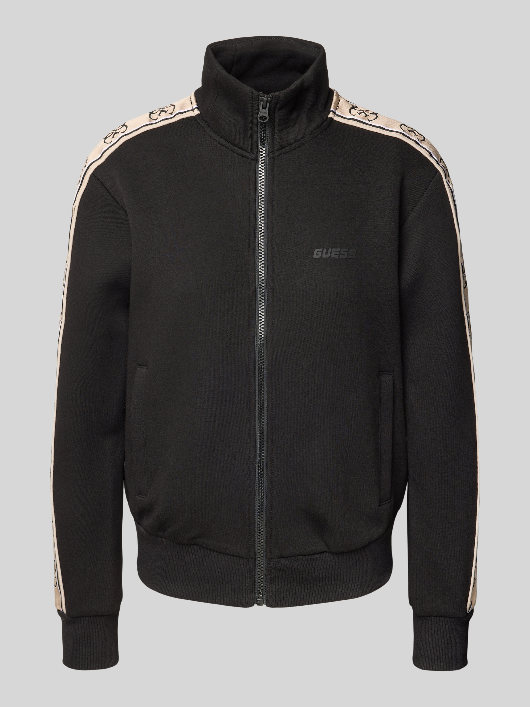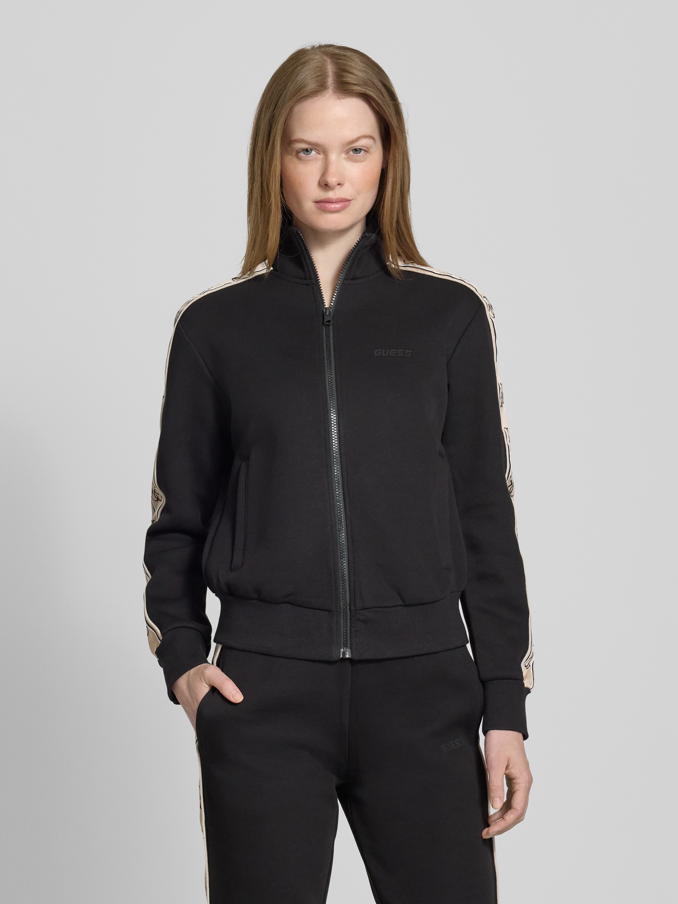 Die Sweatjacke von Guess Activewear, Modell 'BRITNEY', vereint sportlichen Komfort mit einem modischen Akzent. Dank des lockeren Schnitts aus einem Baumwoll-Mix lässt sie sich angenehm tragen, während der Stehkragen und die Leistentaschen praktische Details bieten. Ein Label-Print und Galonstreifen runden das Design ab.