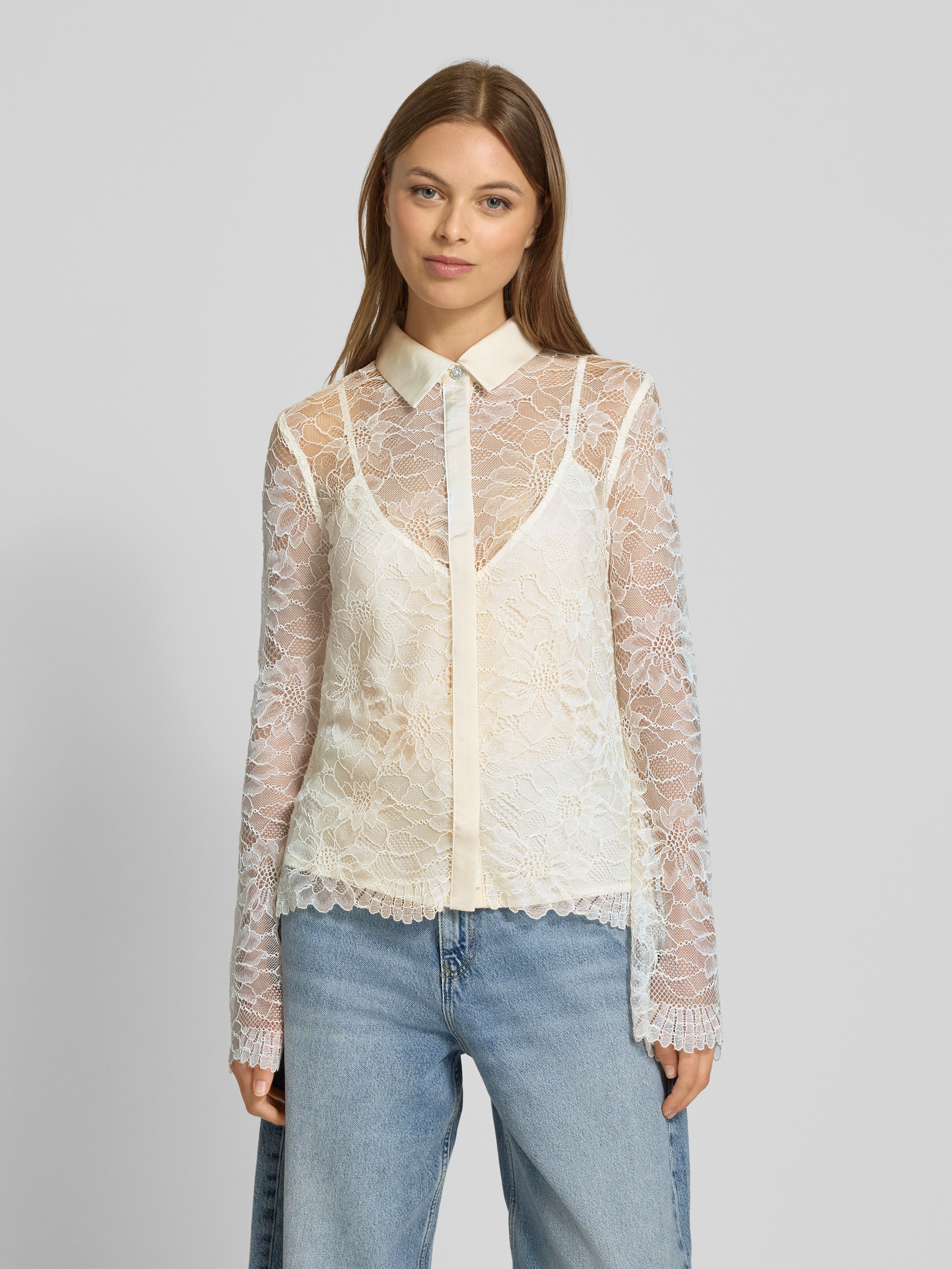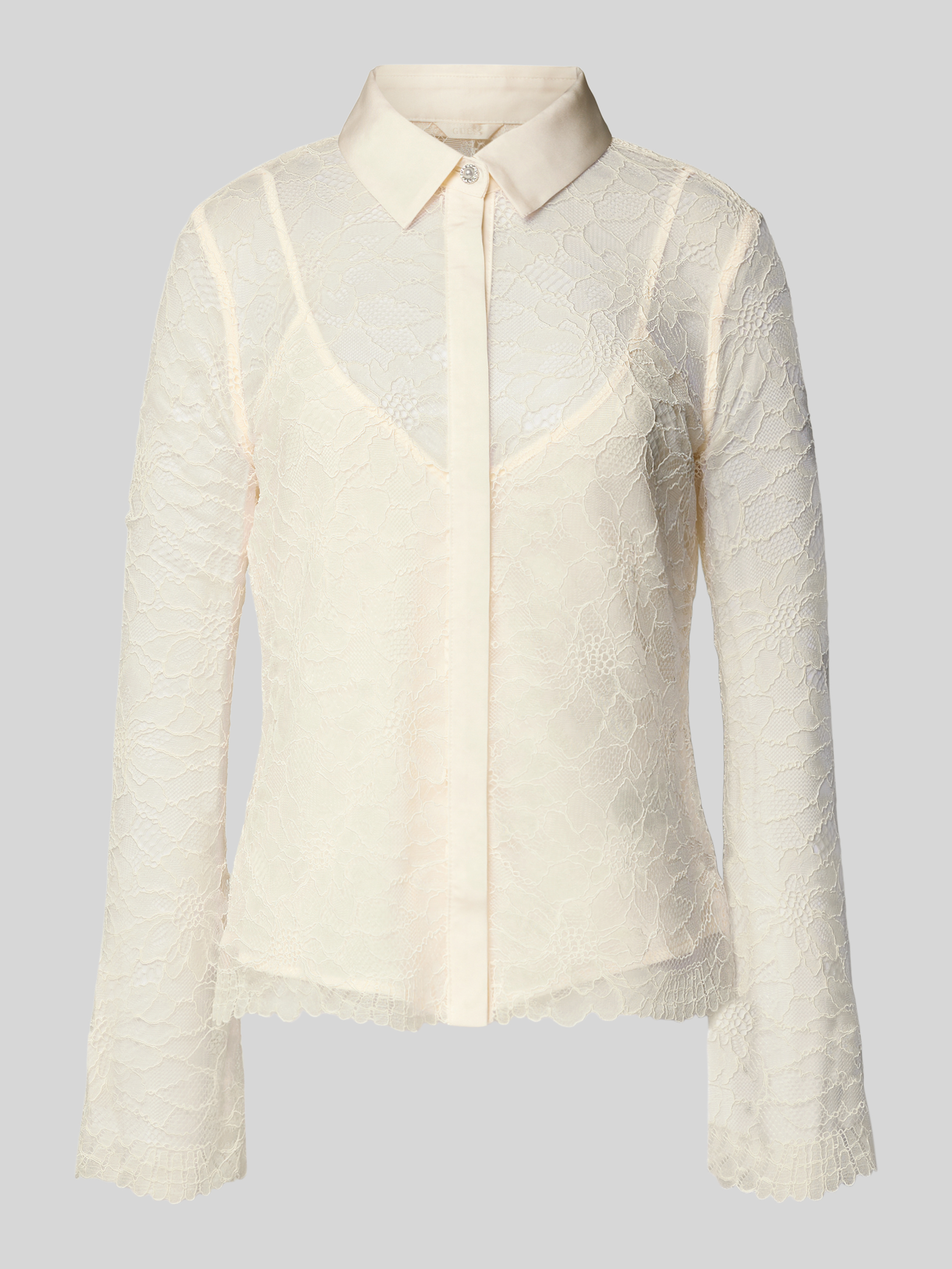 Die Regular Fit Bluse im 2-in-1-Look von Guess kombiniert einen eleganten Material-Mix mit zarter Spitze, was sie zu einer vielseitigen Wahl für unterschiedliche Anlässe macht. Der Umlegekragen und die verdeckte Knopfleiste sorgen für ein gepflegtes Erscheinungsbild. Dank des Stretch-Anteils bietet sie angenehmen Tragekomfort.