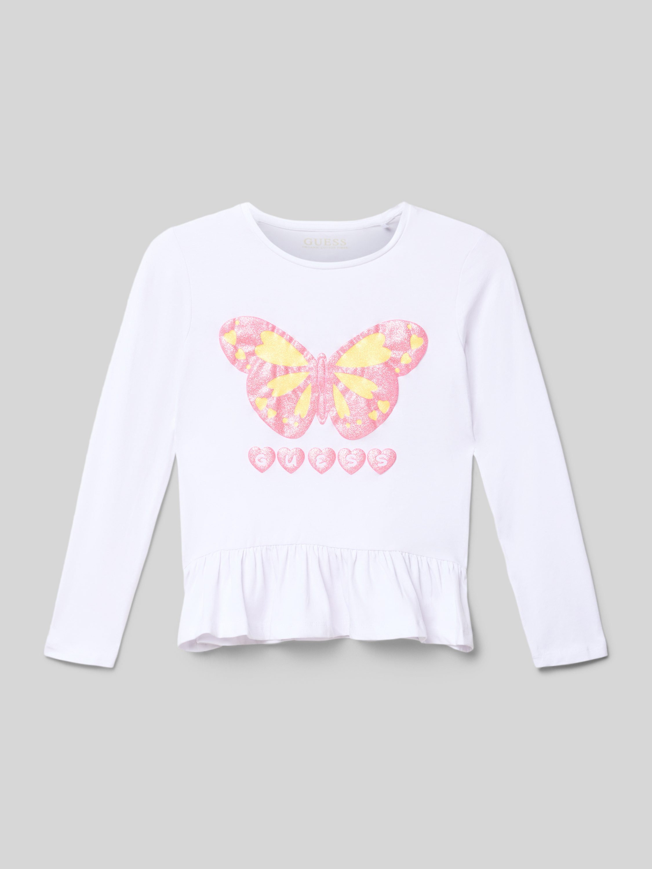 Das Guess Longsleeve für Kinder kombiniert einen angenehmen Baumwoll-Mix mit einem Regular Fit, der sich ideal für den Alltag eignet. Der Glitzer- und Logo-Print sorgt für ein verspieltes Design, während Rüschen am Saum einen charmanten Akzent setzen. Langärmlig und mit Rundhalsausschnitt ausgestattet, bietet es Komfort und Stil.