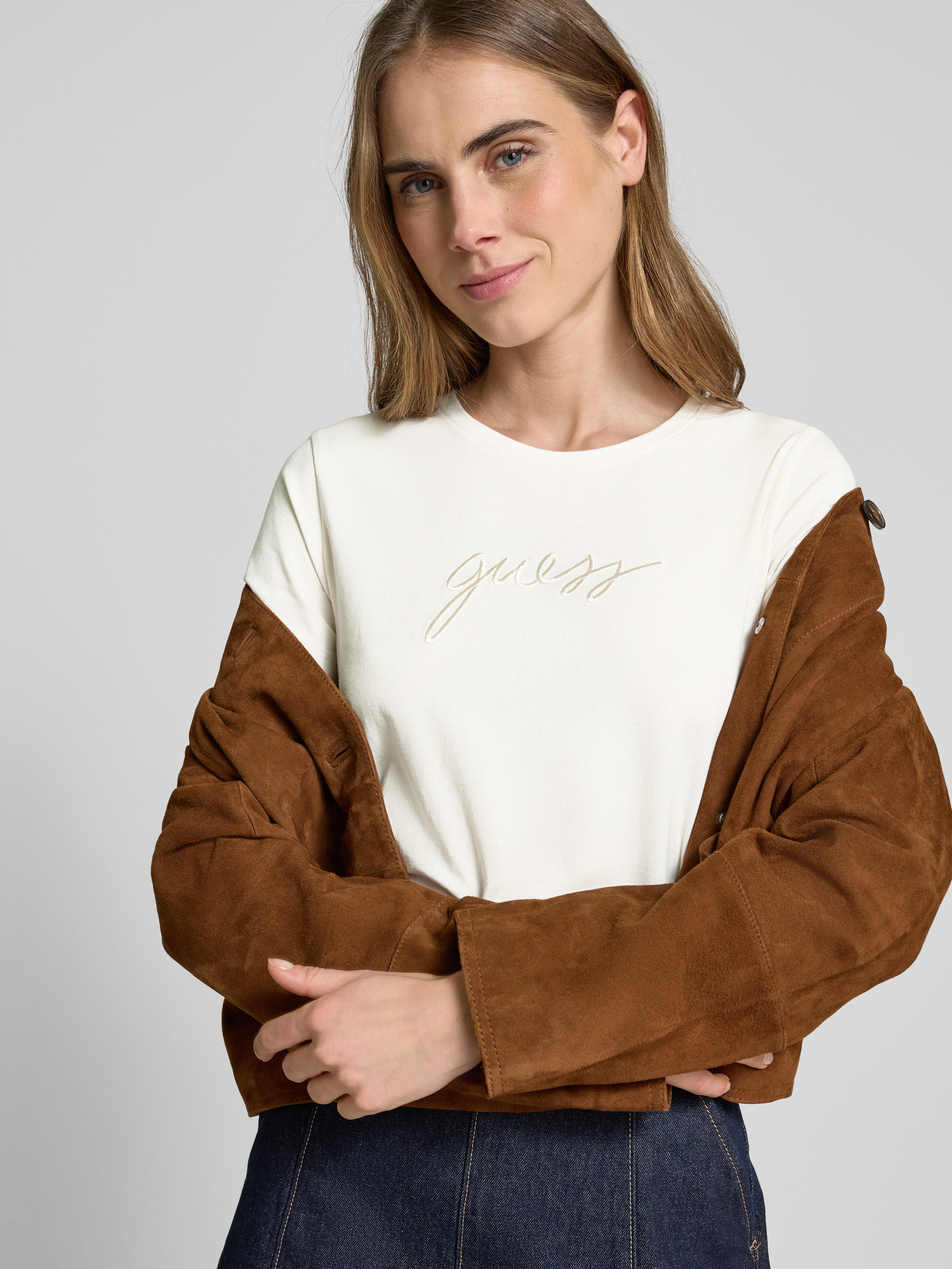 Das Damen T-Shirt von GUESS, Modell 'LUCIA', beeindruckt durch seinen körpernahen Schnitt und den elastischen Baumwoll-Mix mit Stretch-Anteil. Der Rundhalsausschnitt sorgt für einen klassischen Look, während das dezente Label-Stitching einen subtilen Akzent setzt. Dieses vielseitige Oberteil eignet sich hervorragend für unterschiedlichste Anlässe.