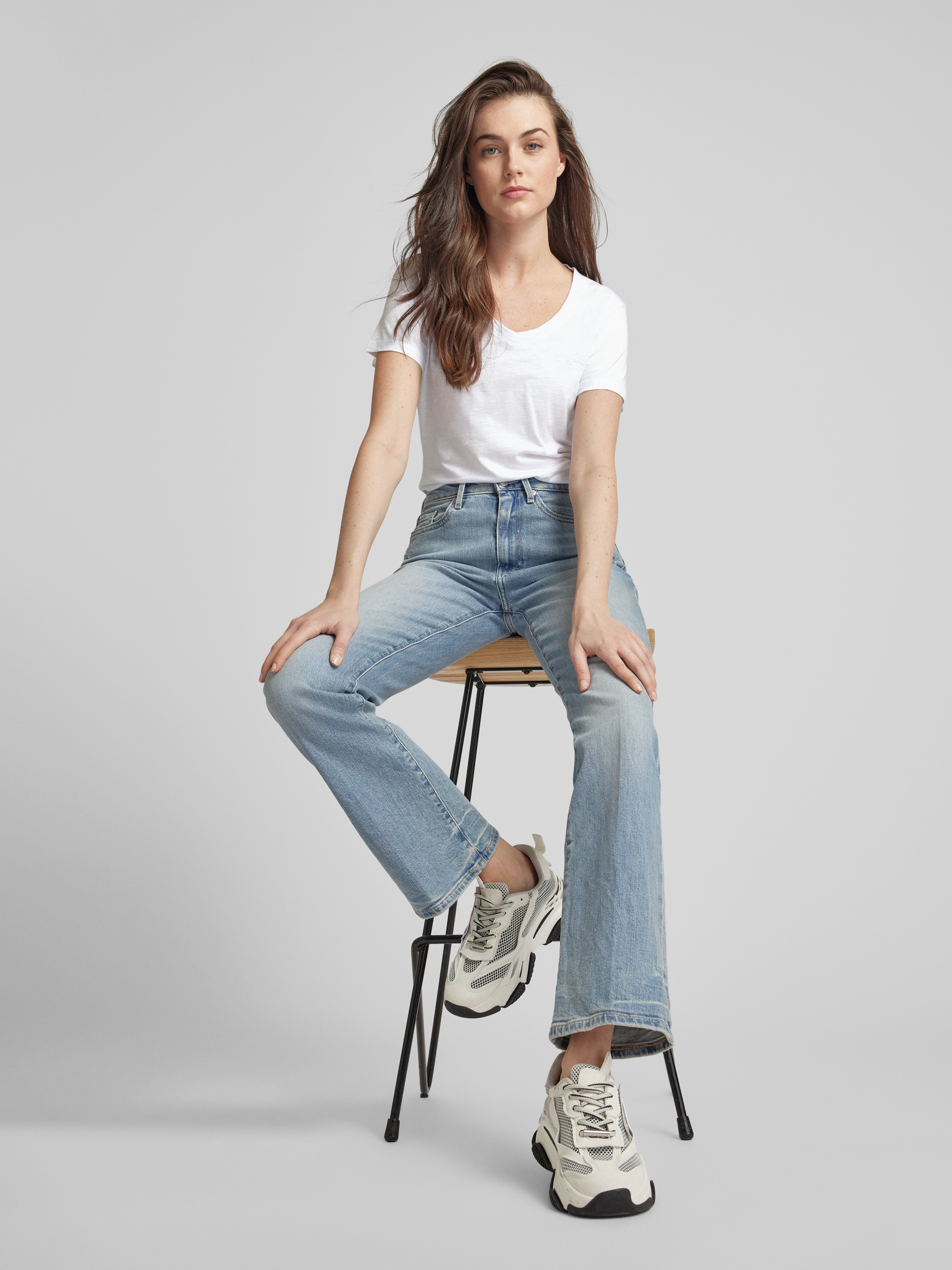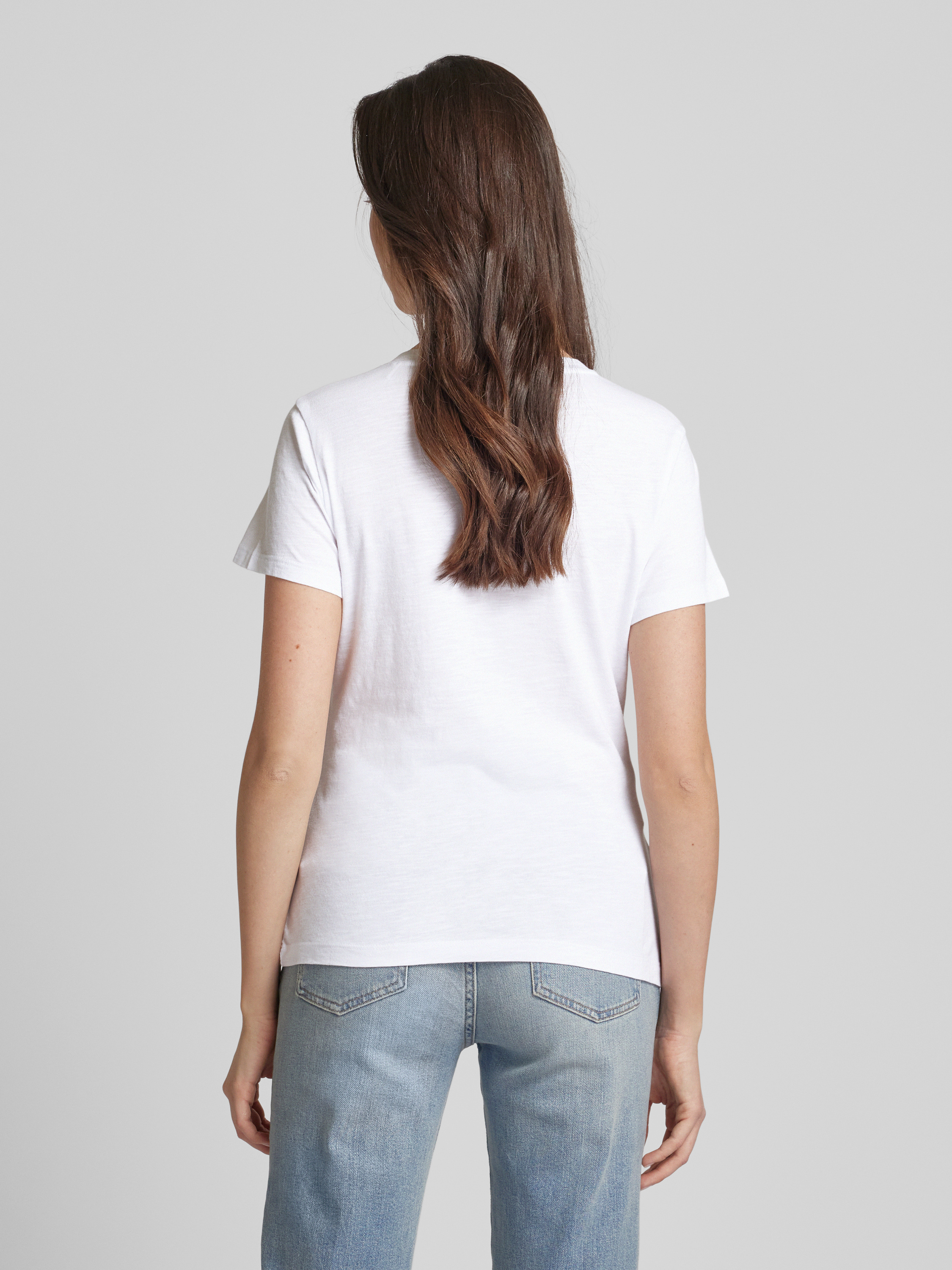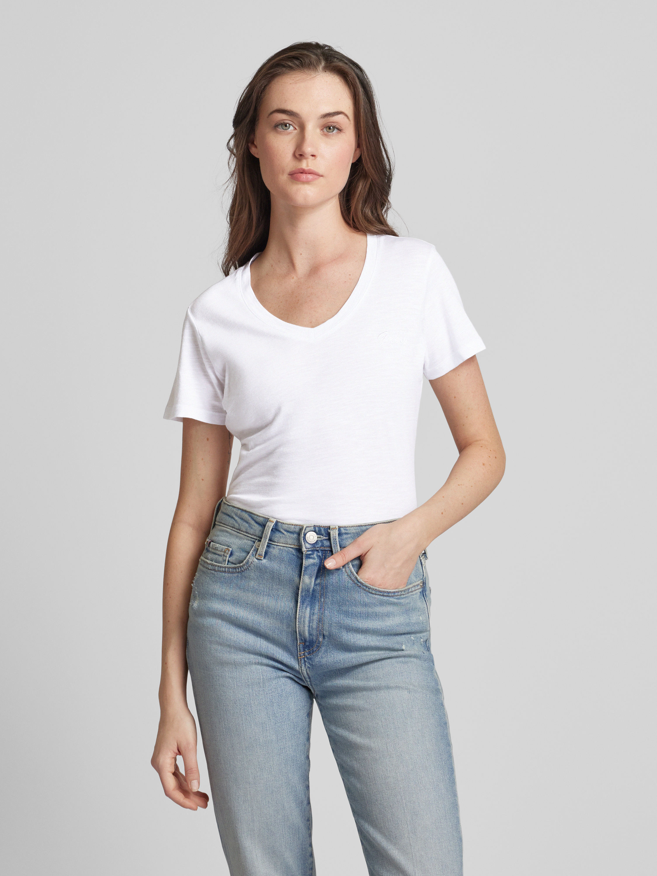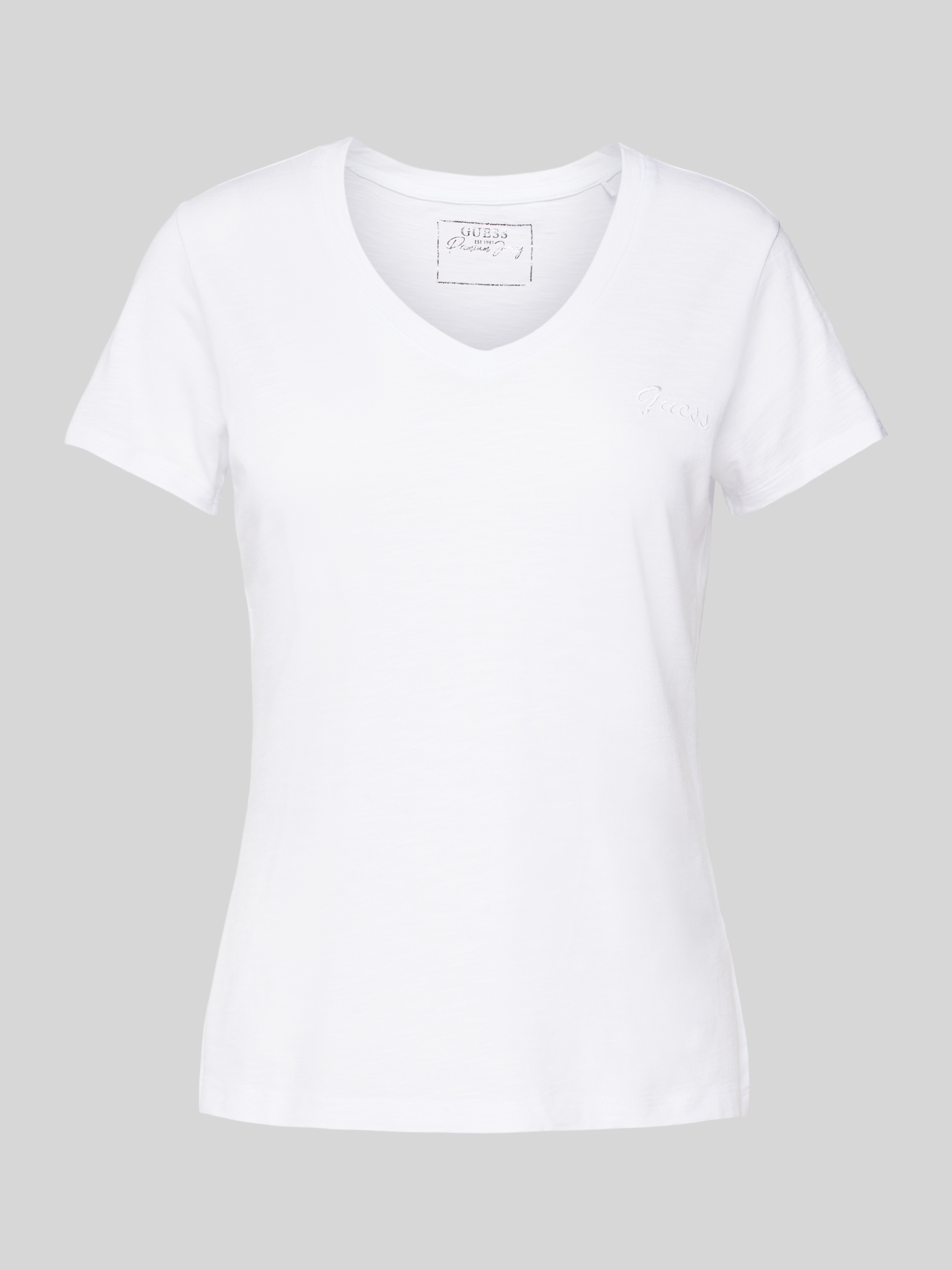 Das Damen T-Shirt von GUESS, aus einem weichen Baumwoll-Micromodal-Mix gefertigt, bietet durch seinen taillierten Schnitt eine schmeichelhafte Passform. Das unifarbene Design wird durch ein dezentes Label-Stitching und einen eleganten V-Ausschnitt ergänzt, was vielfältige Kombinationsmöglichkeiten eröffnet.