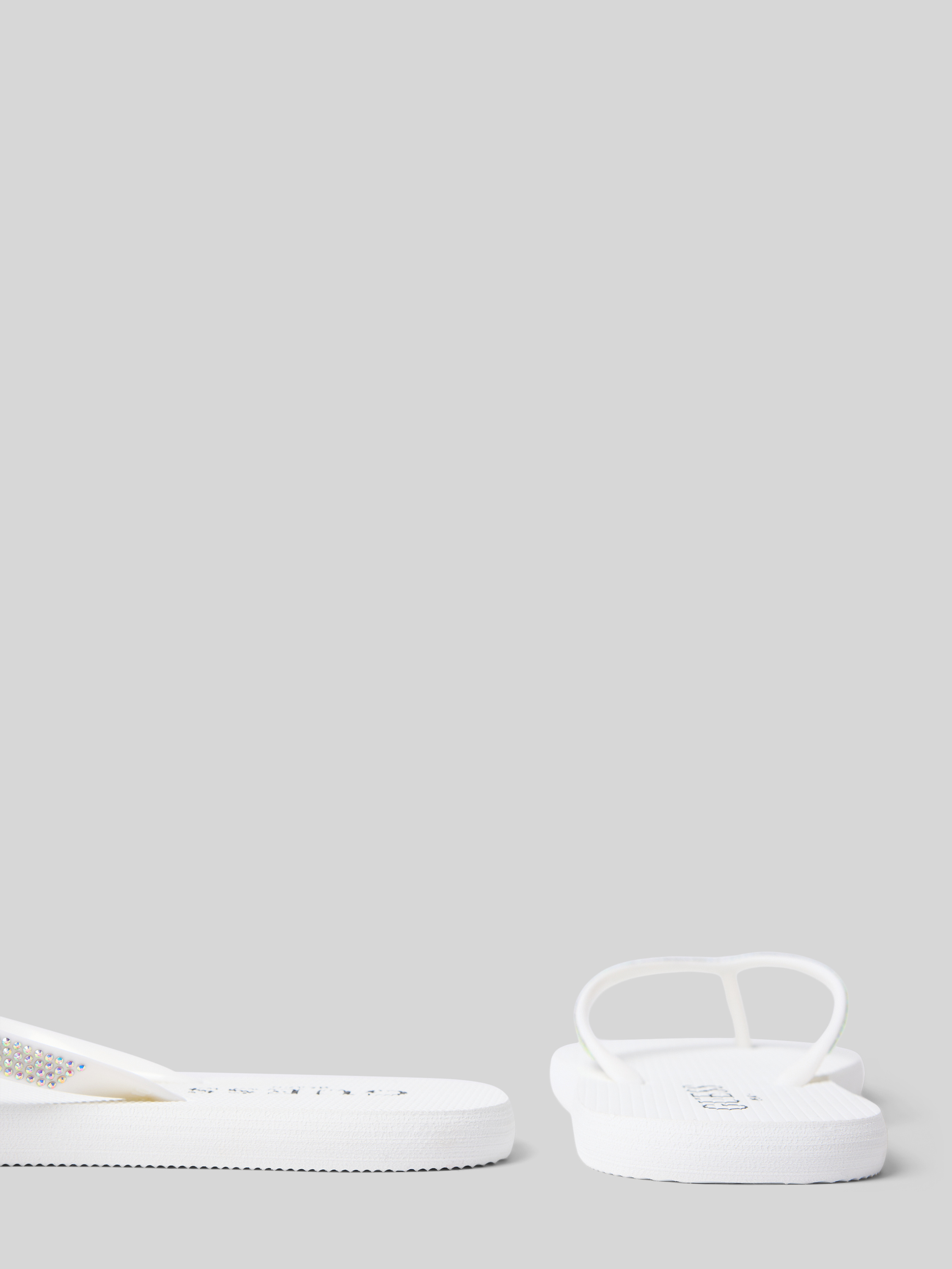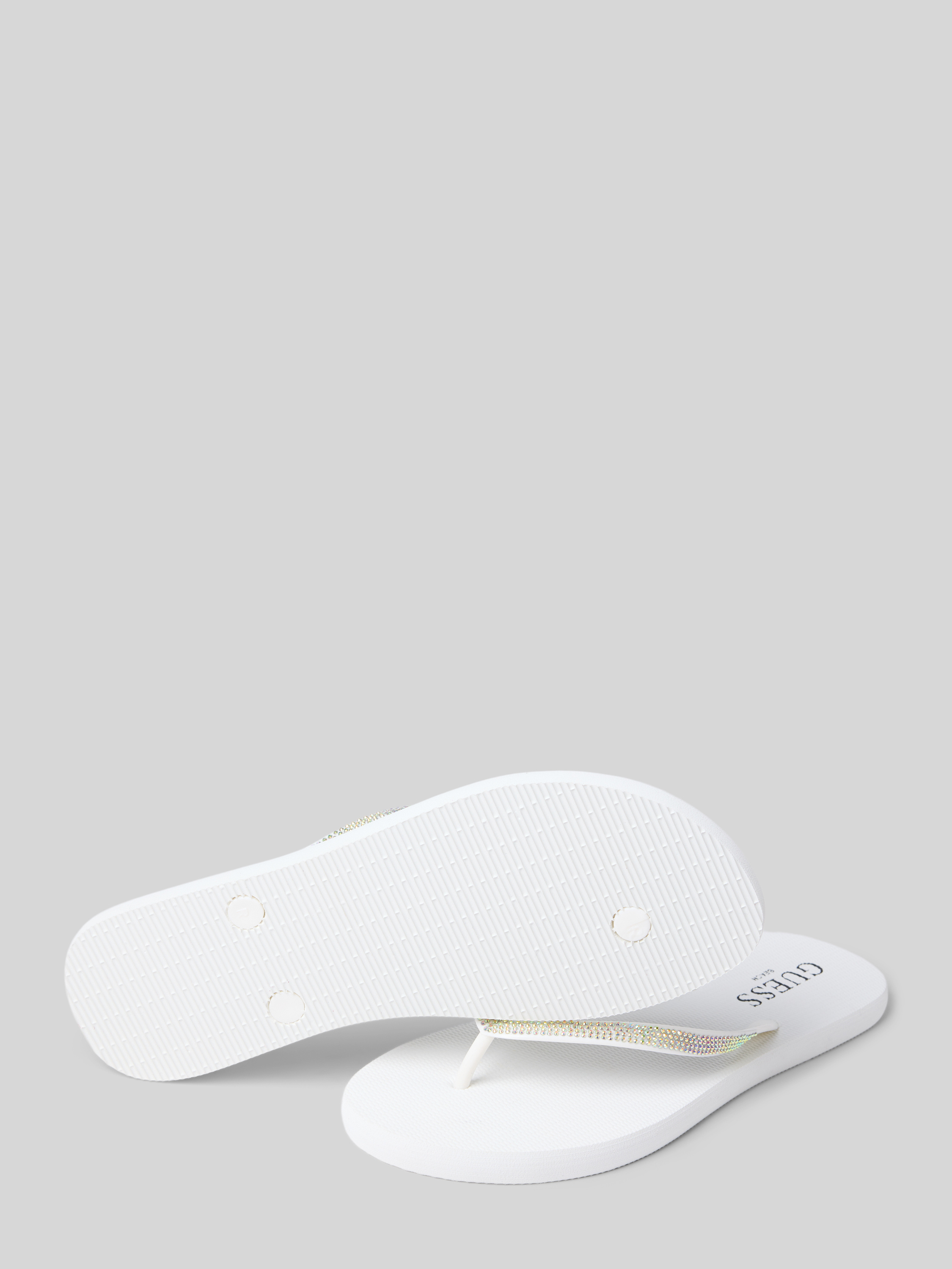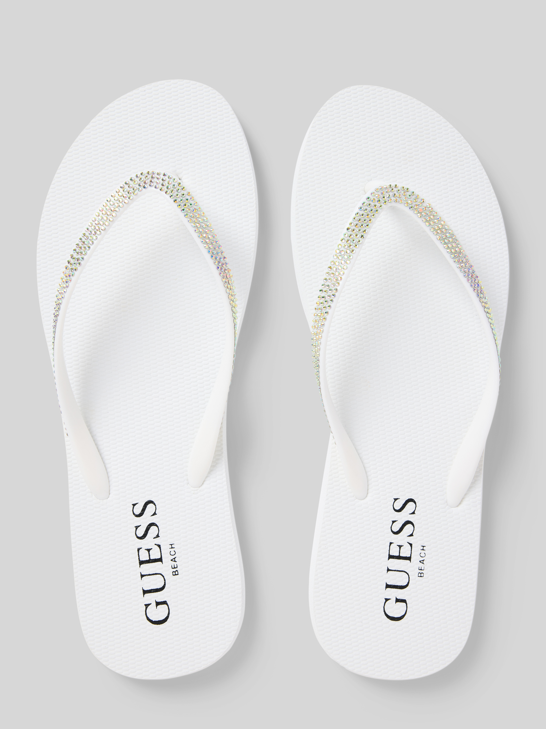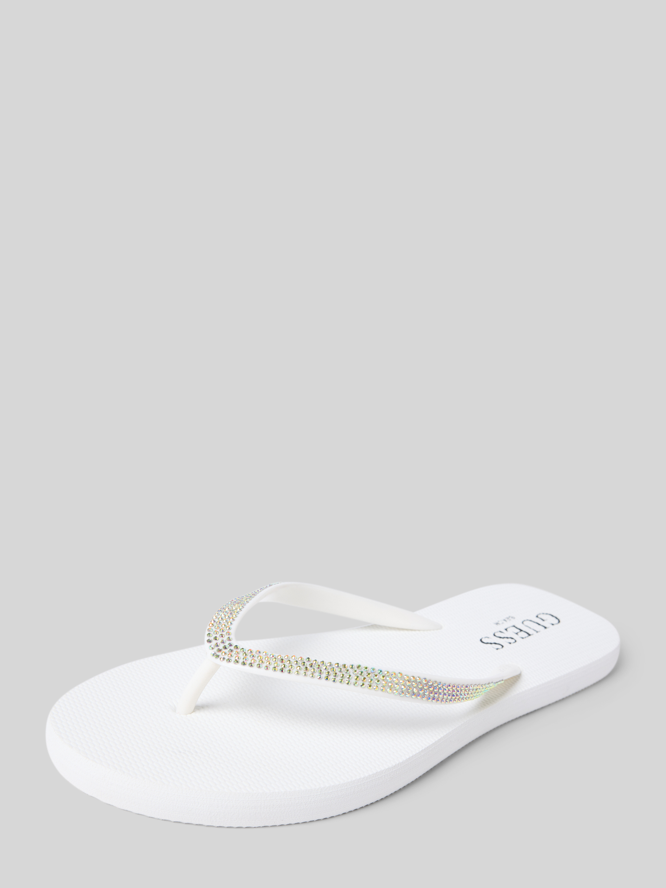 Der Zehentrenner von GUESS verbindet durch den Strasssteinbesatz stilvolle Eleganz mit sommerlicher Leichtigkeit. Die strukturierte Sohle sorgt für angenehmen Halt, während die abgerundete Spitze den Tragekomfort erhöht. Dank des geschmackvollen Label-Prints wird ein subtiler Akzent gesetzt, der jedes Outfit harmonisch ergänzt.