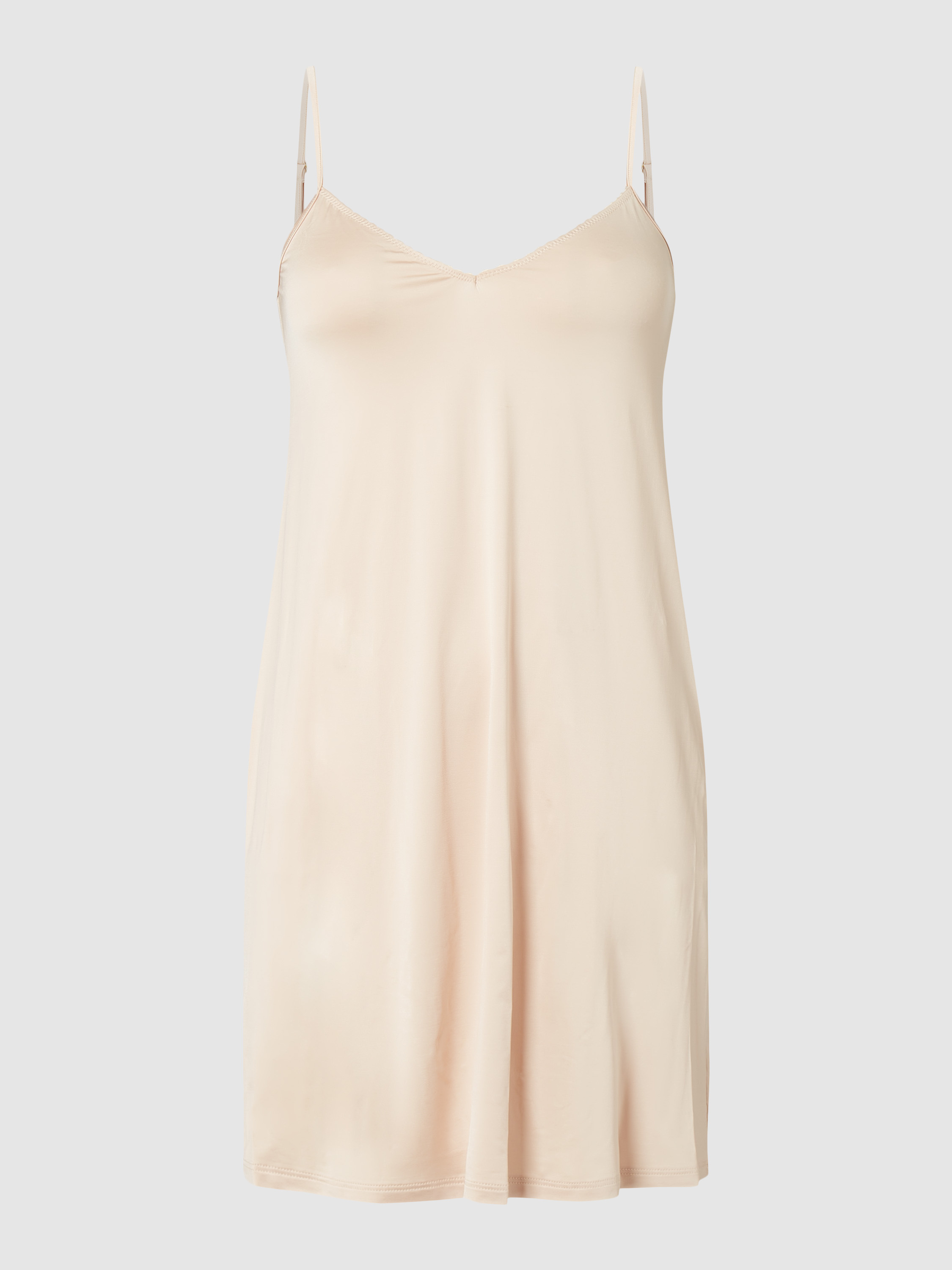 Das elegante Unterkleid von HANRO, Modell Satin Deluxe, kombiniert einen Viskose-Elasthan-Mix mit einem leicht ausgestellten Schnitt, der sanft die Silhouette umschmeichelt. Satin und Zierborte verleihen eine subtile Eleganz, während verstellbare Träger für individuellen Tragekomfort sorgen. Ein V-Ausschnitt rundet das Design harmonisch ab.