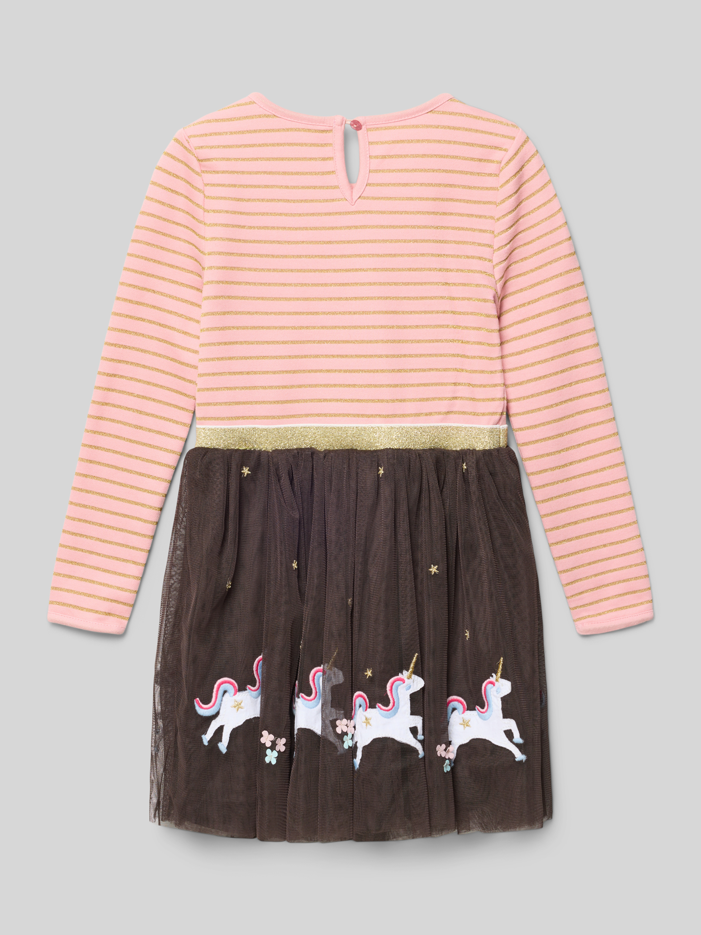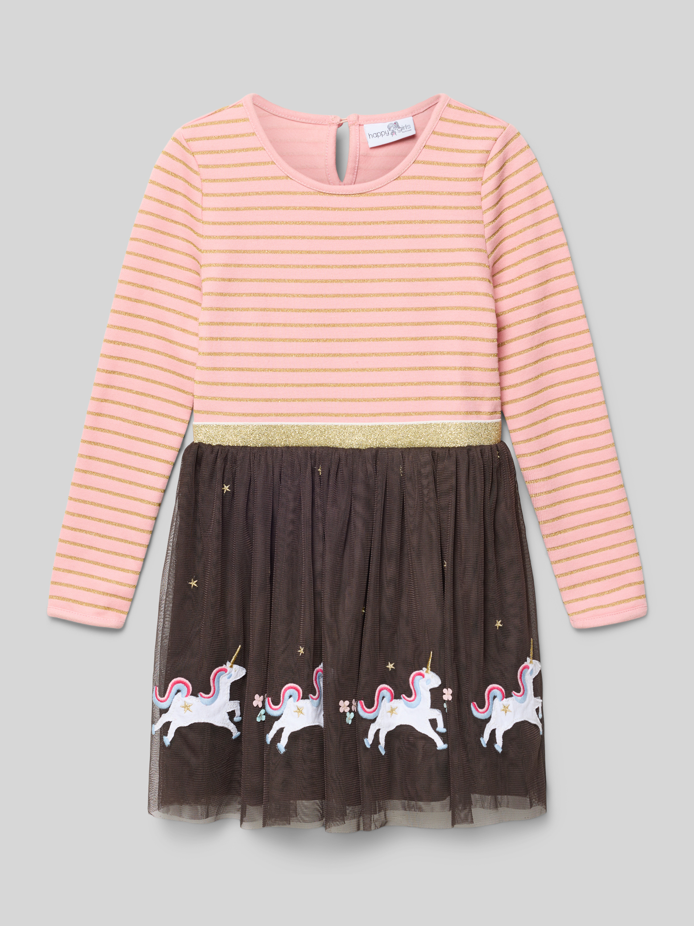Das Kinder Kleid von Happy Girls im 2-in-1-Look bringt durch den geraden Schnitt und den angenehmen Baumwoll-Mix Bewegungsfreiheit in den Alltag. Durch den Rundhalsausschnitt entsteht ein bequemes Tragegefühl, das nicht einengt. Feine Motiv-Stitchings verleihen dem Kleid eine verspielte Note.