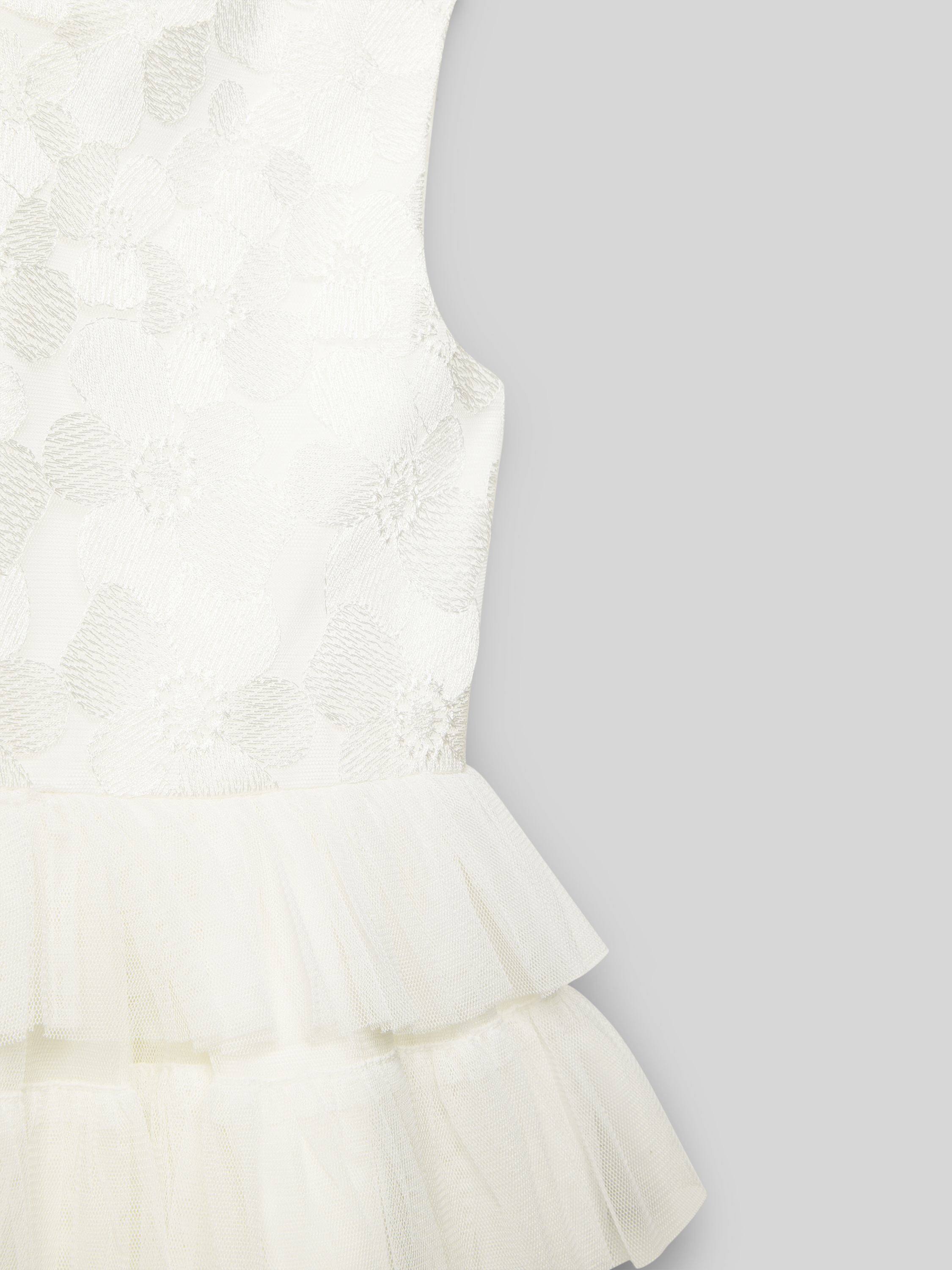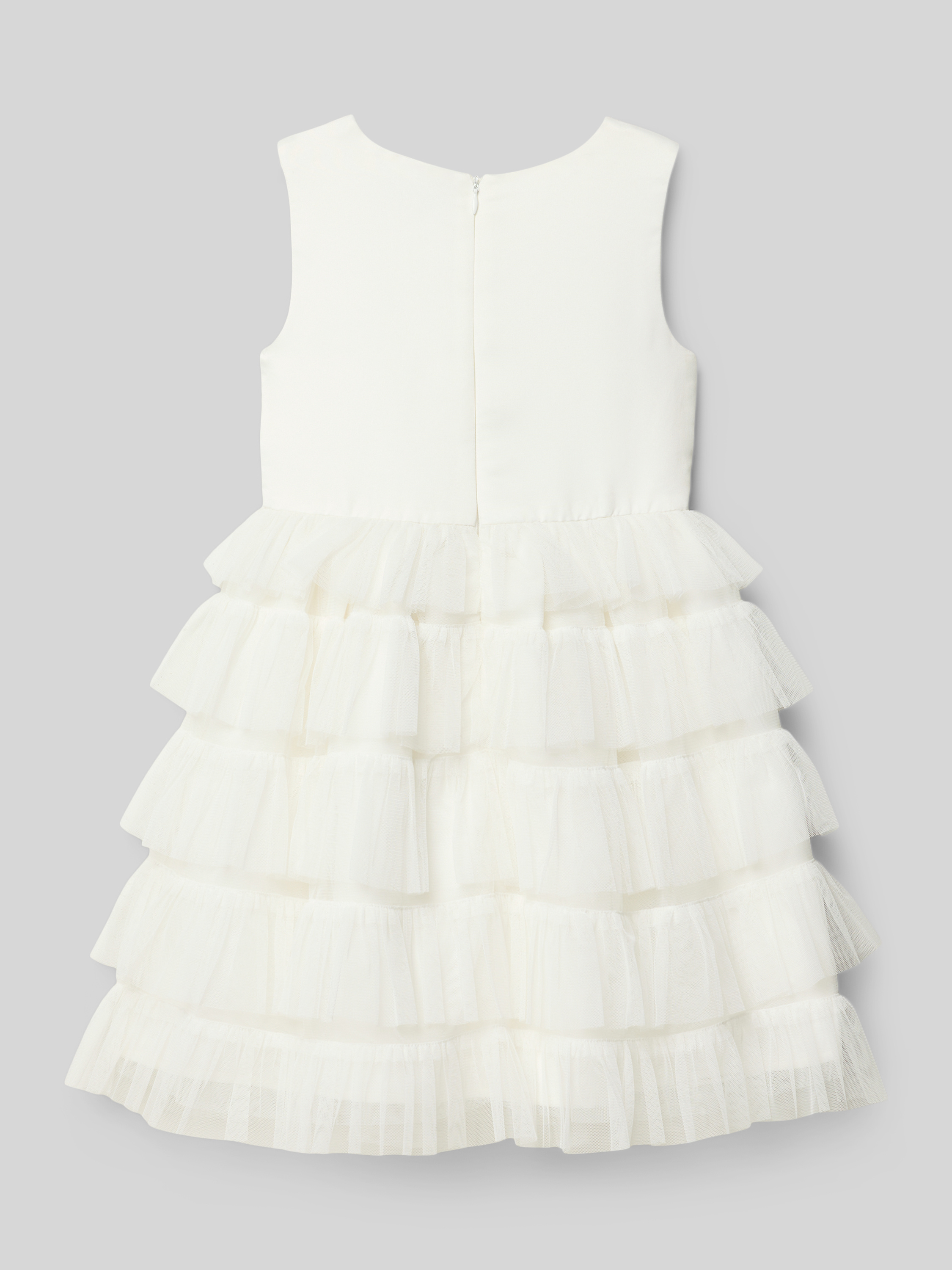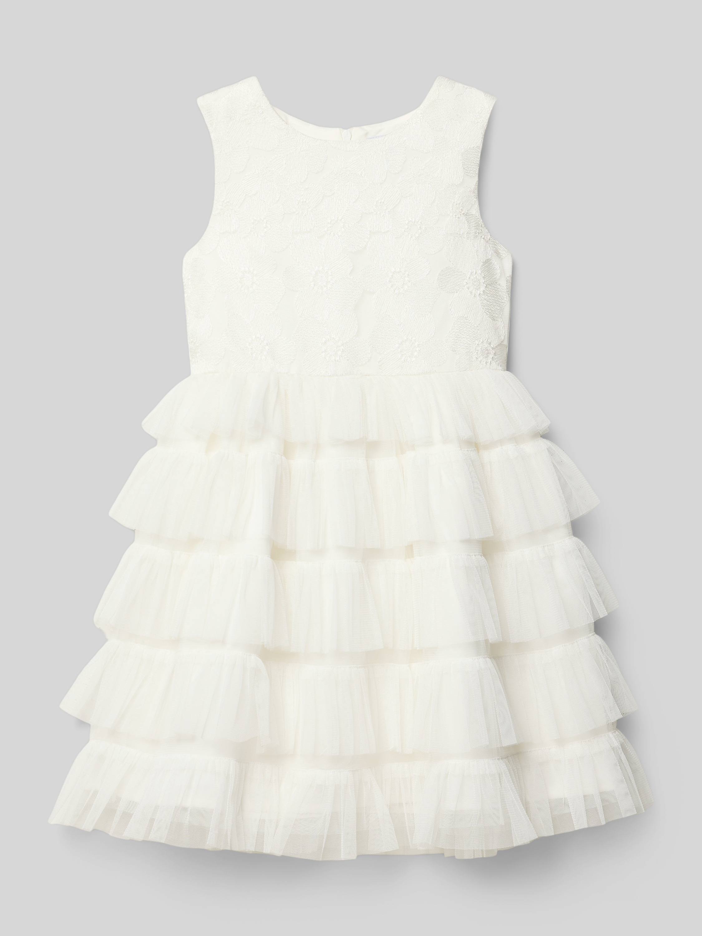 Das Kinderkleid von Happy Girls kombiniert spielerische Eleganz mit praktischer Alltagstauglichkeit. Durch den Regular Fit und das ärmellose Design eignet es sich ideal für warme Tage. Der florale Rüschenbesatz verleiht dem Kleid eine charmante Note, während die A-Linie Bewegungsfreiheit bietet.