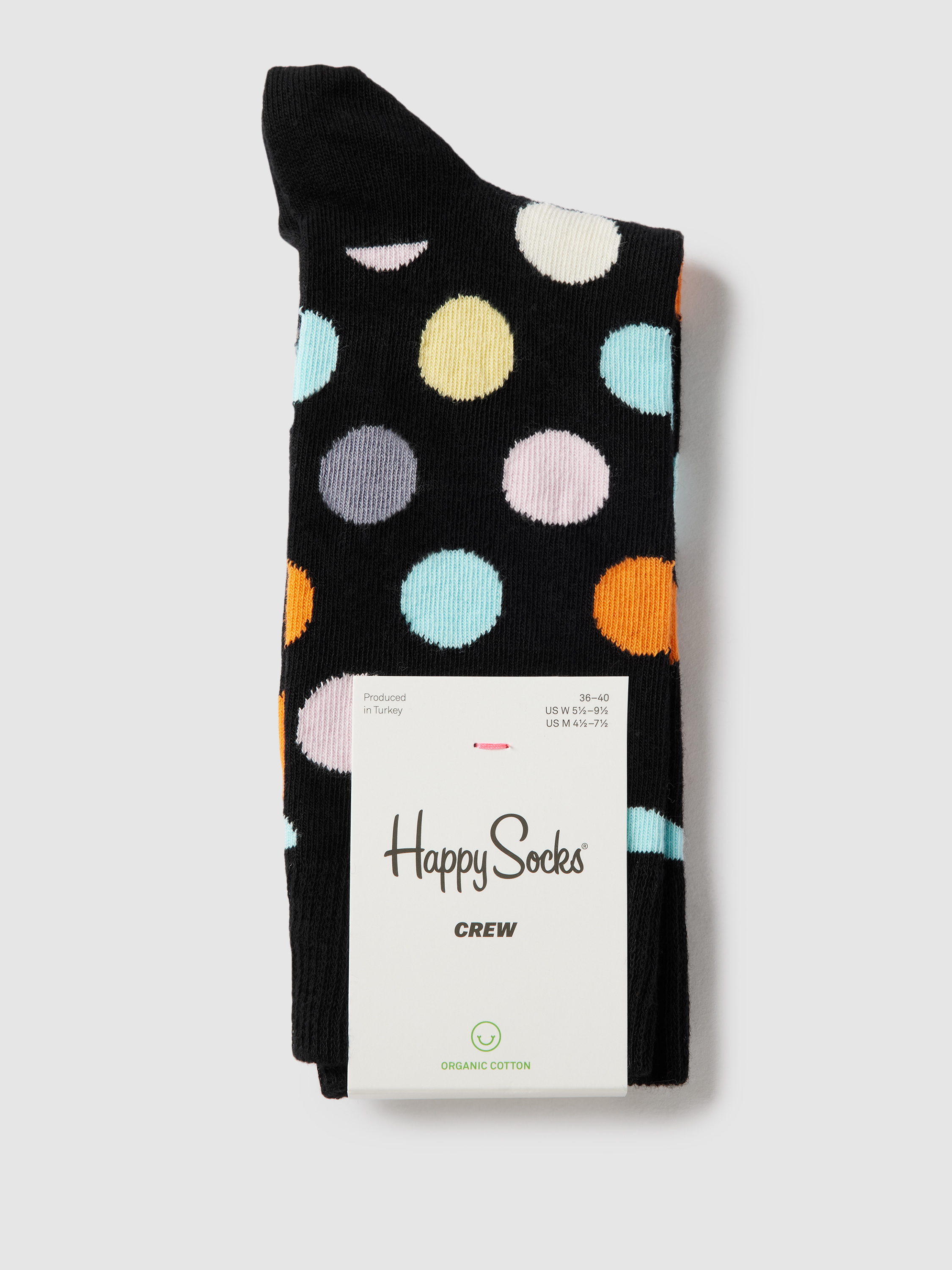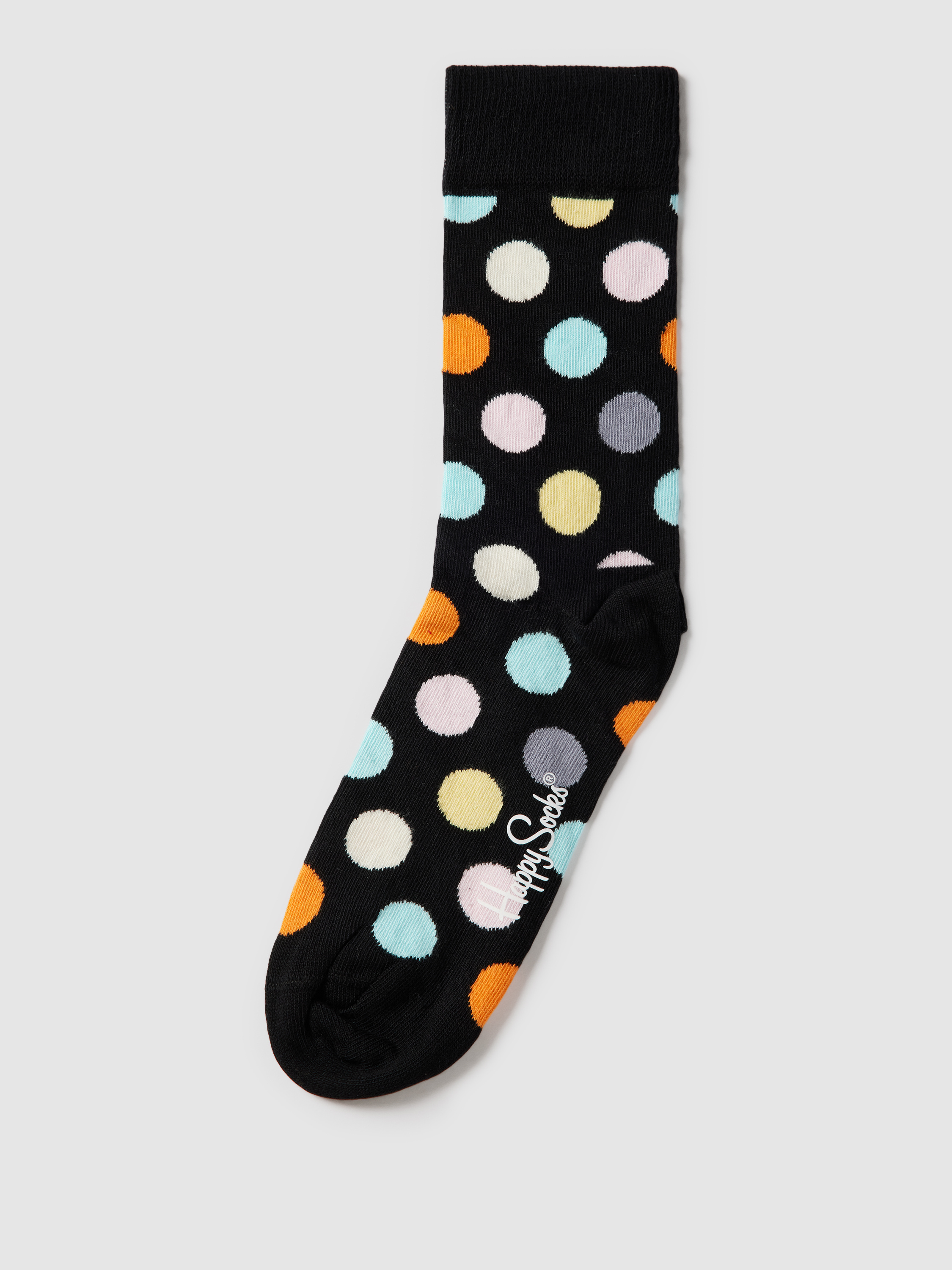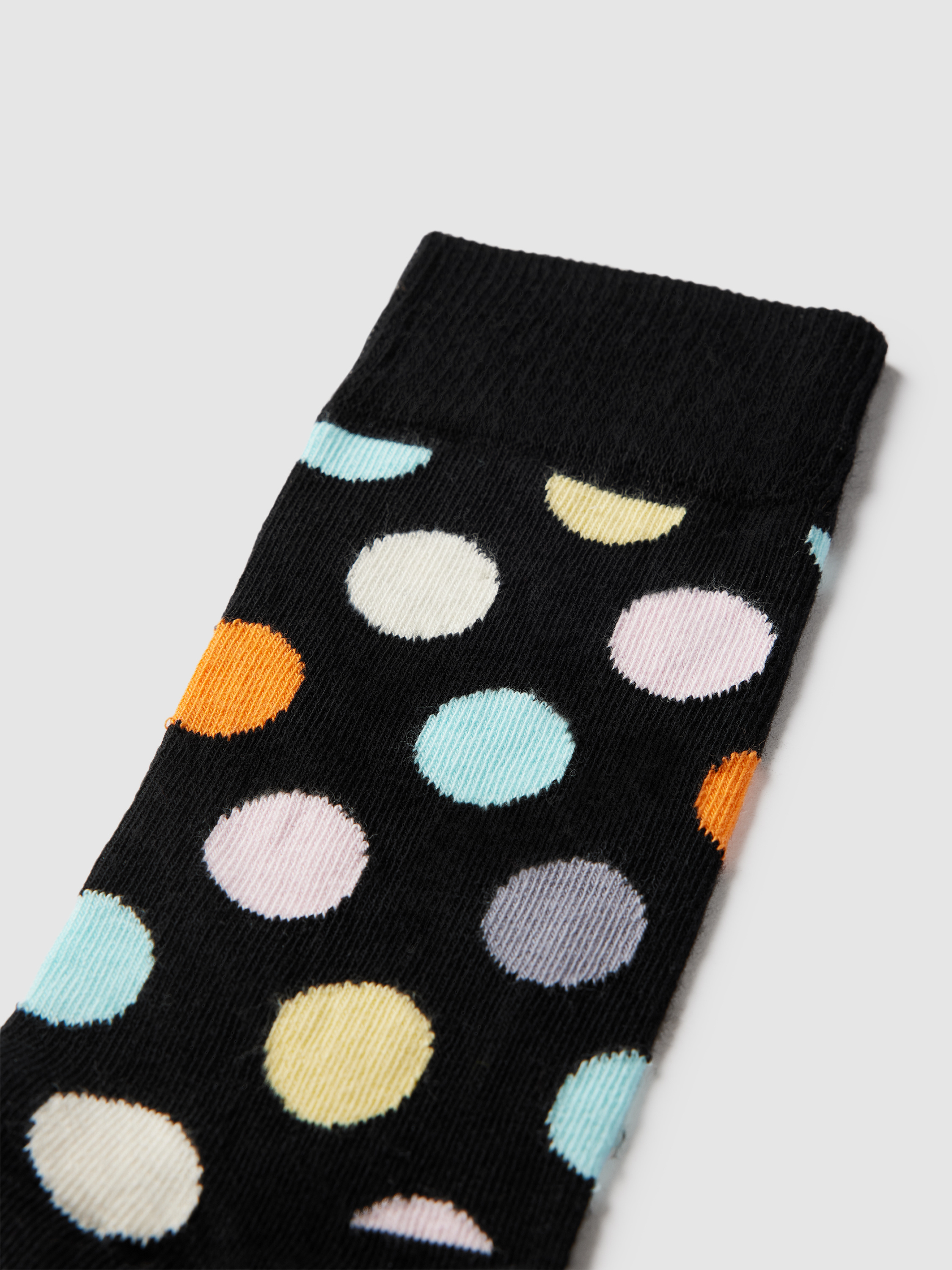 Die Socken von Happy Socks, Modell 'BIG DOT', vereinen einen angenehmen Baumwoll-Mix mit einem lebendigen Allover-Muster. Durch die kontrastiven Belastungszonen und Rippenbündchen bieten sie hohen Tragekomfort und zuverlässigen Halt. Dieses Design eignet sich hervorragend, um jedem Outfit eine fröhliche Note zu verleihen.